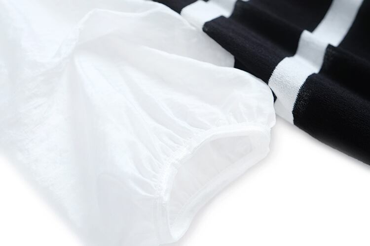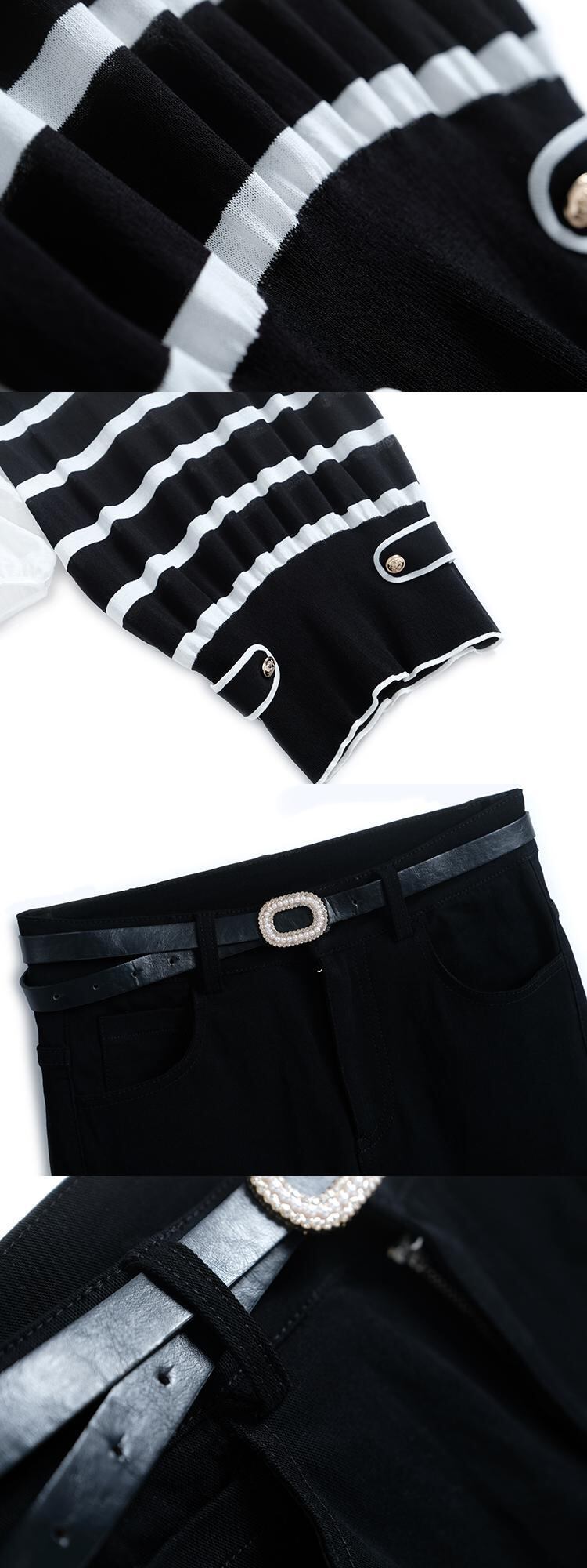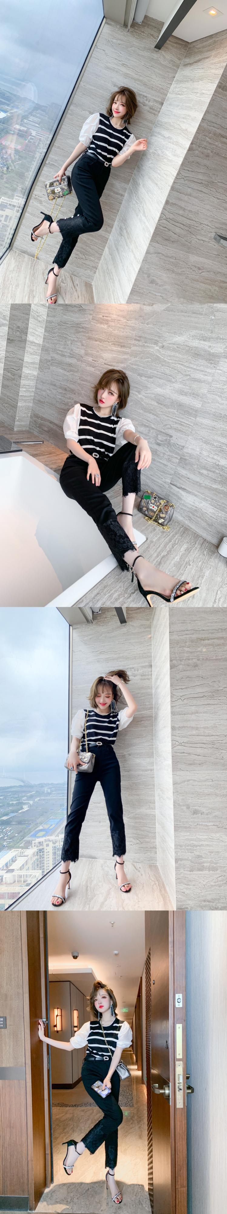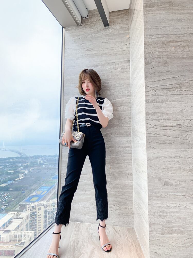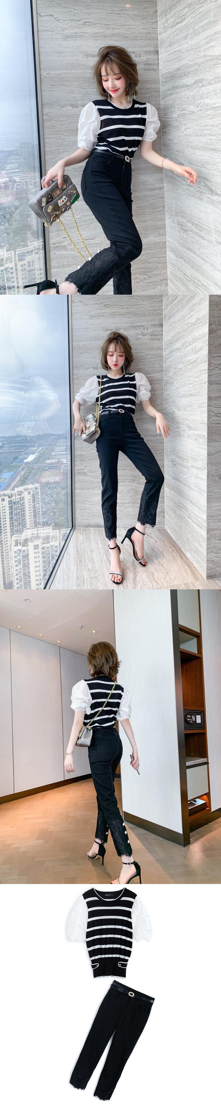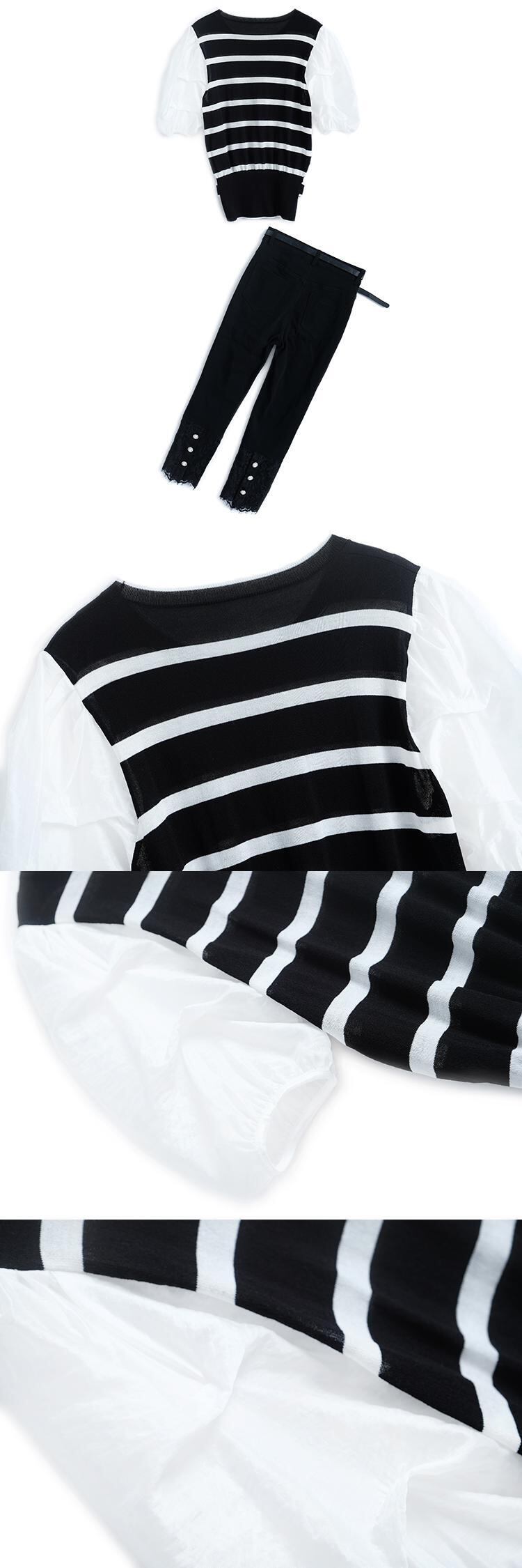 ストライプスリーブトップス レースウェストパンツ セット サマー 夏物 ステッチ MIUCO33310114434