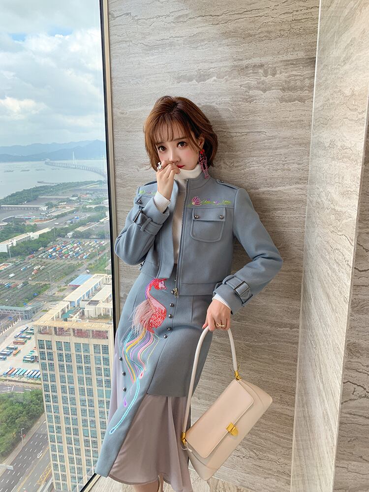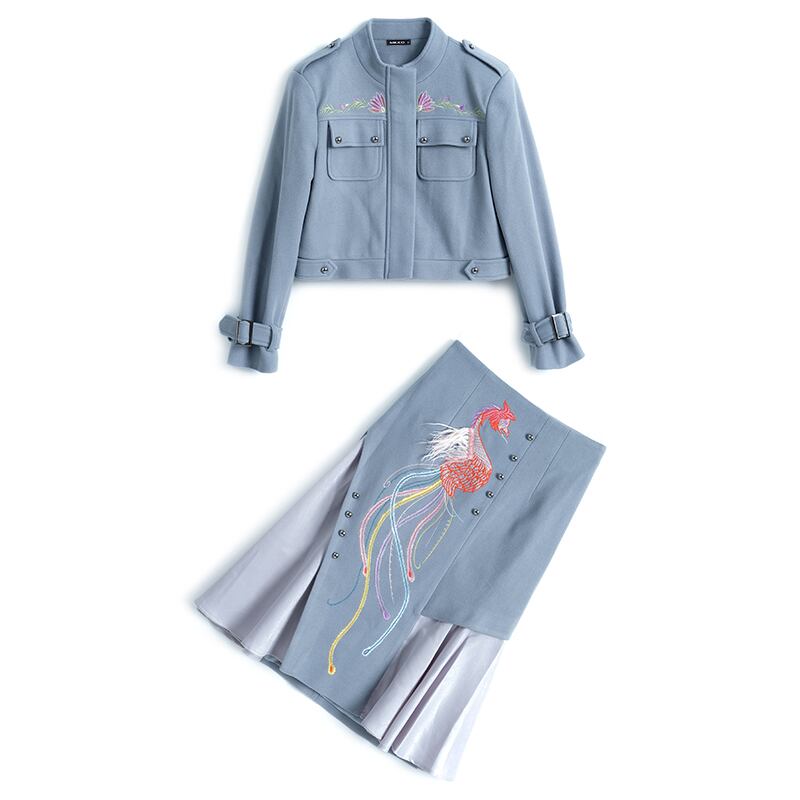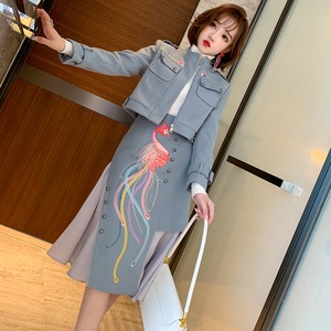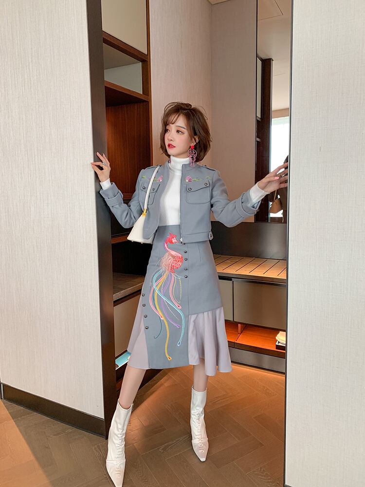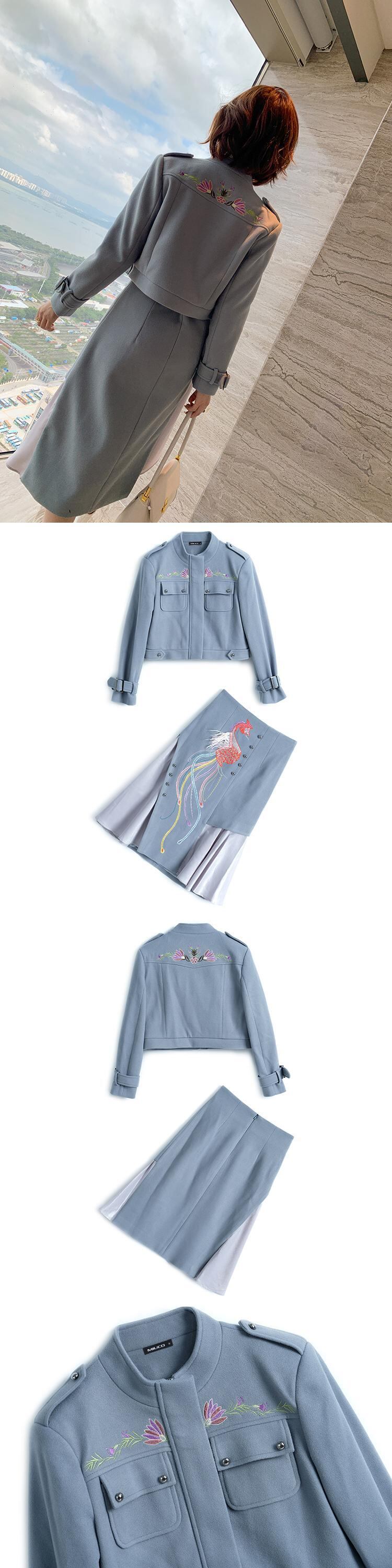 スタンドカラーカラーウェストショートトップス Aラインスカート セット レッド 刺繍 オータム 秋物 ウィンター 冬物 MIUCO70027885119