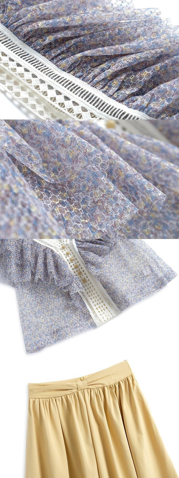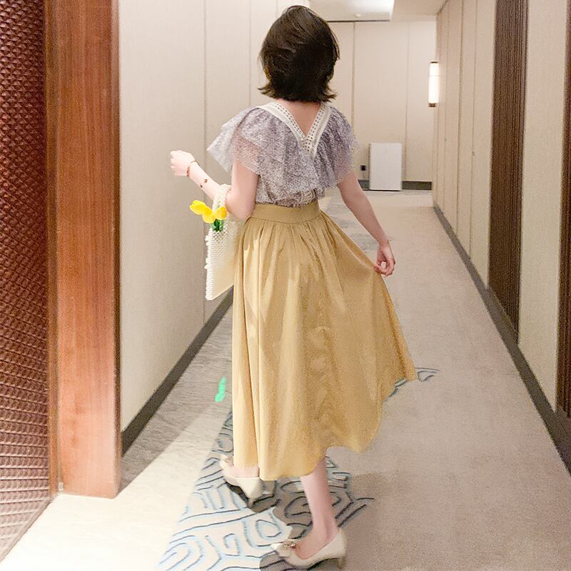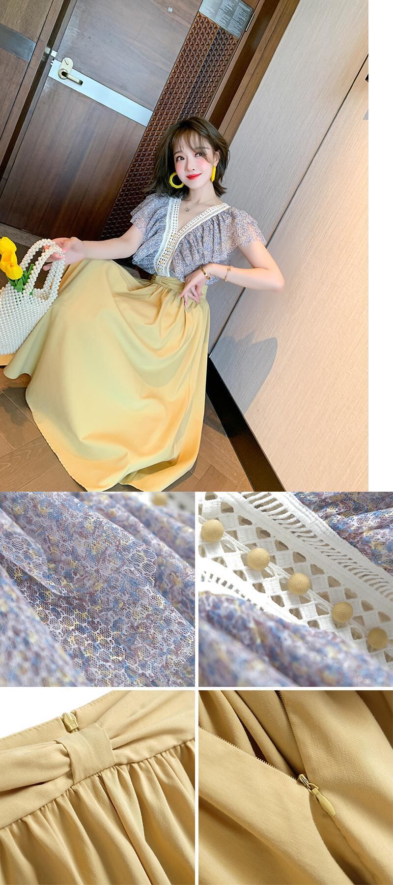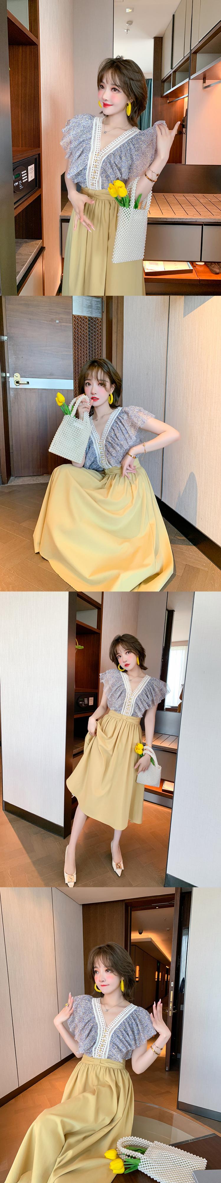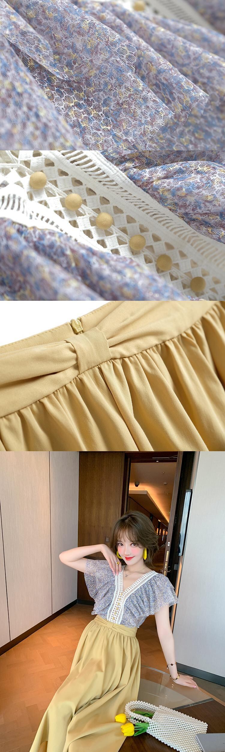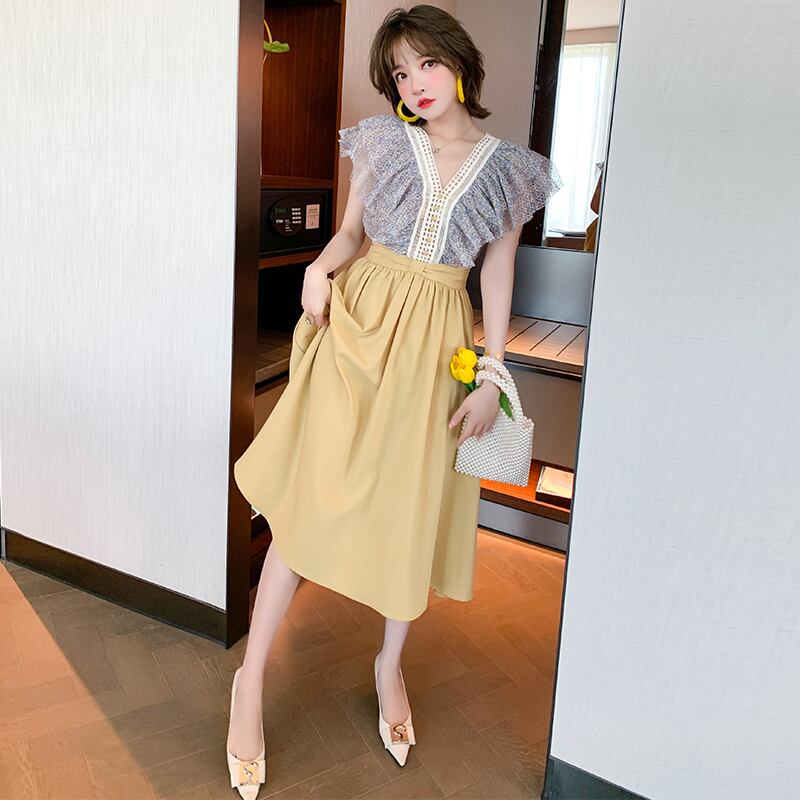 レースVネックシャツ ハイウェストスカート サマー 夏物 ソリッドカラー MIUCO62899158479