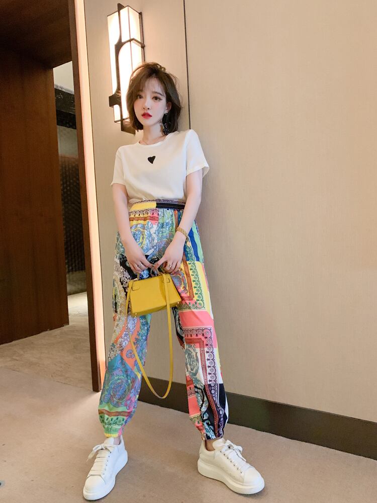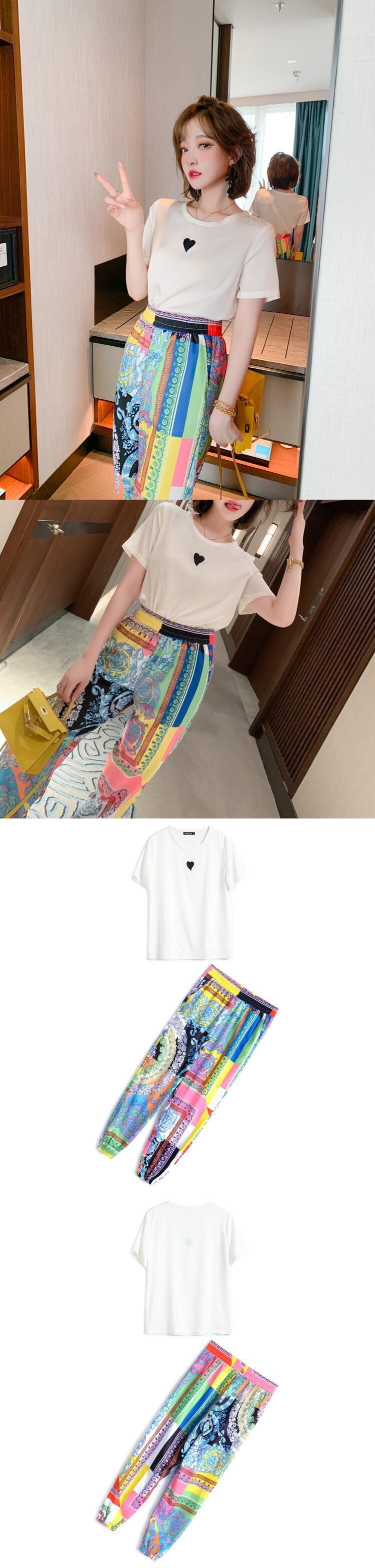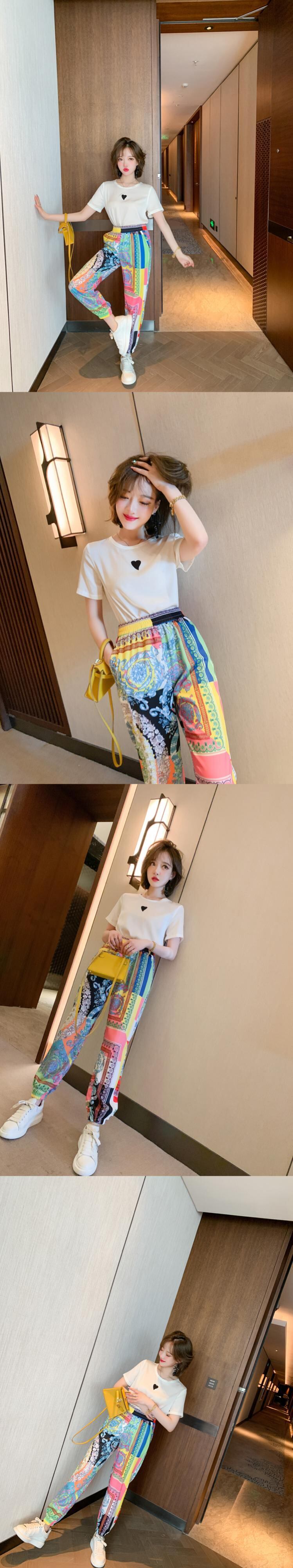 ラウンドネックTシャツ スタンダードプリントパンツ レッド レトロ 刺繍 エラスティック 伸縮 Oネック MIUCO33619350773