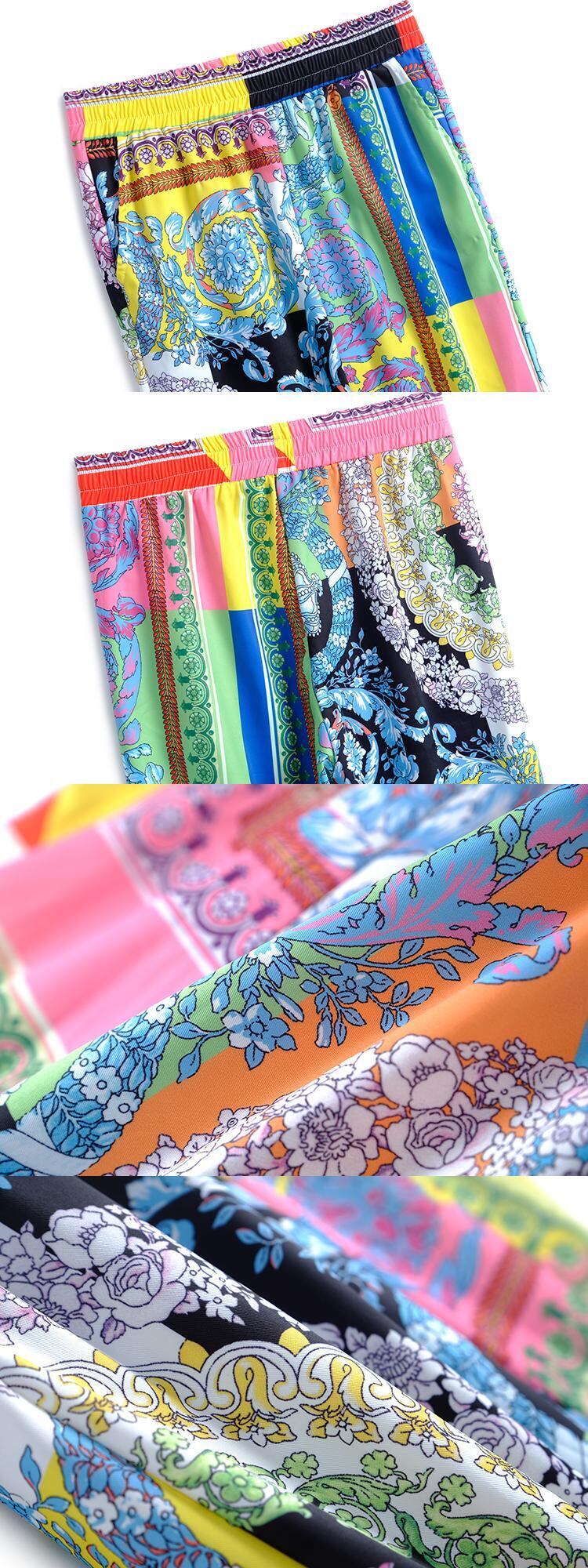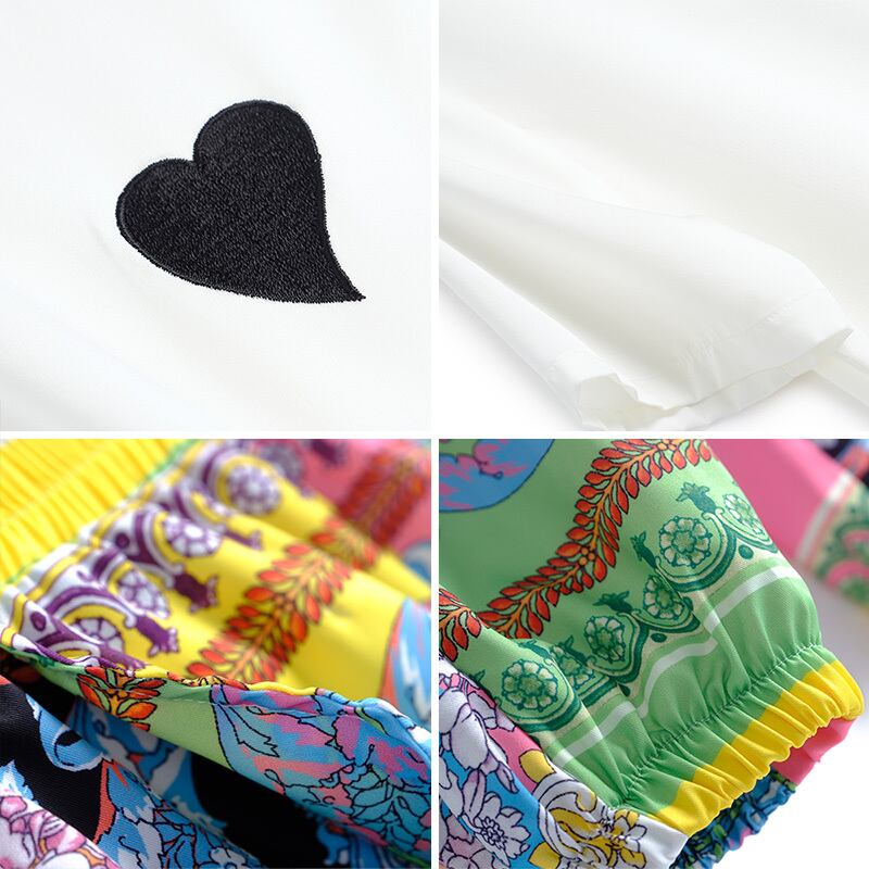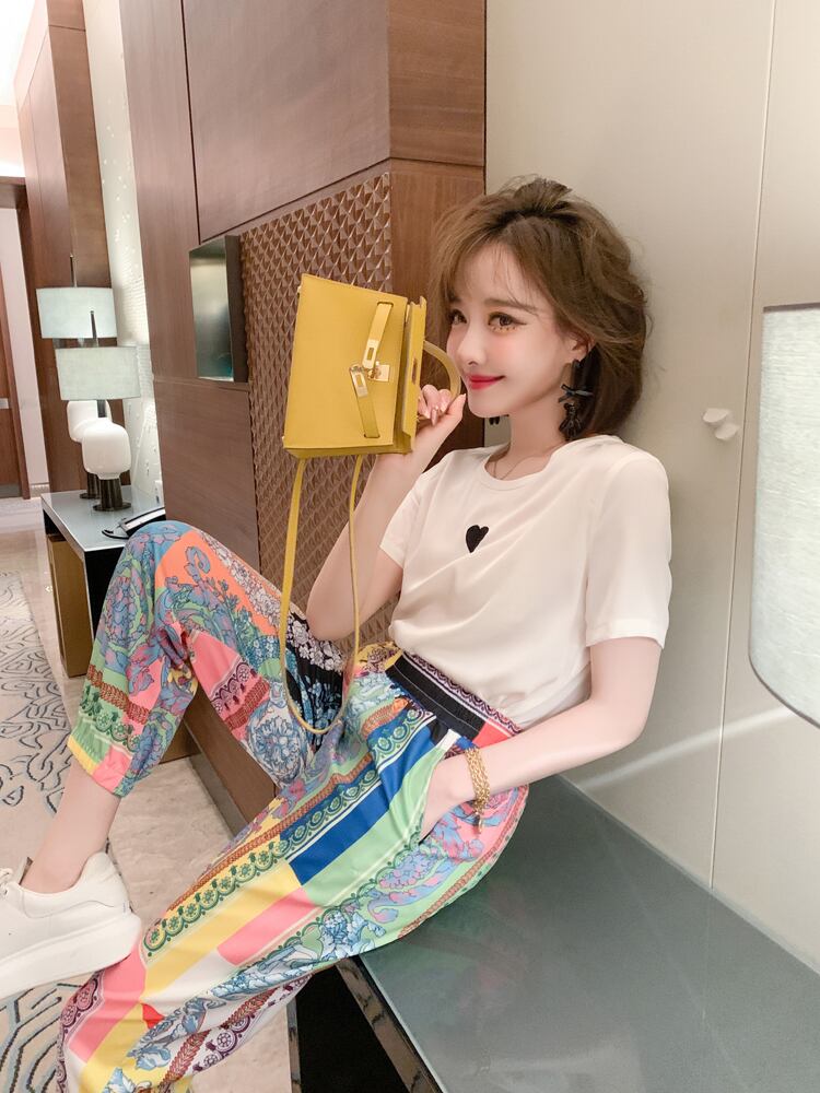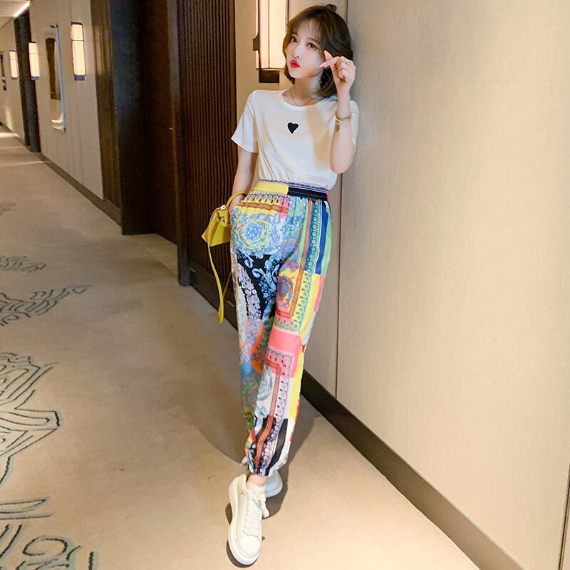 ラウンドネックTシャツ スタンダードプリントパンツ レッド レトロ 刺繍 エラスティック 伸縮 Oネック MIUCO33619350773