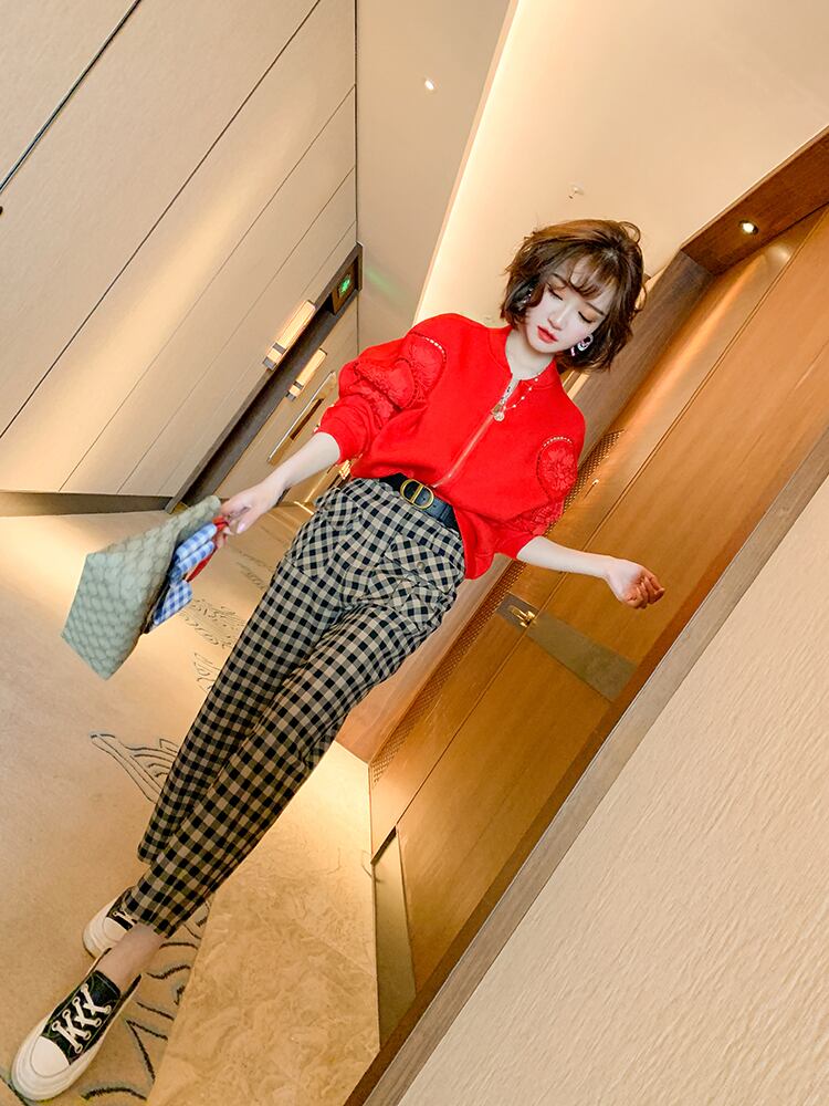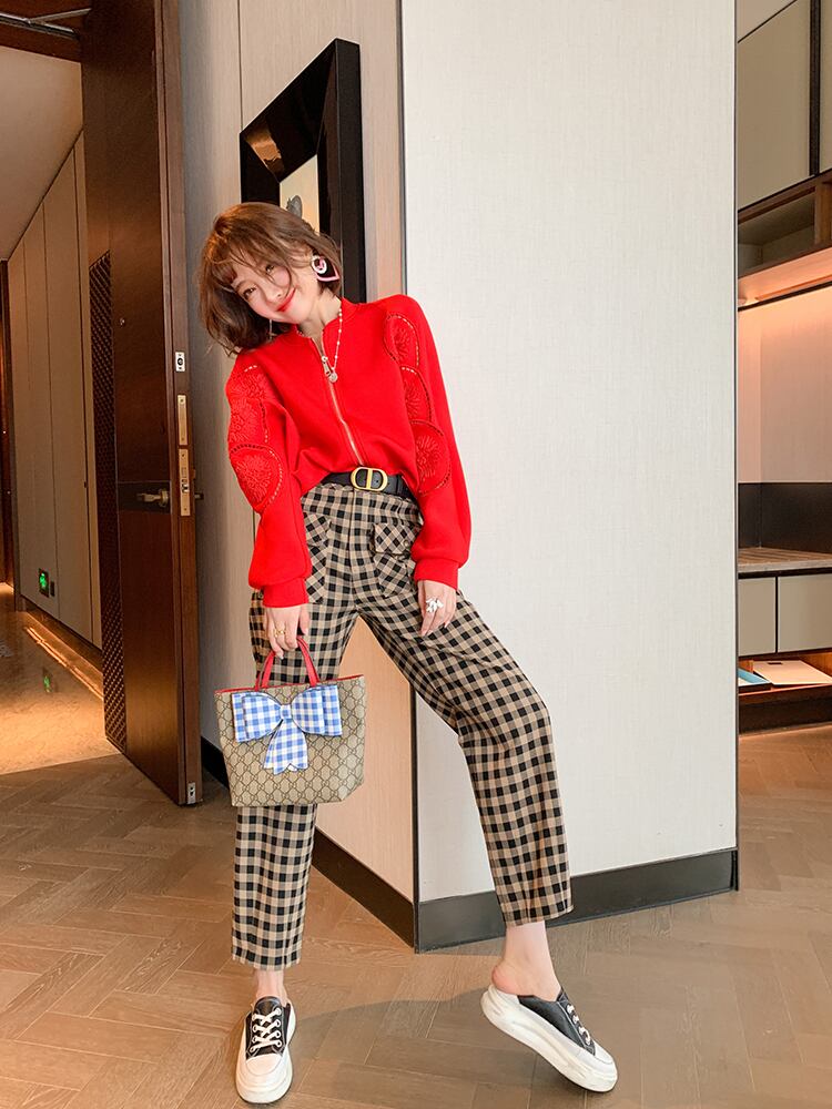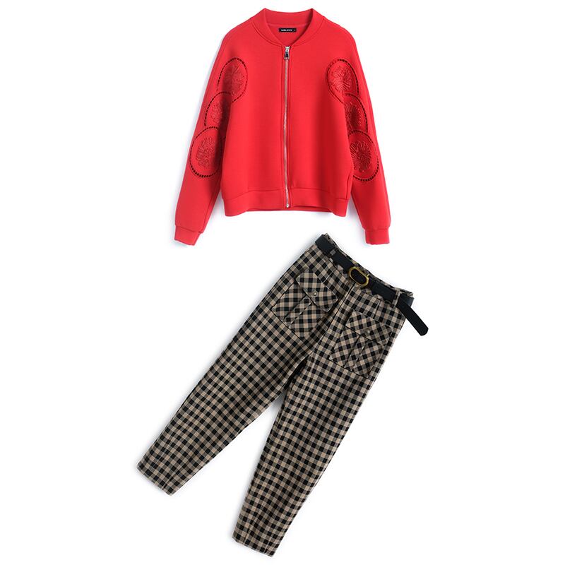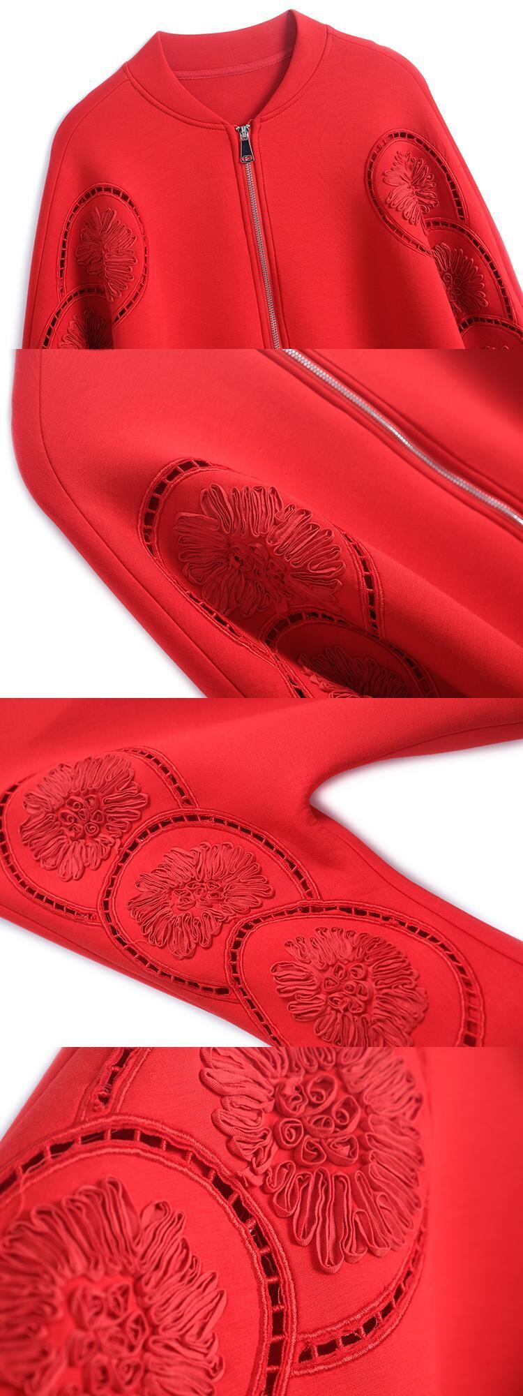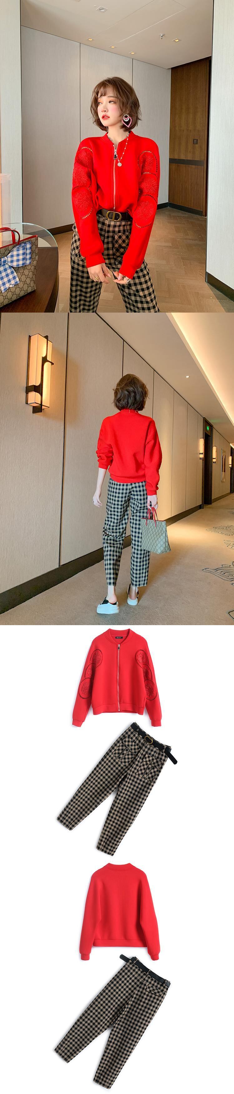 Flowerデザイン ジッパースタンダードパンツ セット オータム レッド レトロ 刺繍 秋物 フラワーデザイン MIUCO10857188862