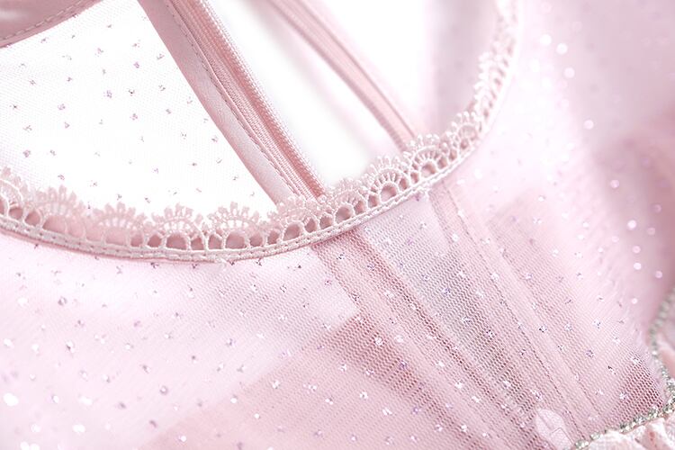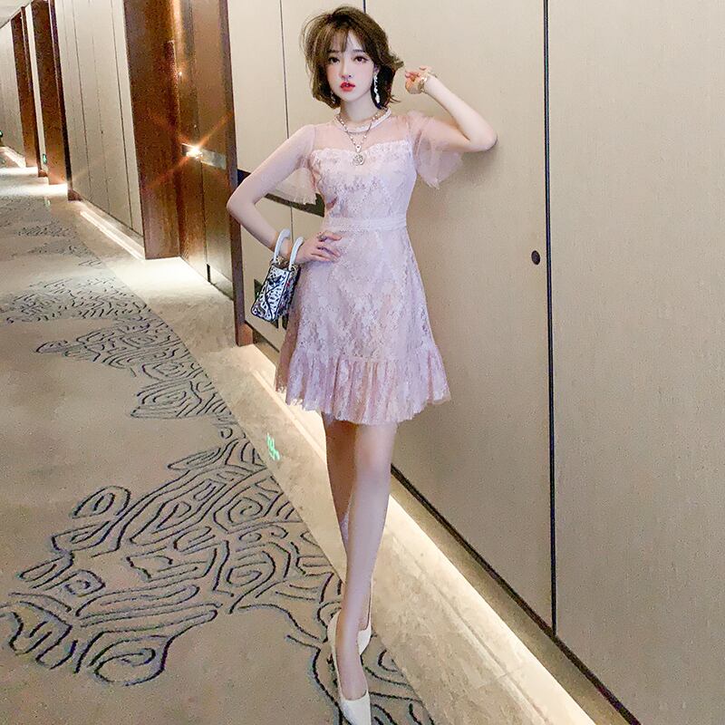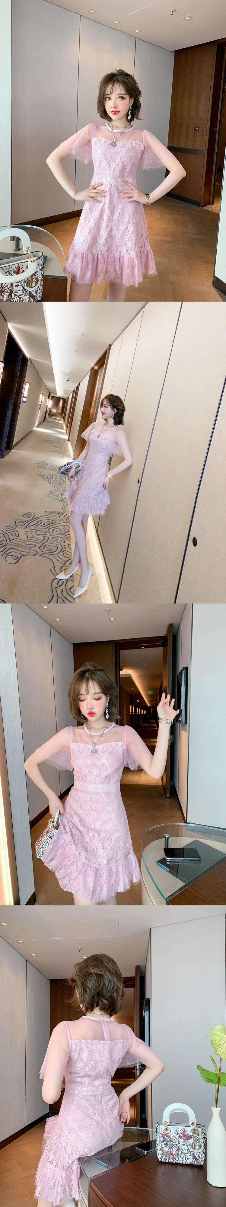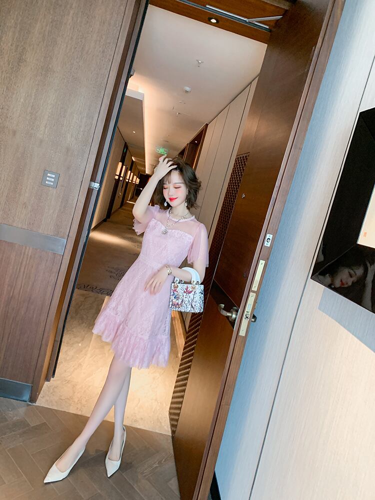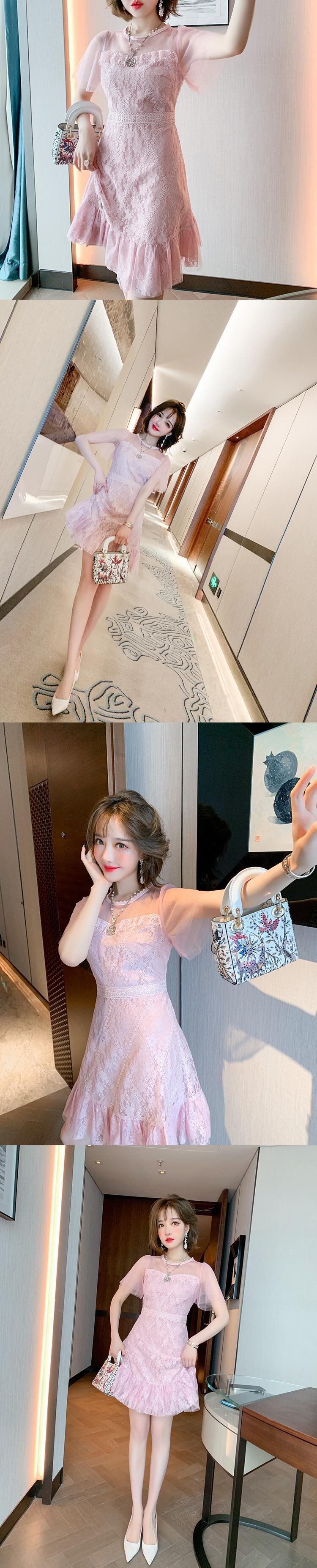 レースラウンドネックメッシュウェストドレス サマー 夏物 Oネック ステッチ MIUCO3974583342