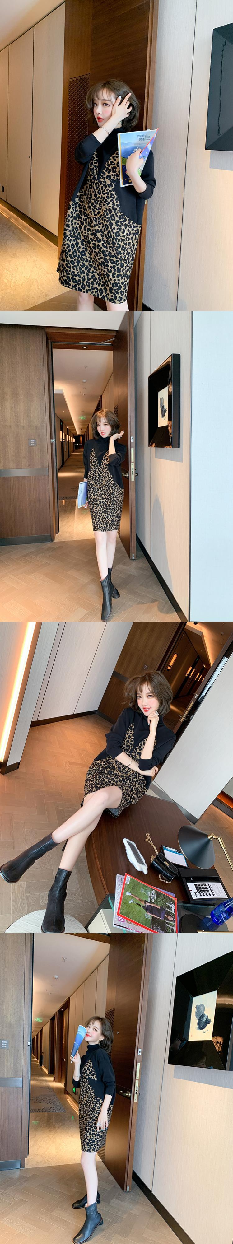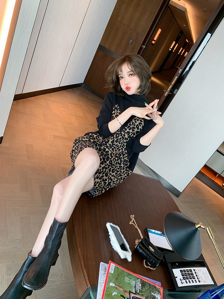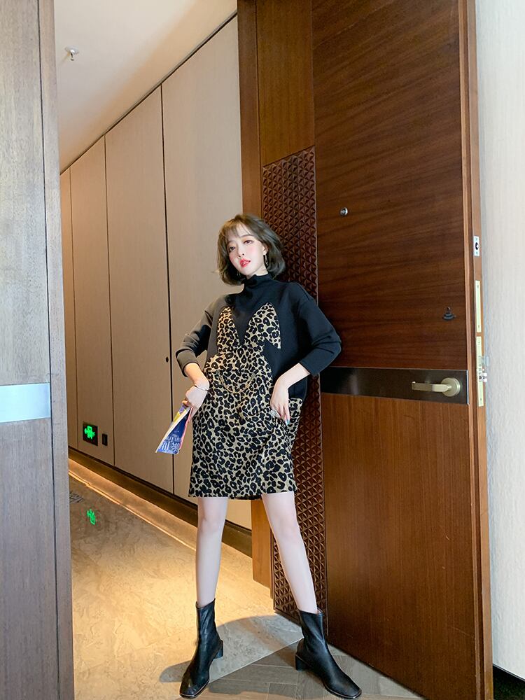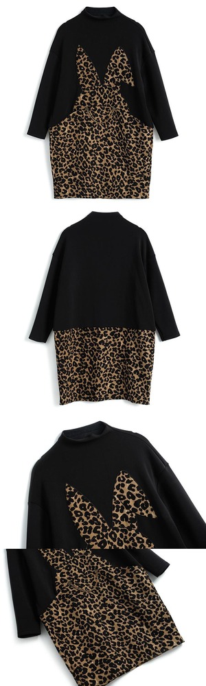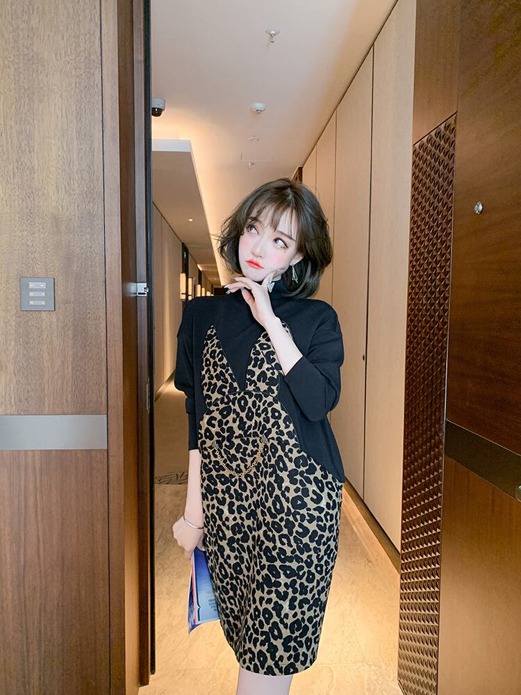 カラーレオパードプリント柄ルーズセーター ドレス オータムウィンター コットン 秋物 冬物 ステッチ MIUCO25906781326