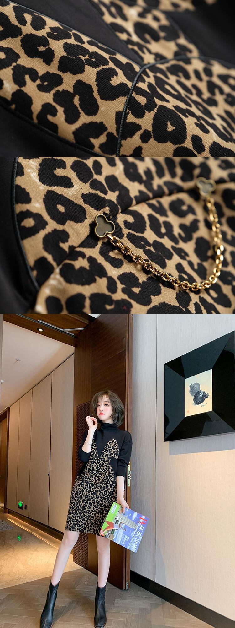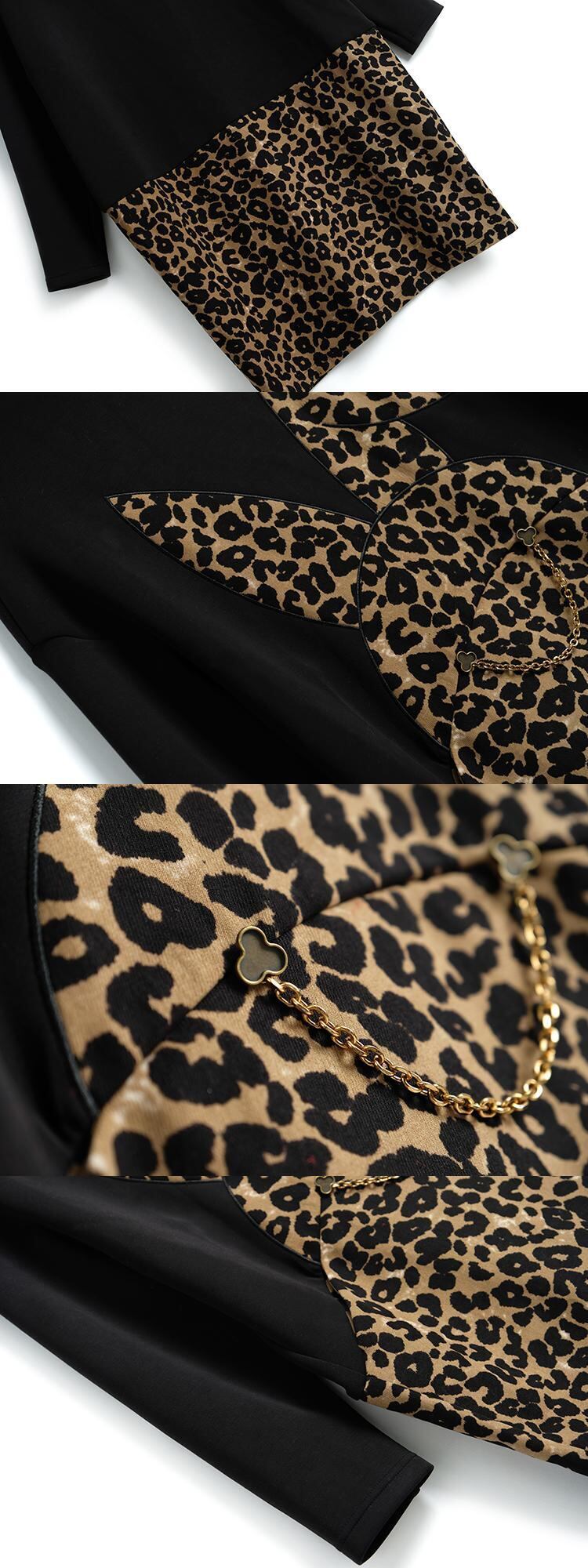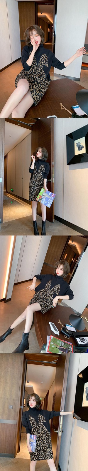 カラーレオパードプリント柄ルーズセーター ドレス オータムウィンター コットン 秋物 冬物 ステッチ MIUCO25906781326