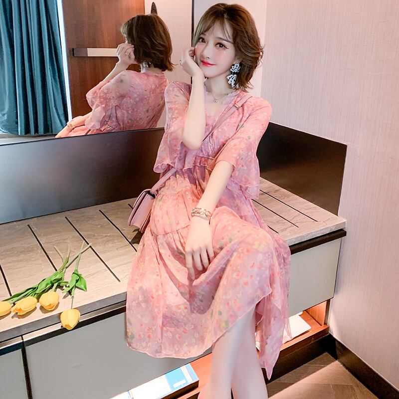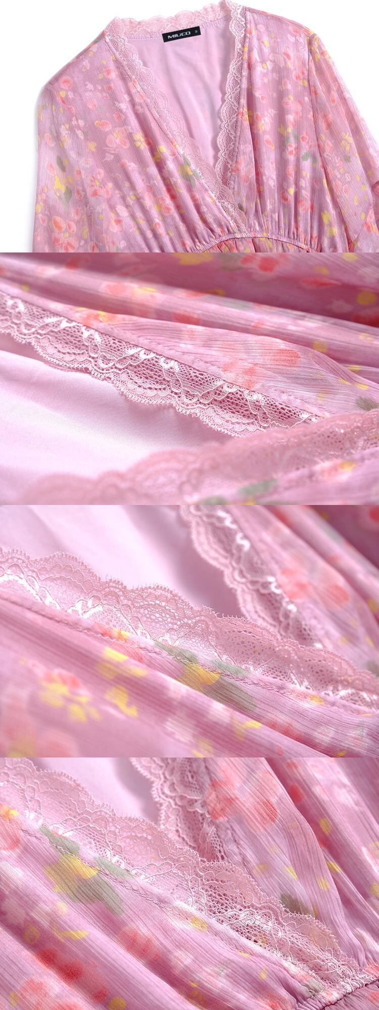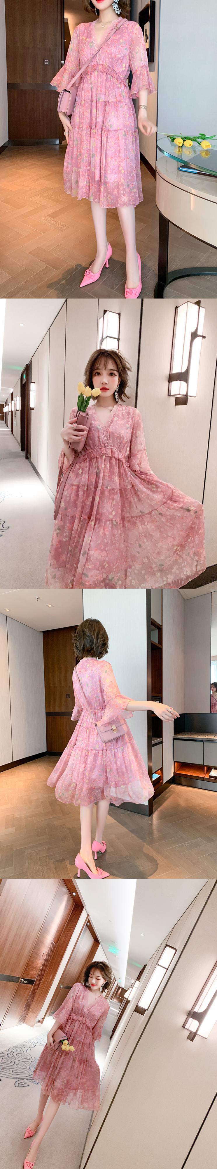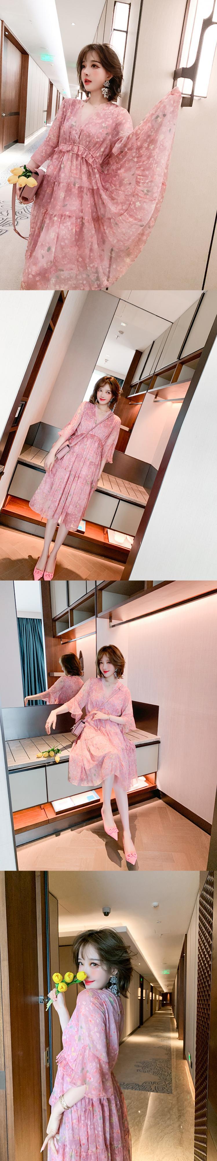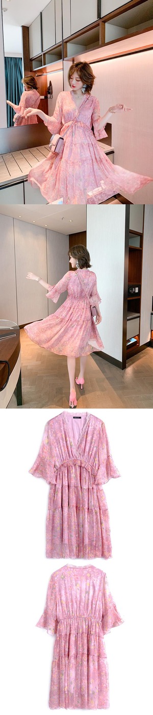 Vネックレーススリーブプリント柄ドレス サマー レッド 夏物 シルク ステッチ MIUCO93099077232