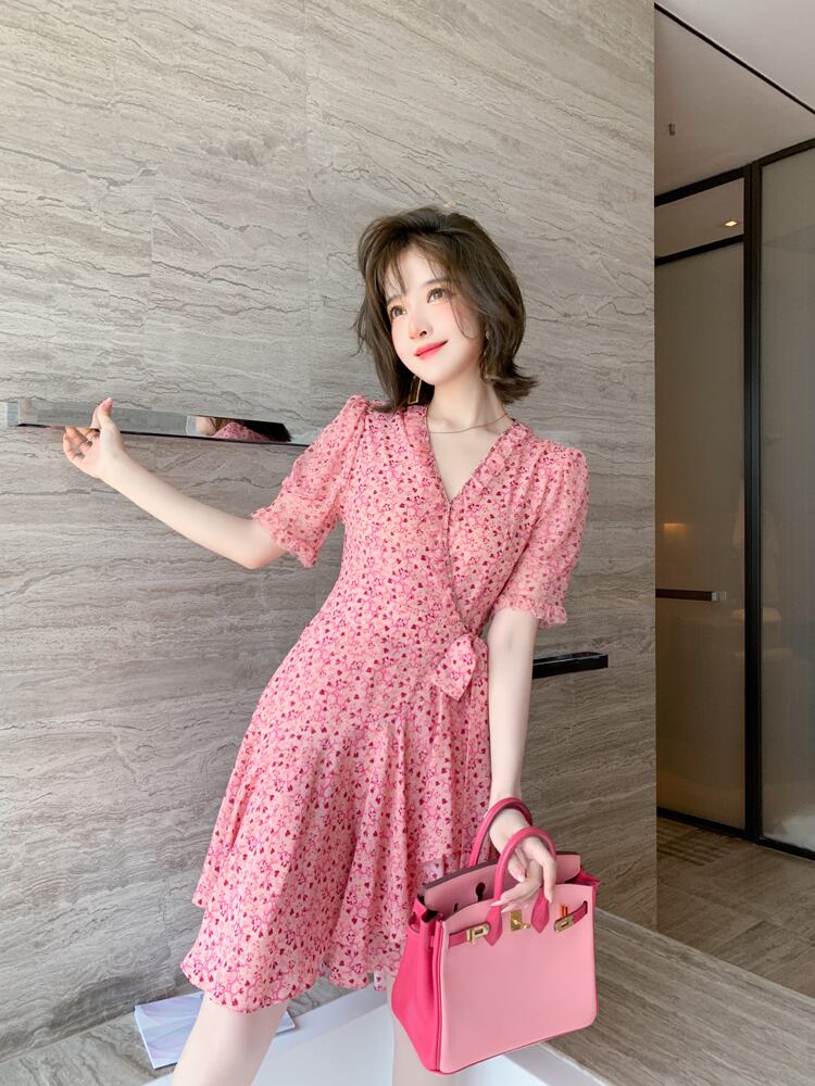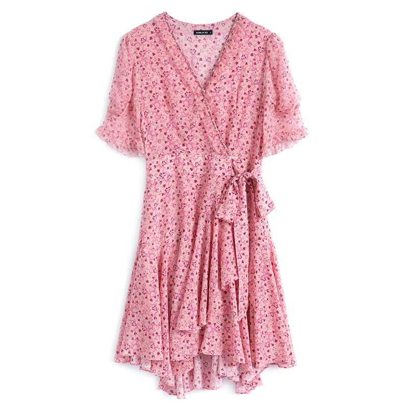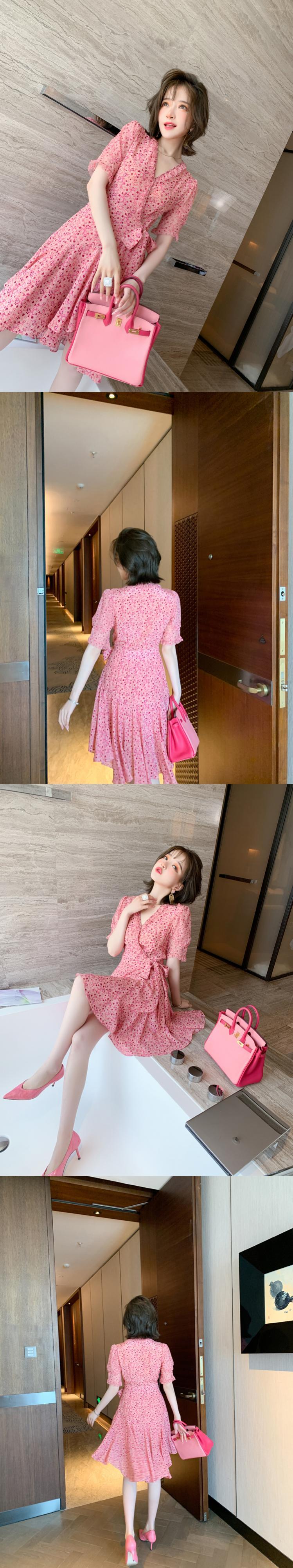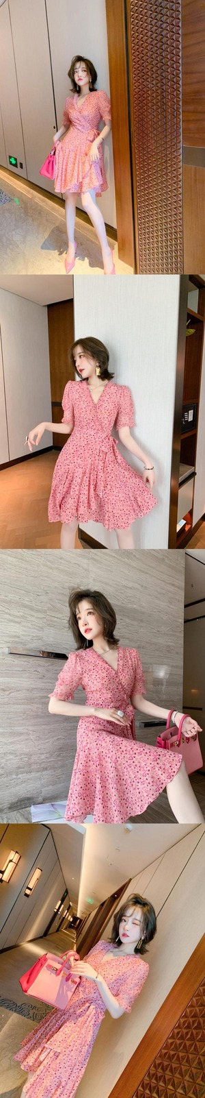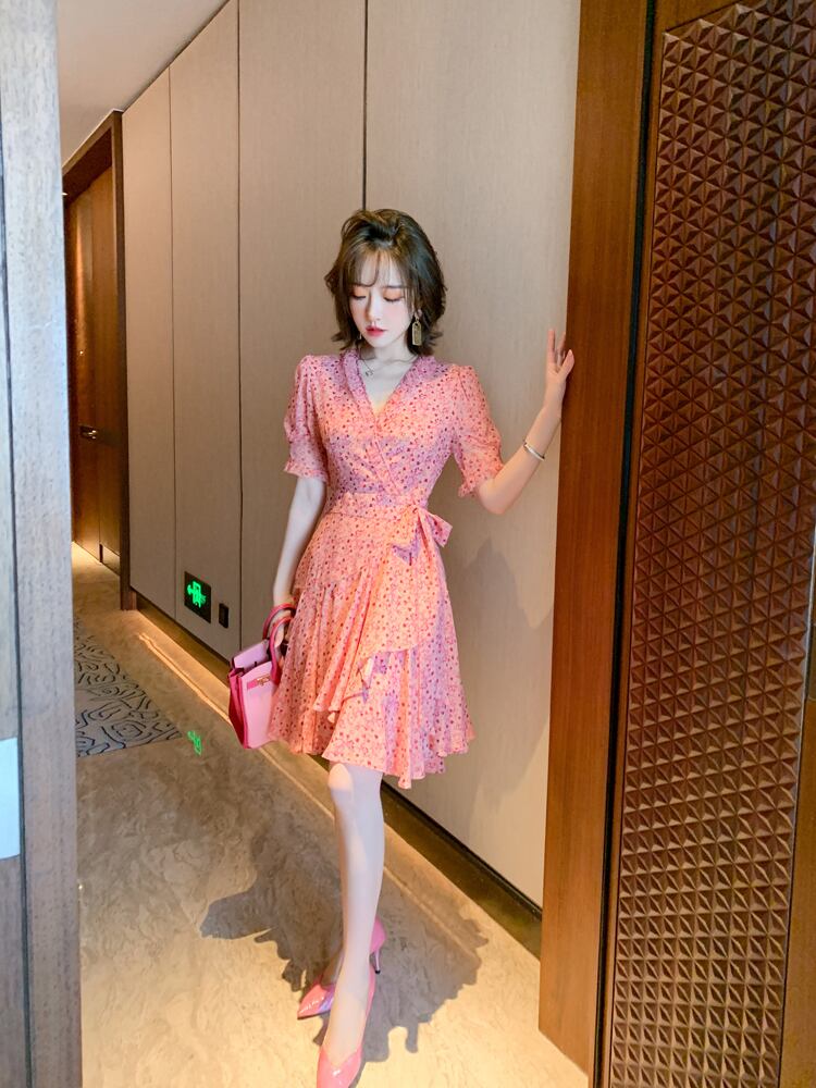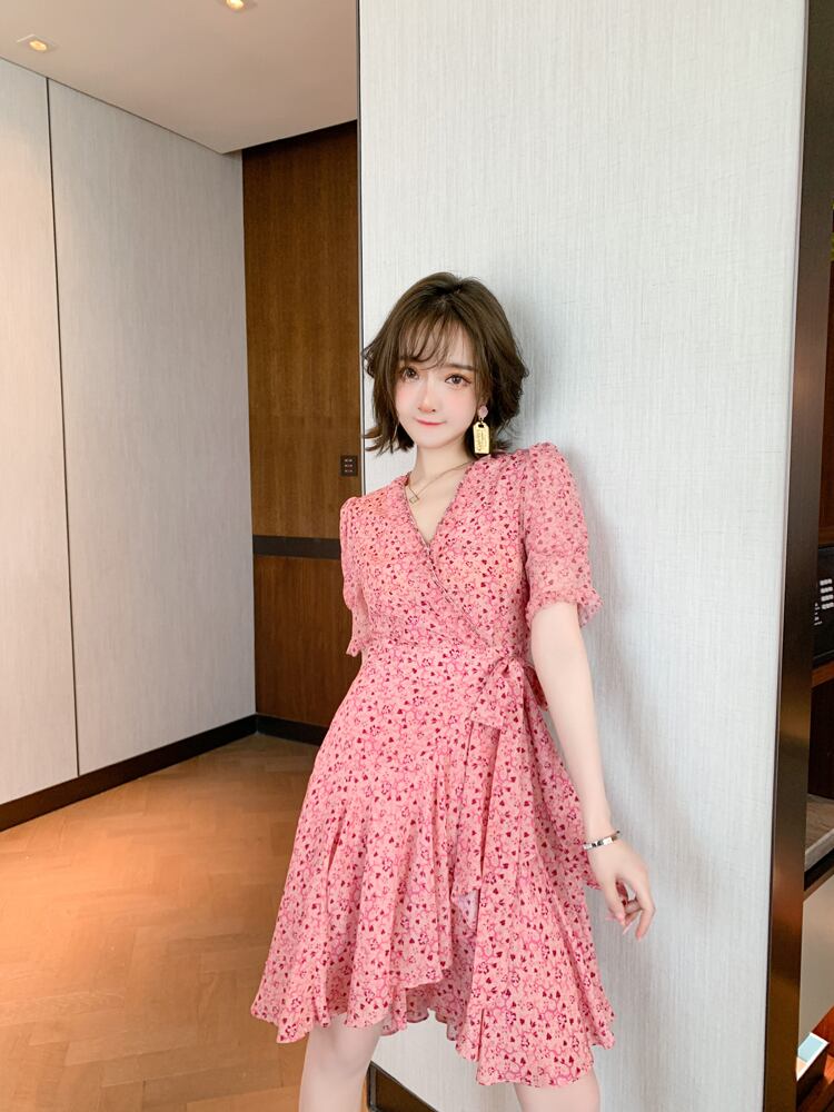 Vネックレースウェストプリントドレス サマー 夏物 MIUCO81669713808