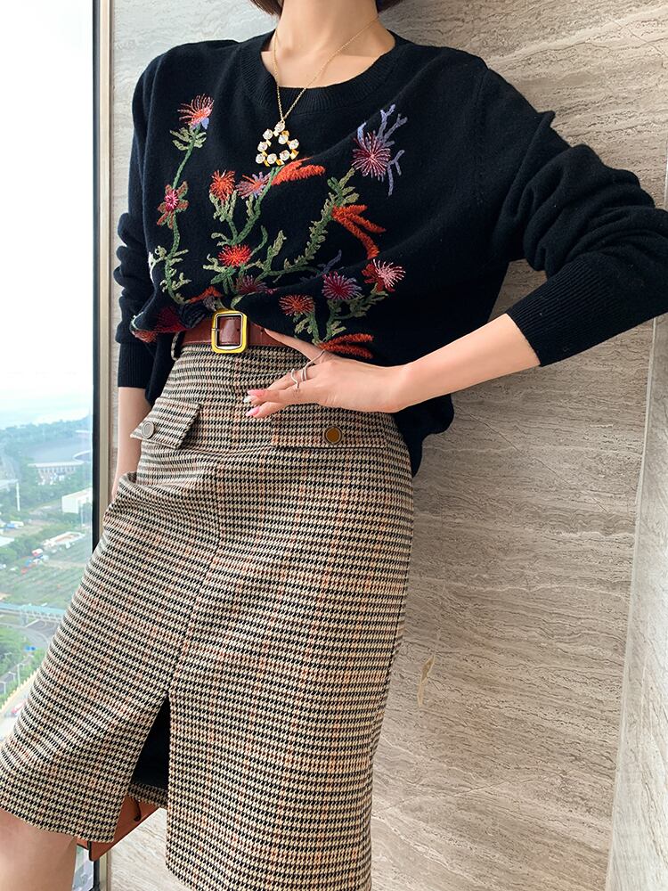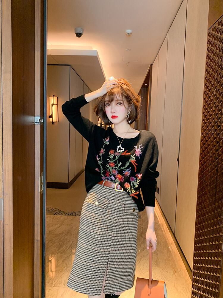 パターンラウンドネックルーズ薄手ニットセーター レッド 刺繍 オータム 秋物 ウィンター 冬物 Oネック MIUCO76868371293
