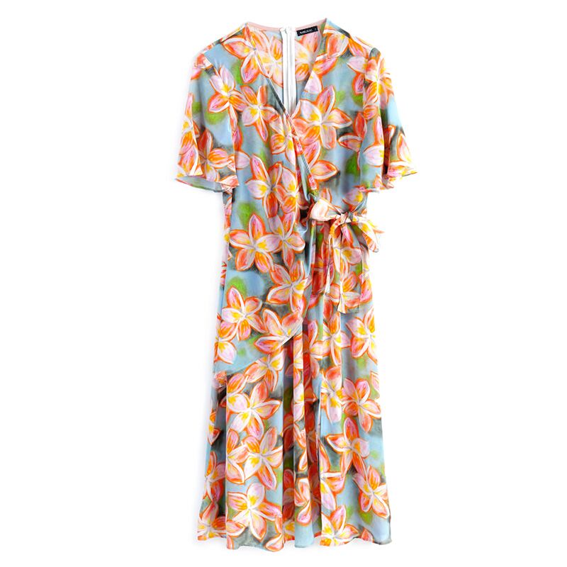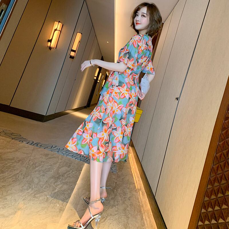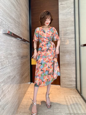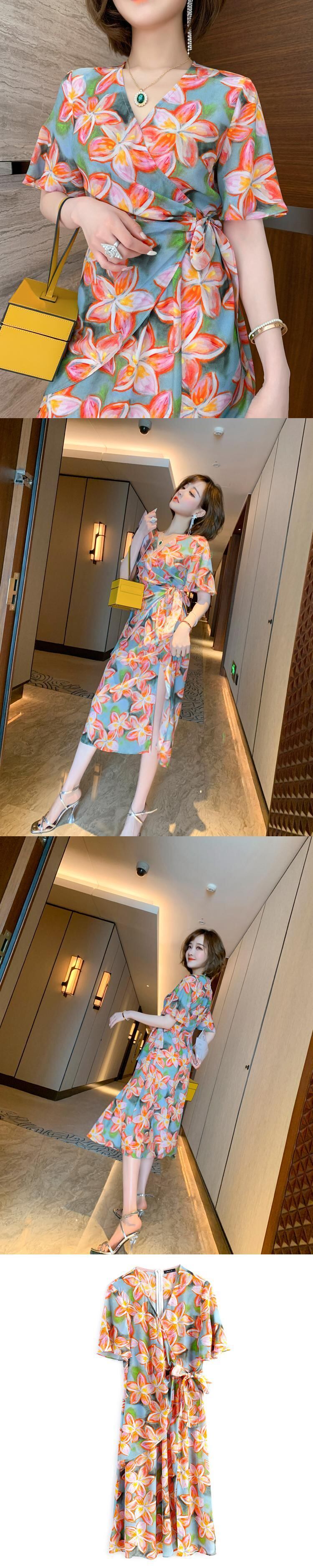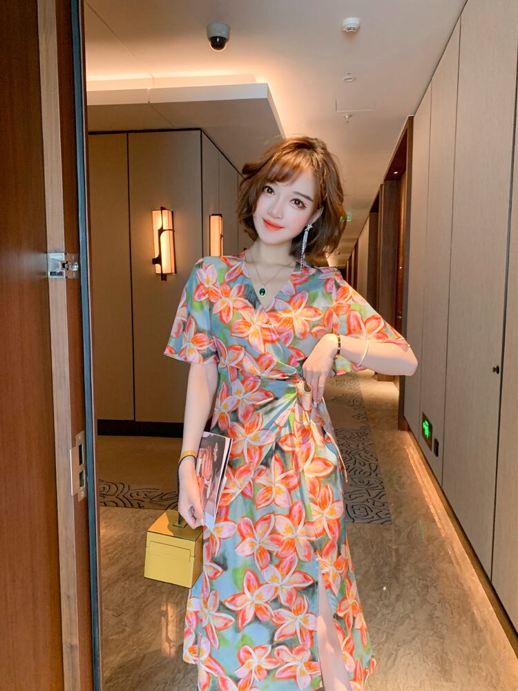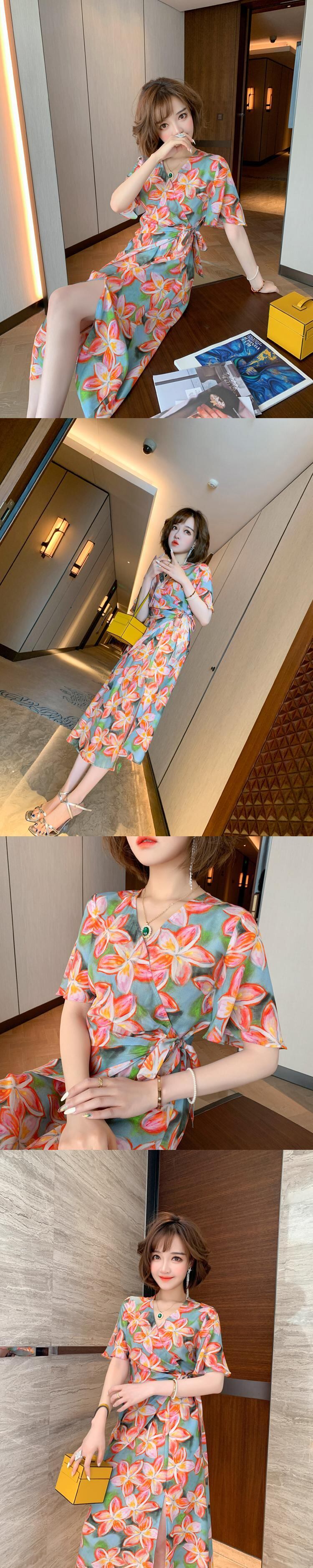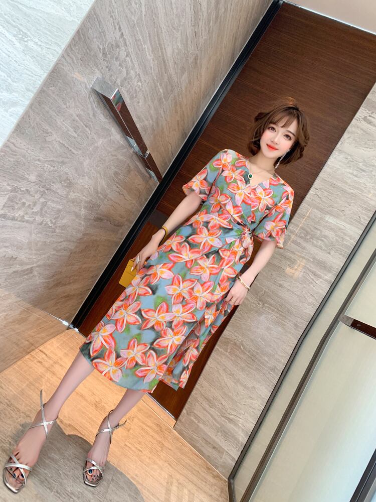 クロスレースプリント柄半袖スリーブウェスト薄手ドレス サマー ショート ハーフスリーブ 夏物 MIUCO15238582494