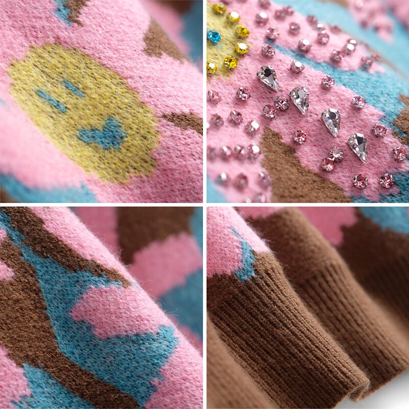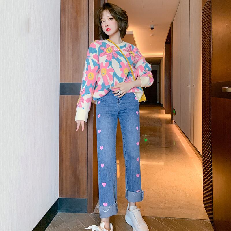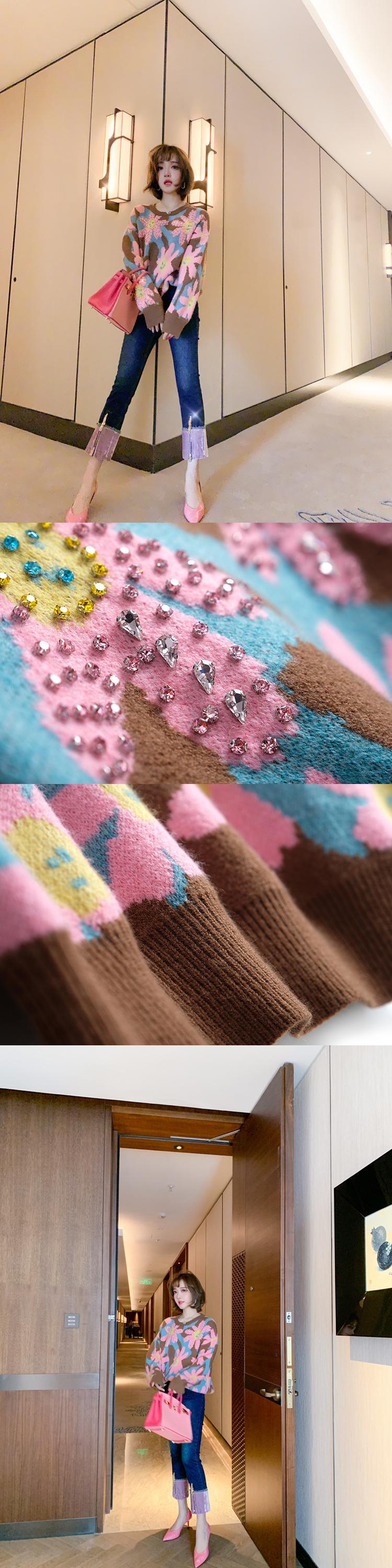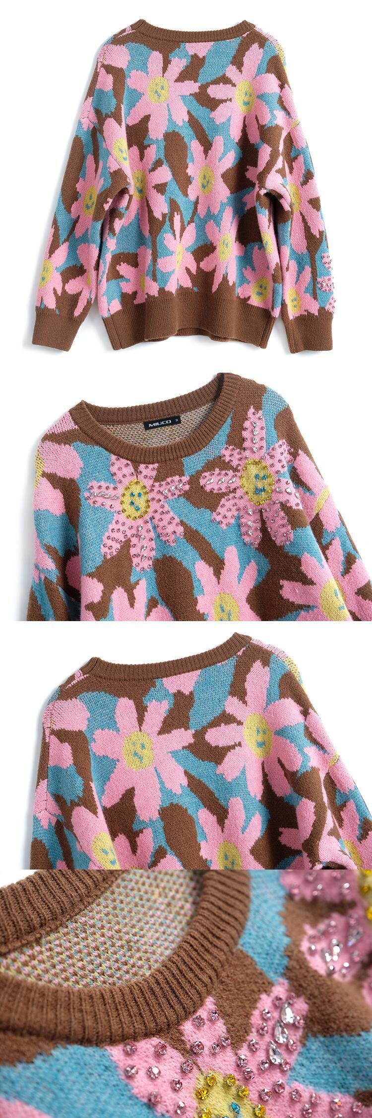 ラウンドネックルーズFlowerデザイン ジャカードニットセーター レディースウィンター 冬物 Oネック フラワーデザイン MIUCO96651897462