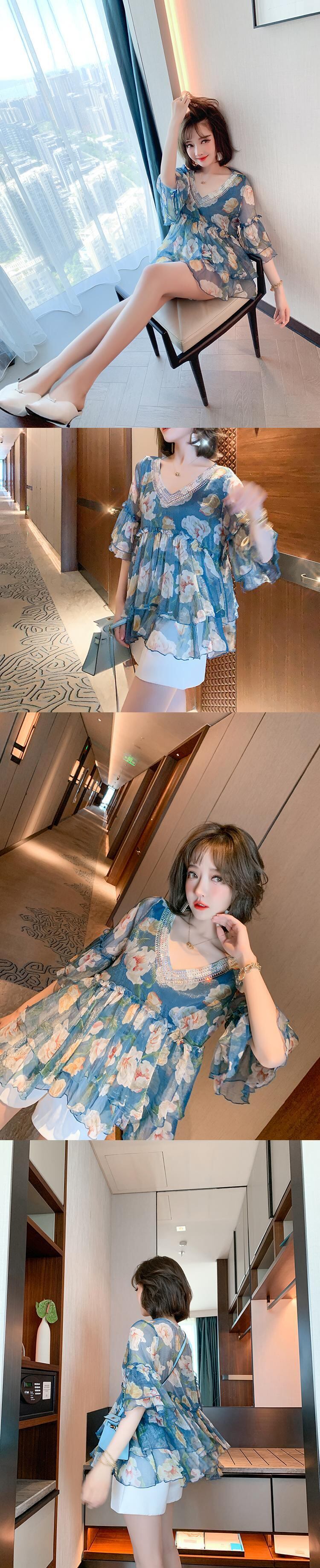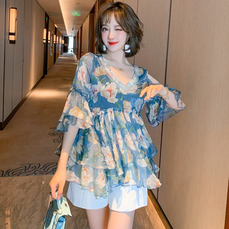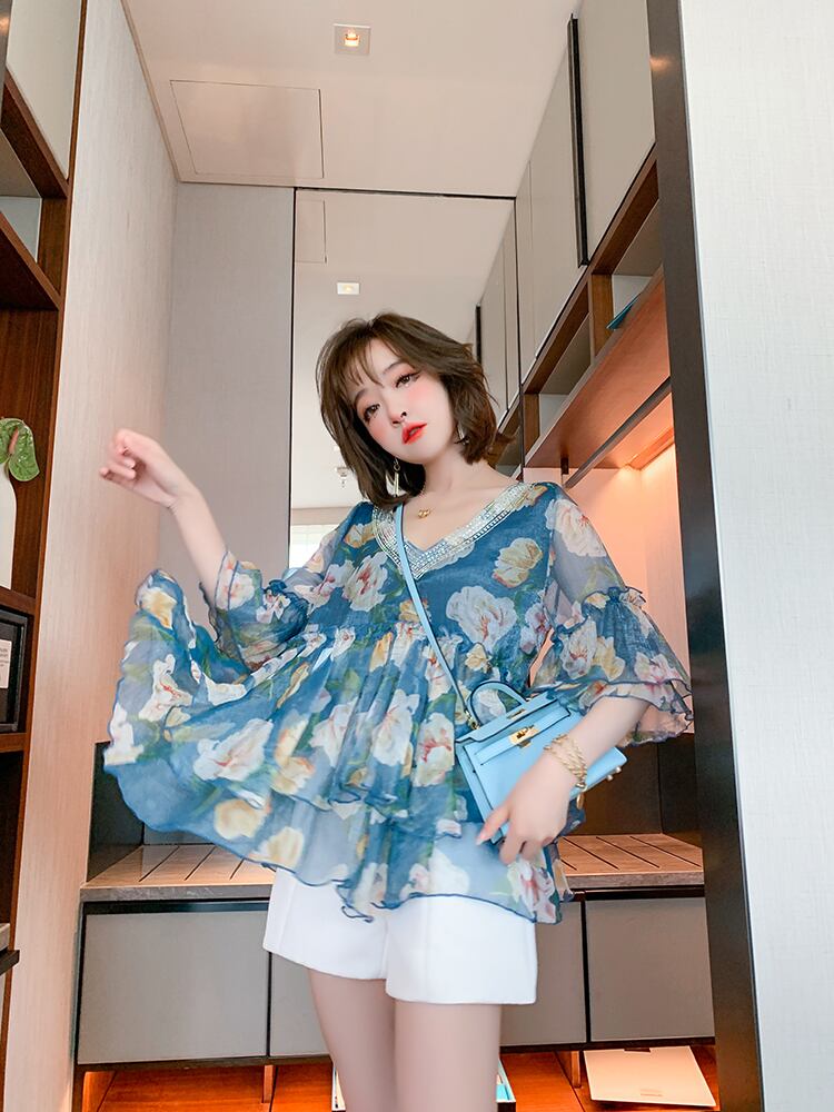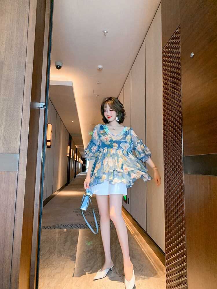 Vネックプリント柄ブラウス ハイウェストショーツ スプリングサマー 春物 夏物 ブルマー MIUCO8386665476