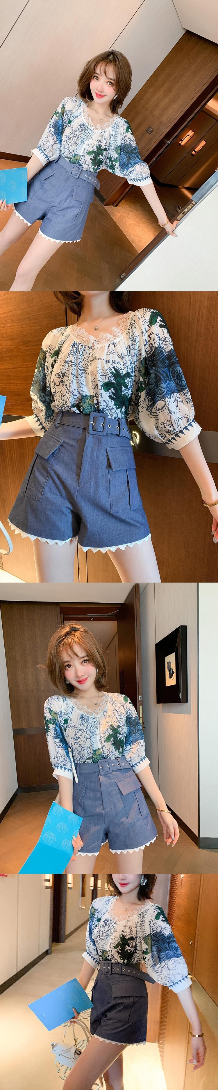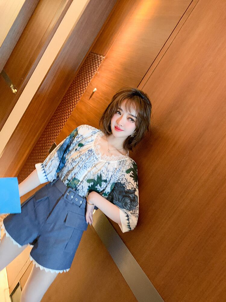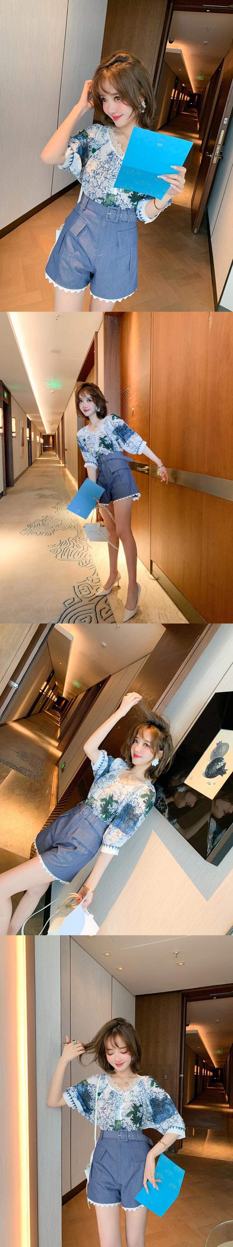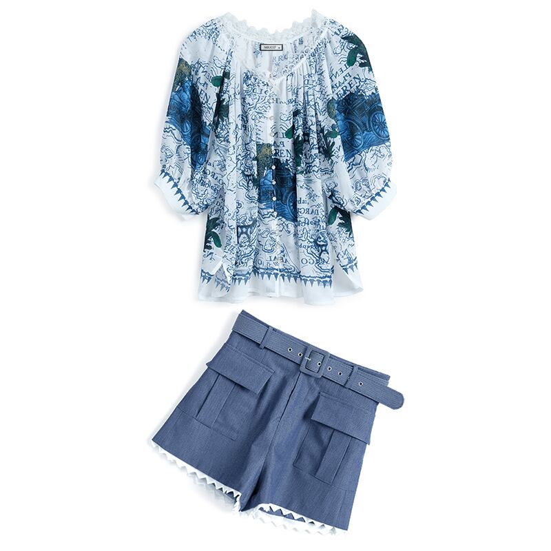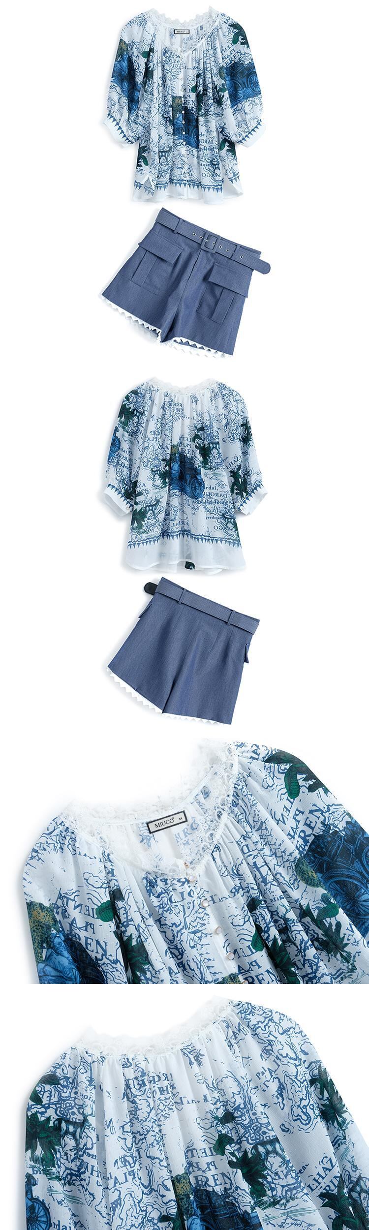 プリントプリーツシャツ レースハイウェストウェストショーツ レッド レトロ 刺繍 ブルマー MIUCO45975915380