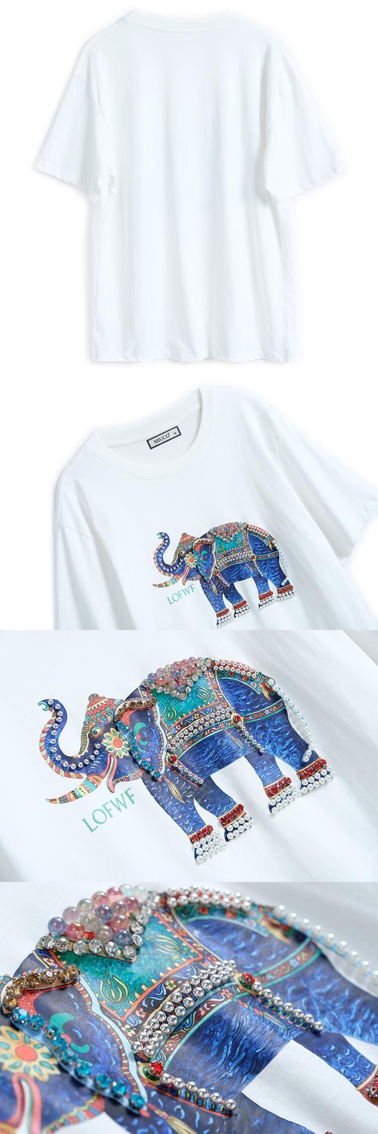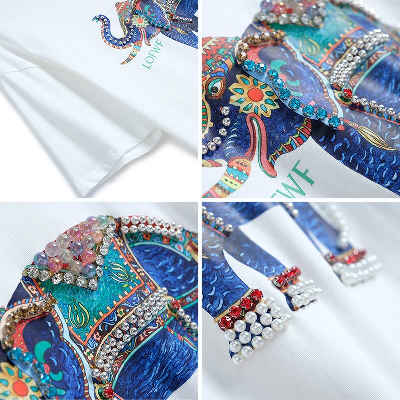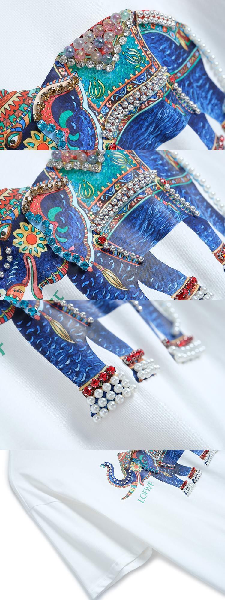 プリント柄ビーズ ルーズ薄手ラウンドネックTシャツ サマースタイル 夏物 Oネック MIUCO56444620390