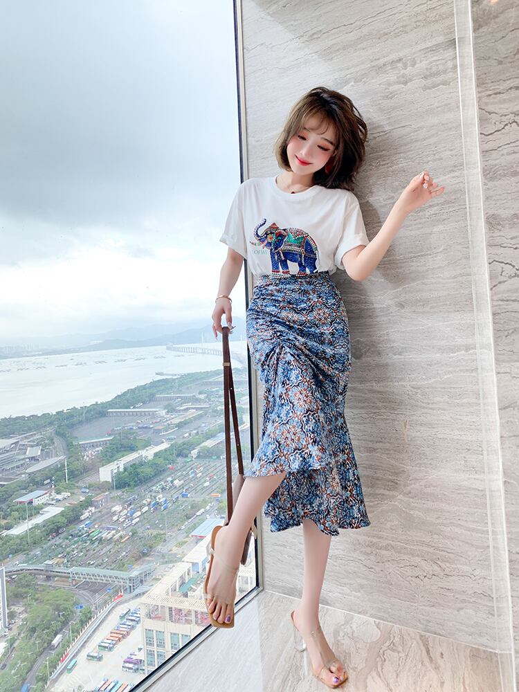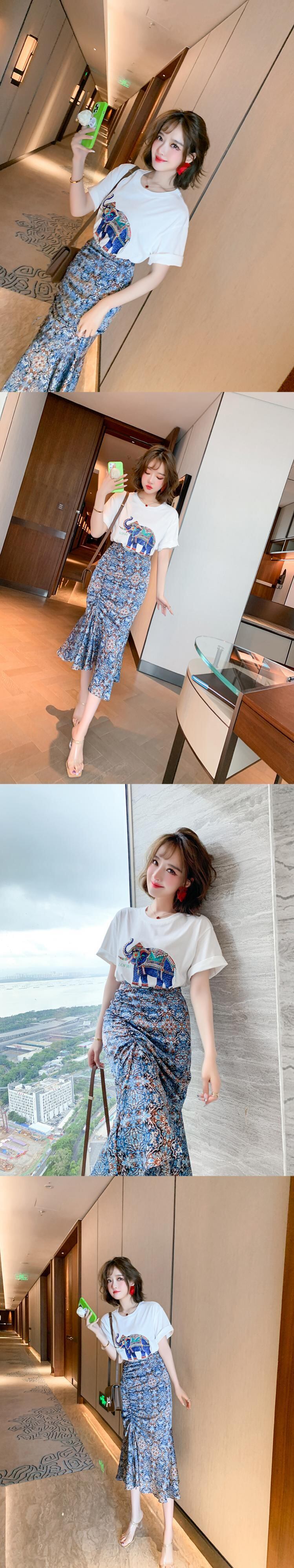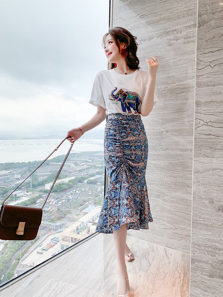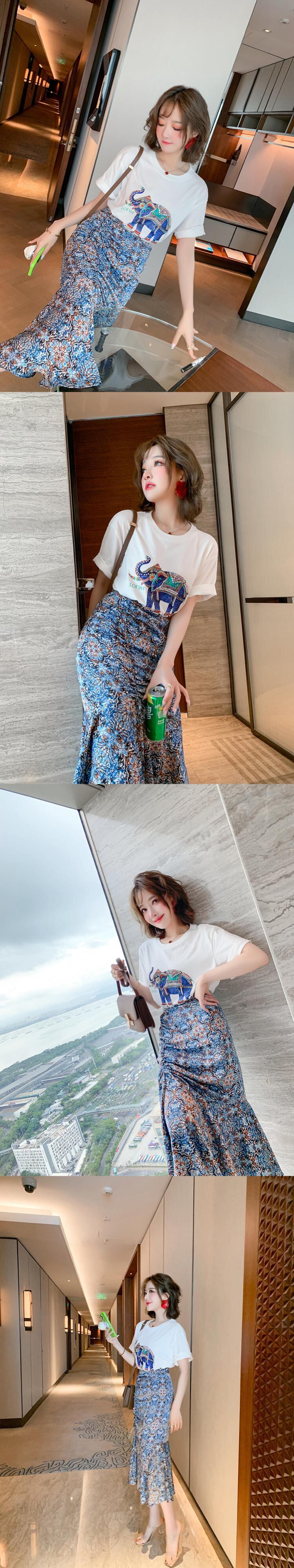 プリント柄ビーズ ルーズ薄手ラウンドネックTシャツ サマースタイル 夏物 Oネック MIUCO56444620390