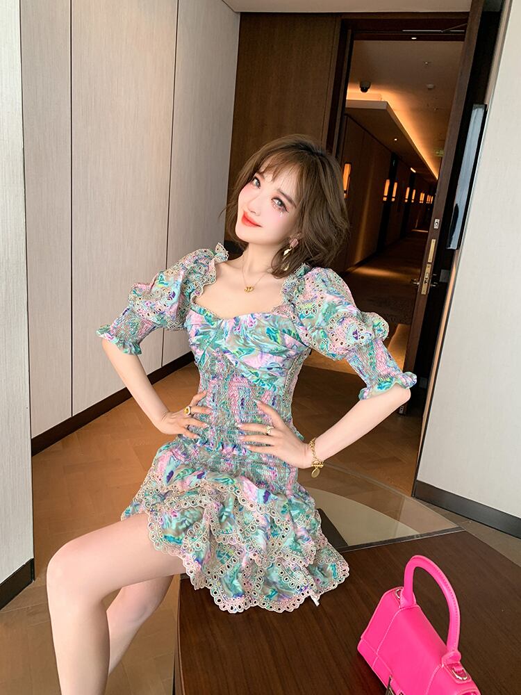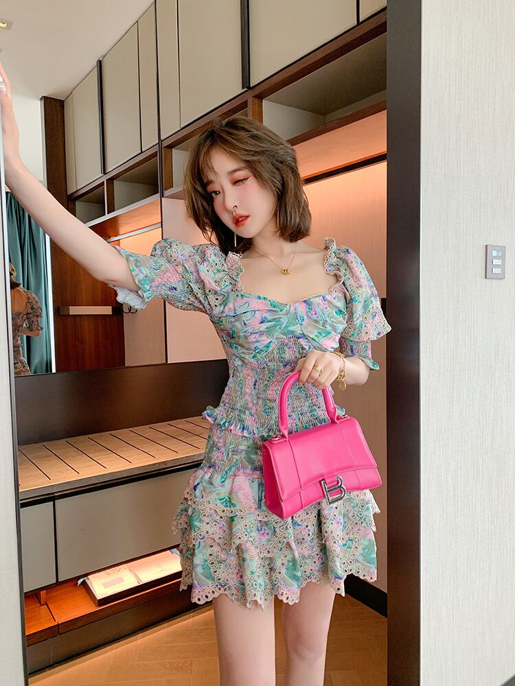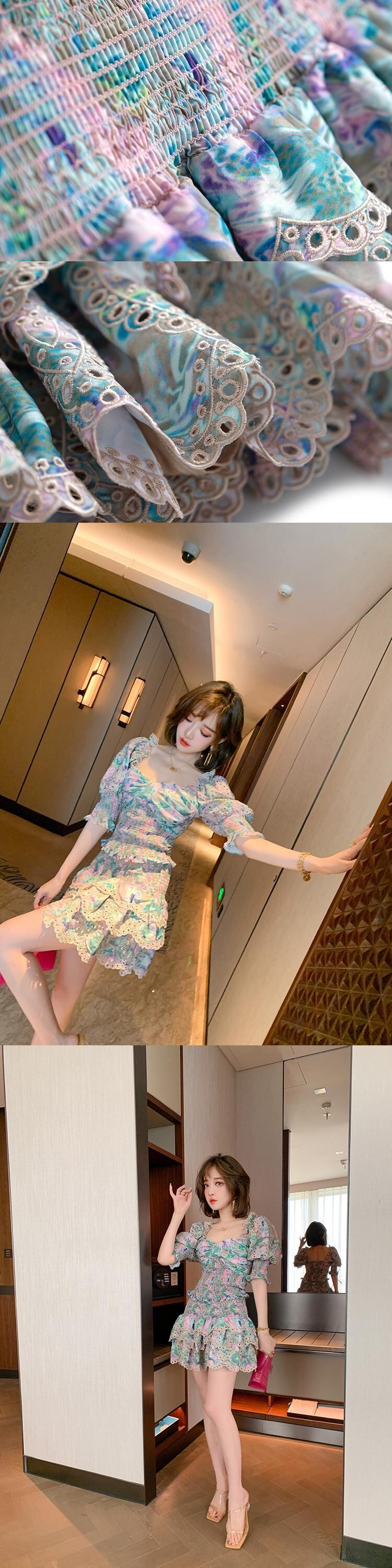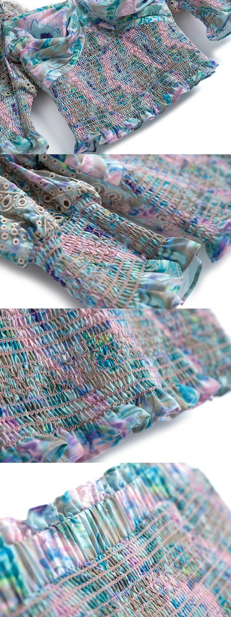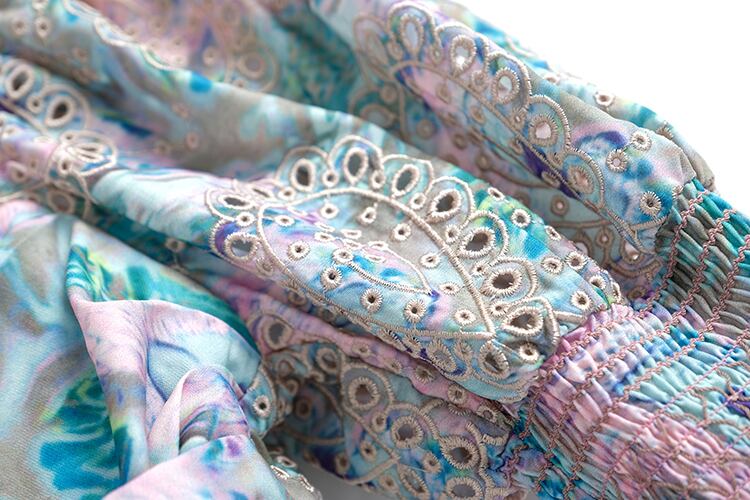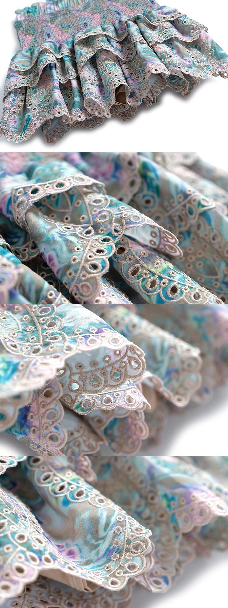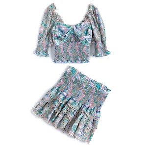 刺繍プリントトップス ウェスト格子柄スカート サマー 夏物 スクウェア MIUCO93170376756