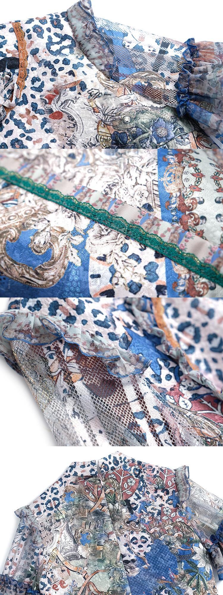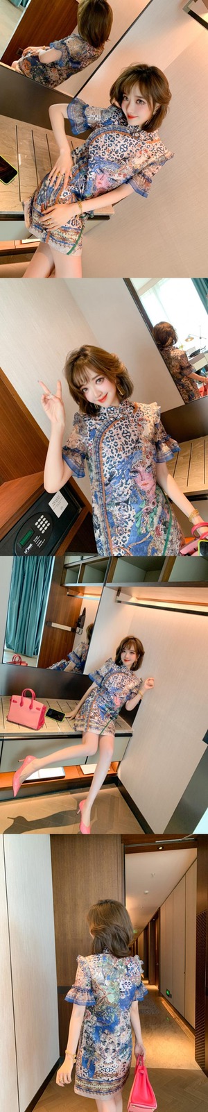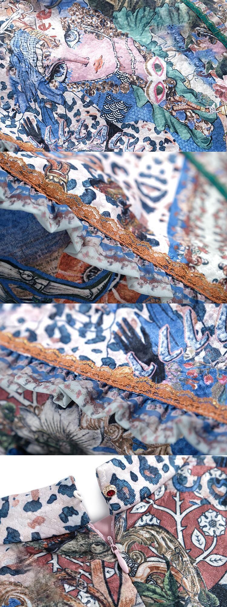 カラーバックルプリントレースウェストドレス サマー レトロ 夏物 MIUCO46713039342