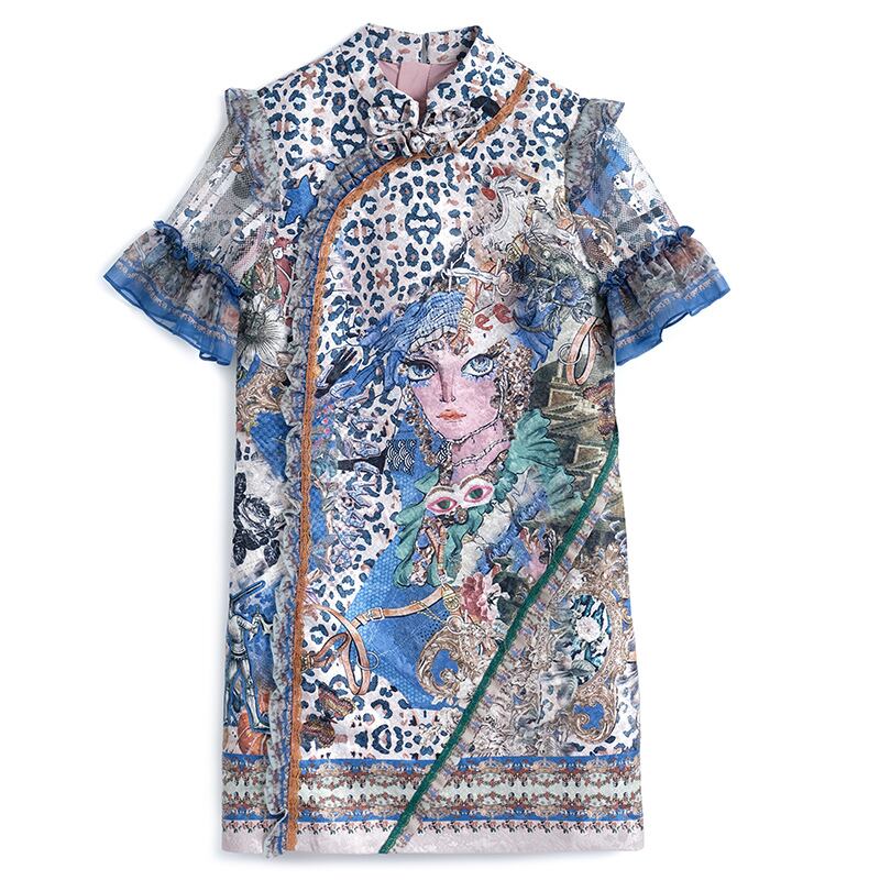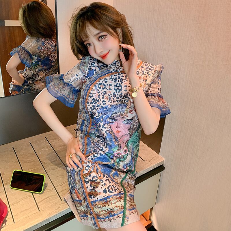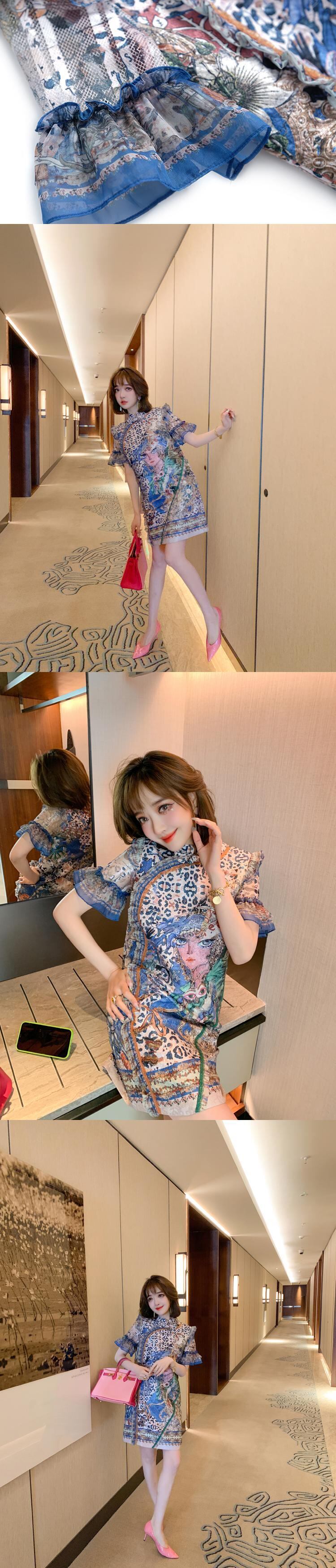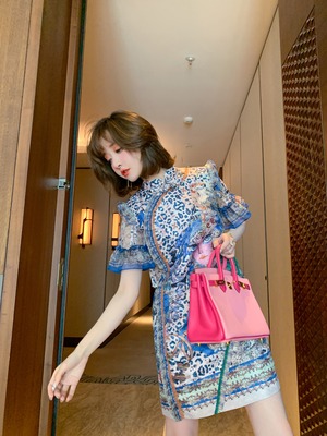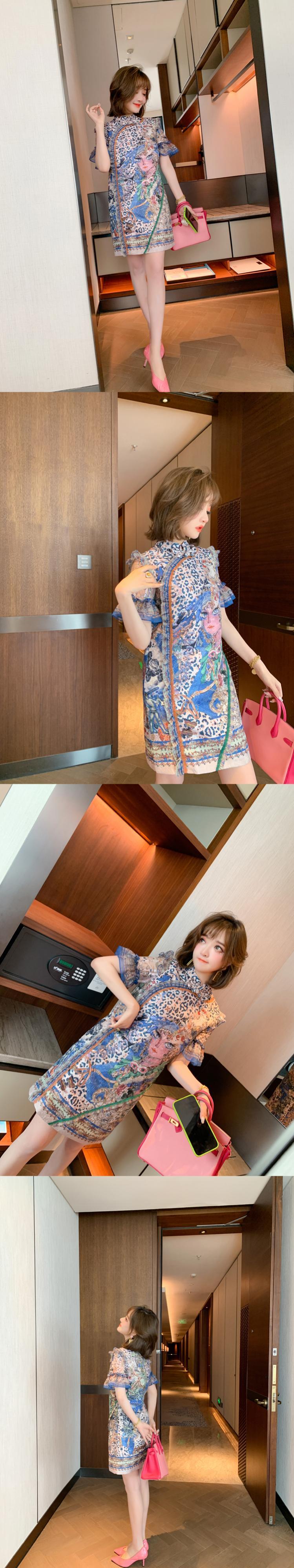 カラーバックルプリントレースウェストドレス サマー レトロ 夏物 MIUCO46713039342