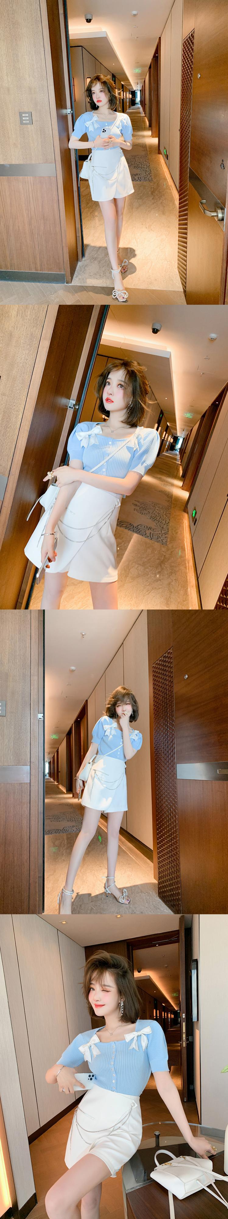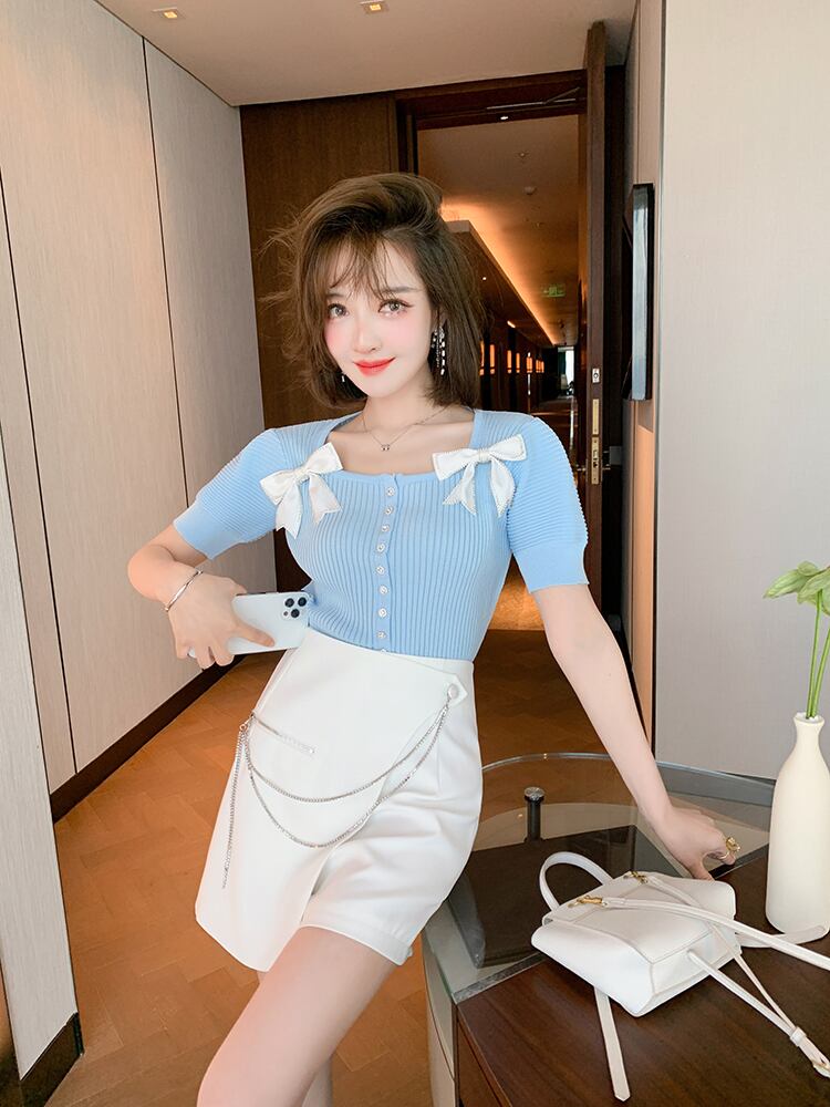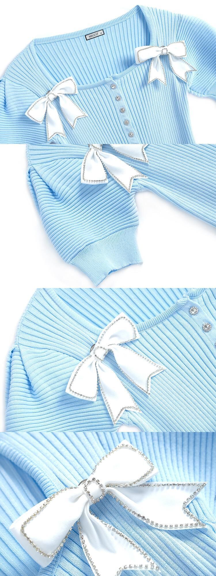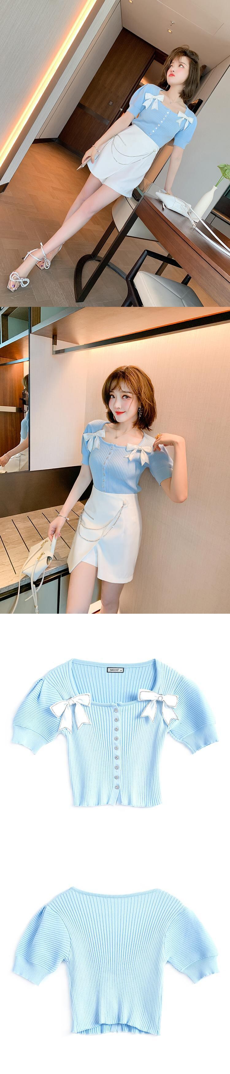 スリーブリボンスリム薄手ニットTシャツ レディースサマー 夏物 スクウェア MIUCO46650146081