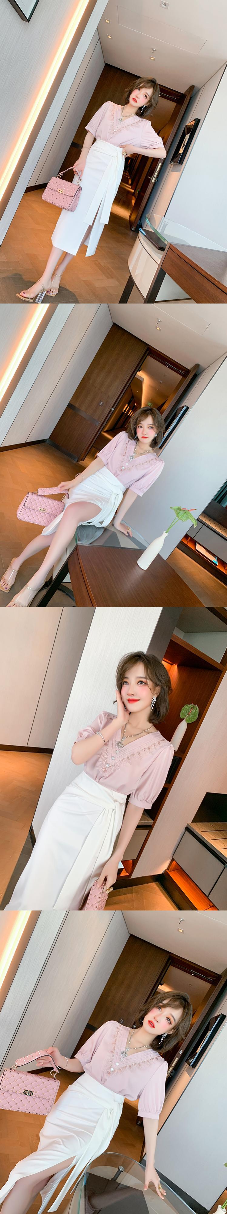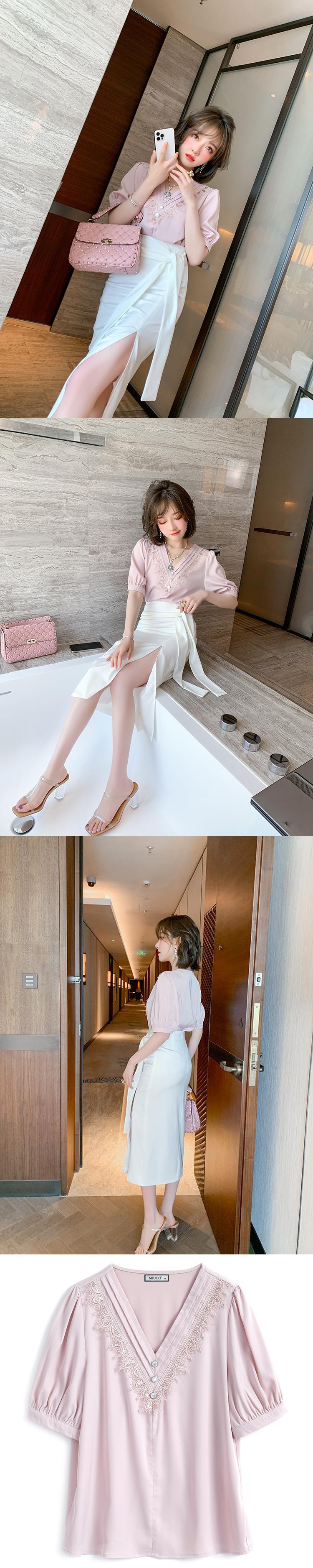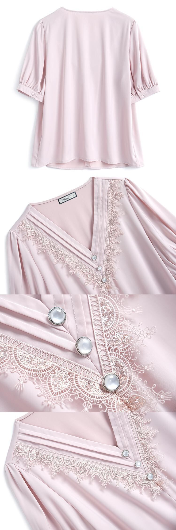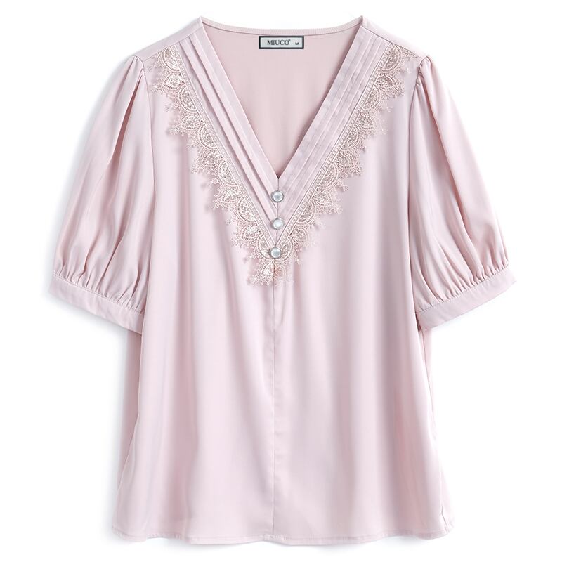 プリーツレースソリッド カラーVネックシャツ サマー 夏物 ソリッドカラー MIUCO23831363565