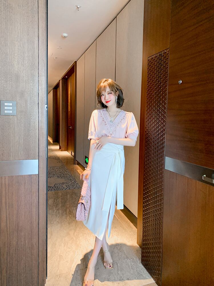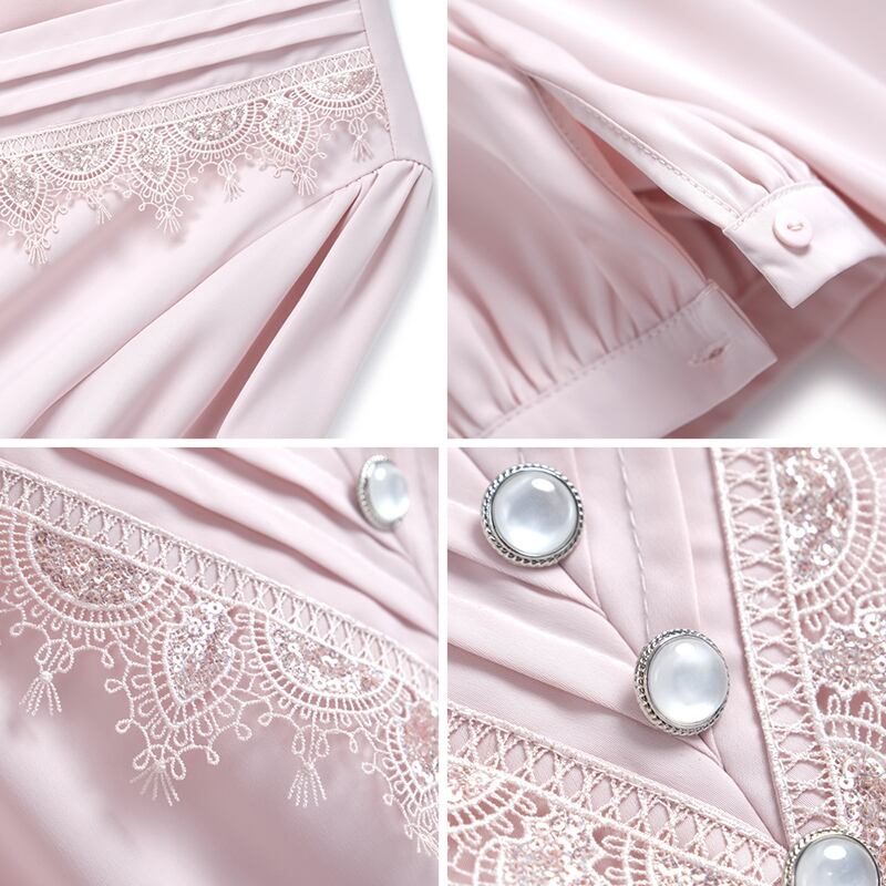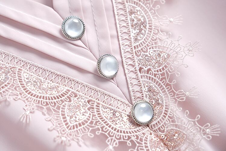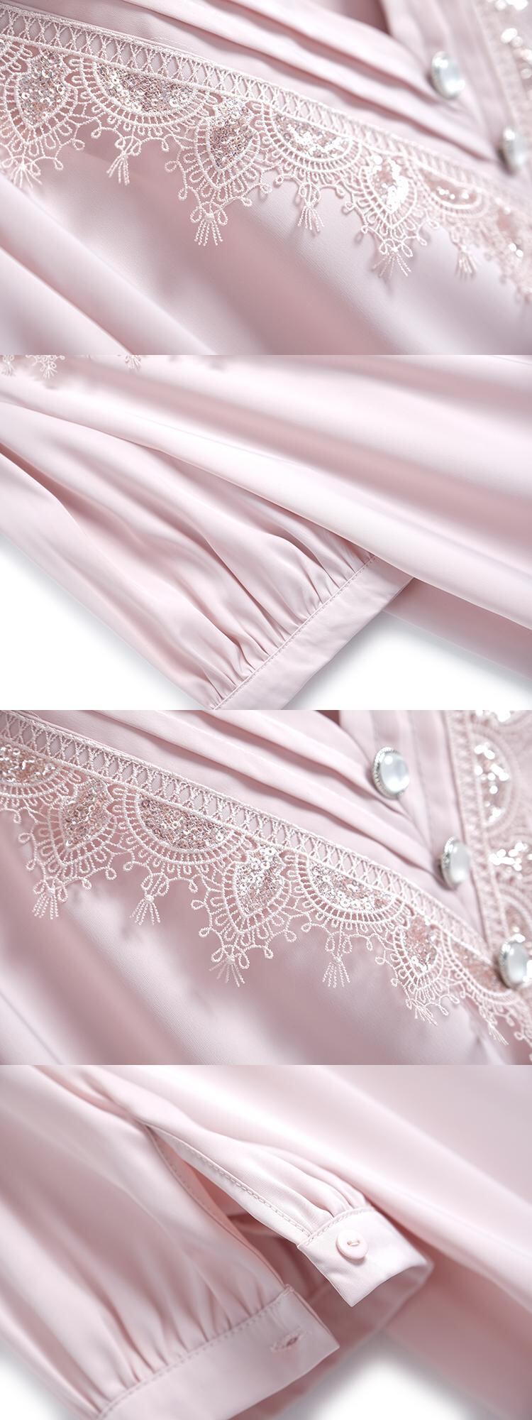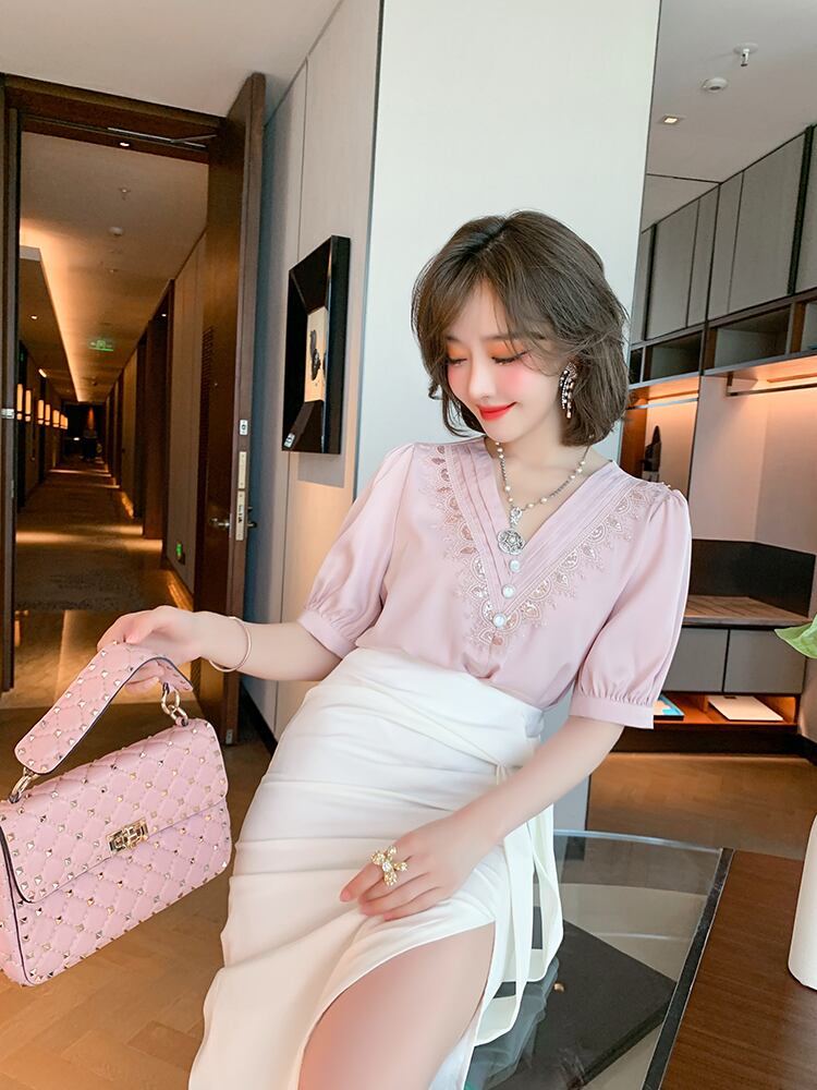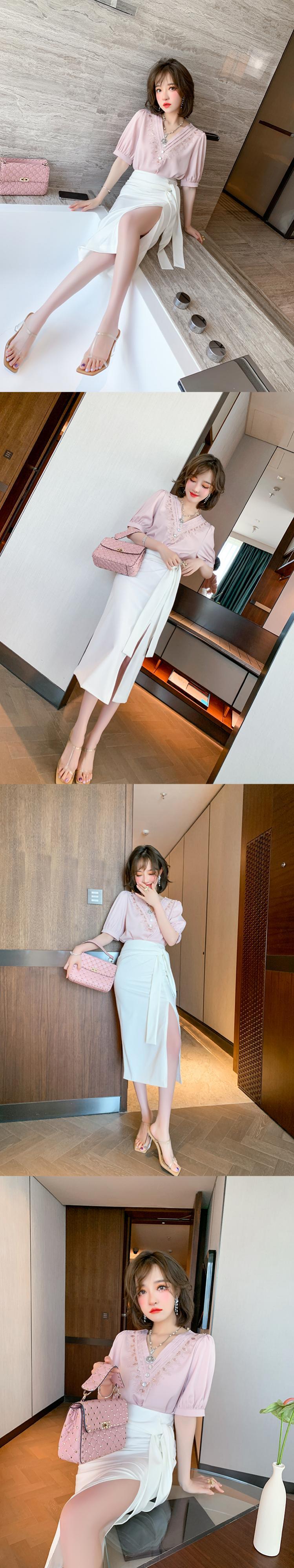プリーツレースソリッド カラーVネックシャツ サマー 夏物 ソリッドカラー MIUCO23831363565