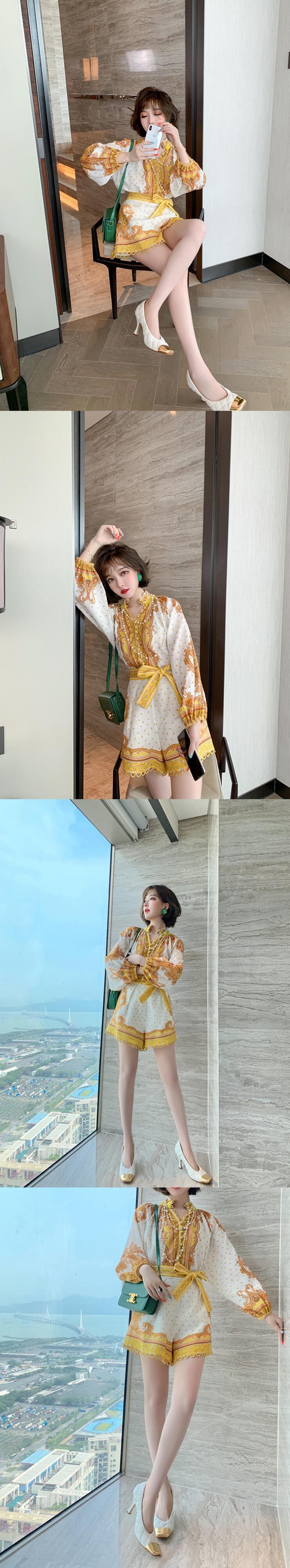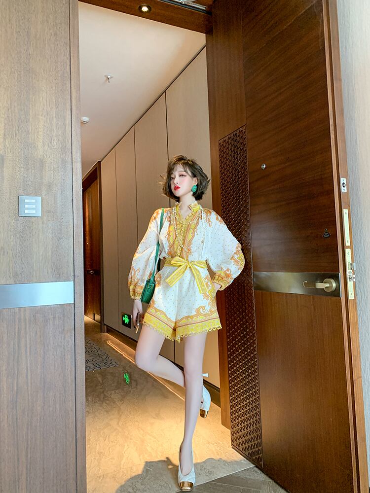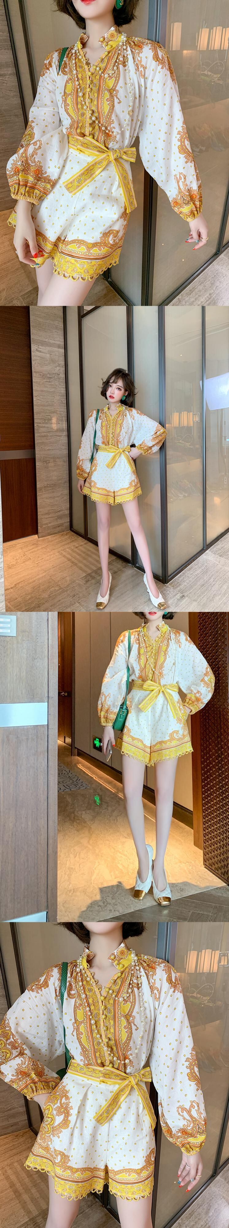 スタンダードプリント柄スタンドカラーカラールーズスリーブシャツ ベルト ワイドレッグショーツ セット オータム レトロ 秋物 ハーネス ブルマー ワイドパンツ MIUCO43107743887