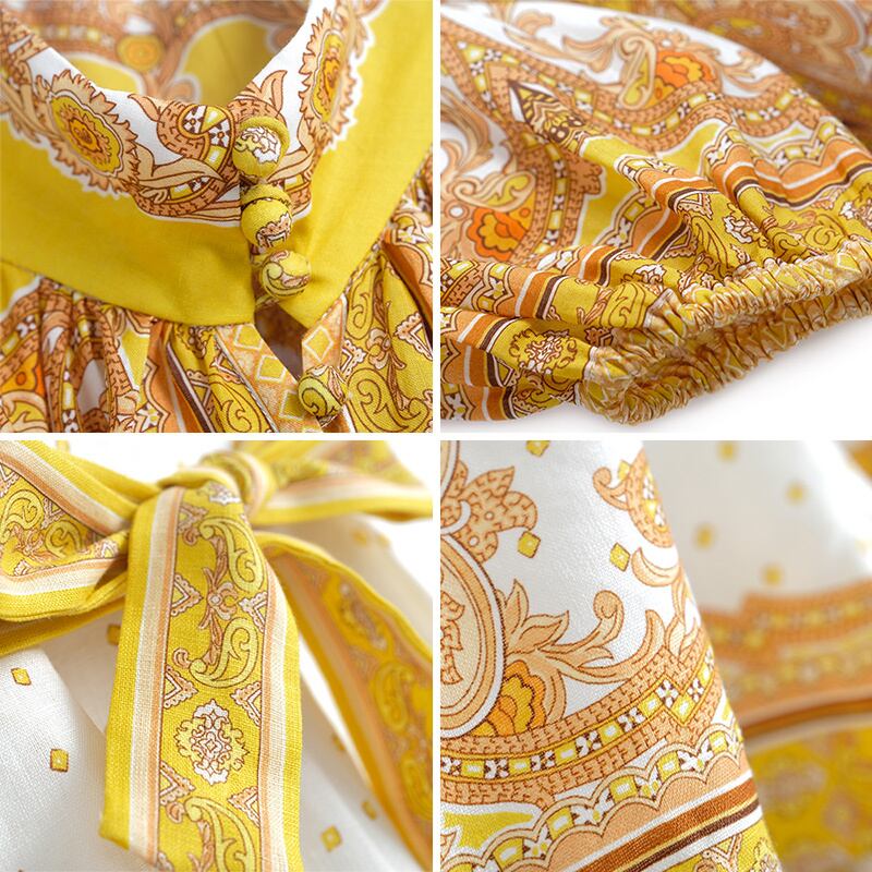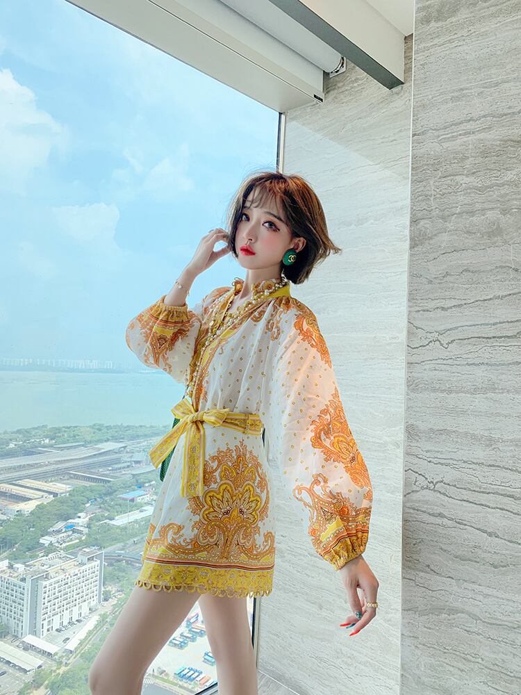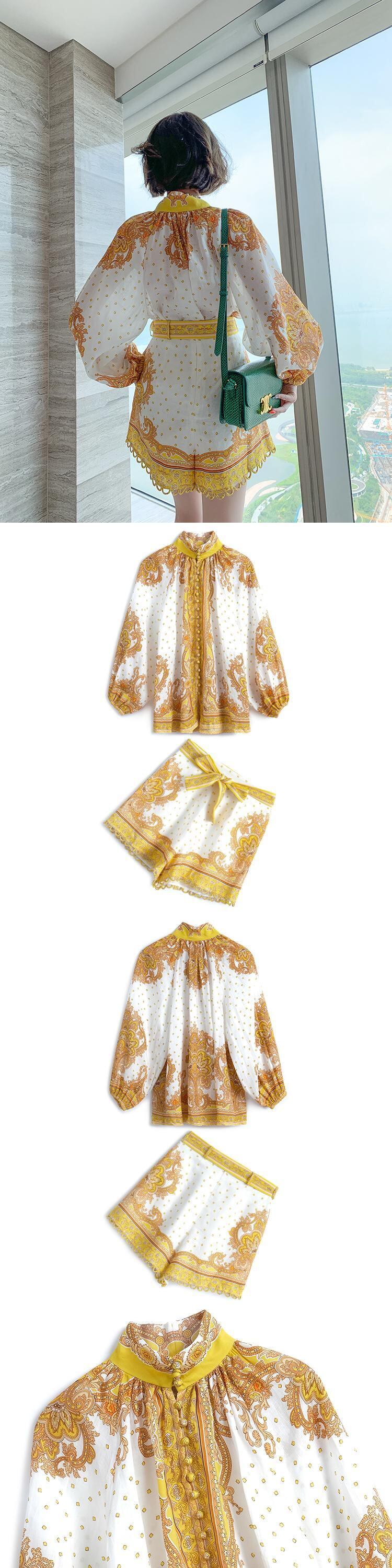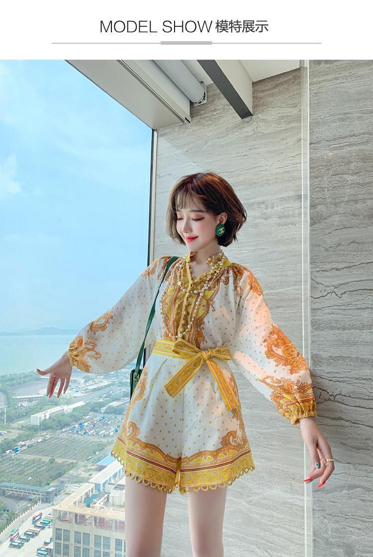 スタンダードプリント柄スタンドカラーカラールーズスリーブシャツ ベルト ワイドレッグショーツ セット オータム レトロ 秋物 ハーネス ブルマー ワイドパンツ MIUCO43107743887