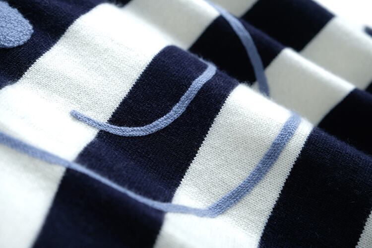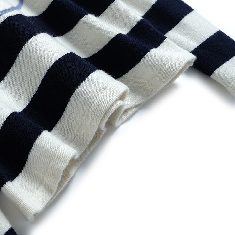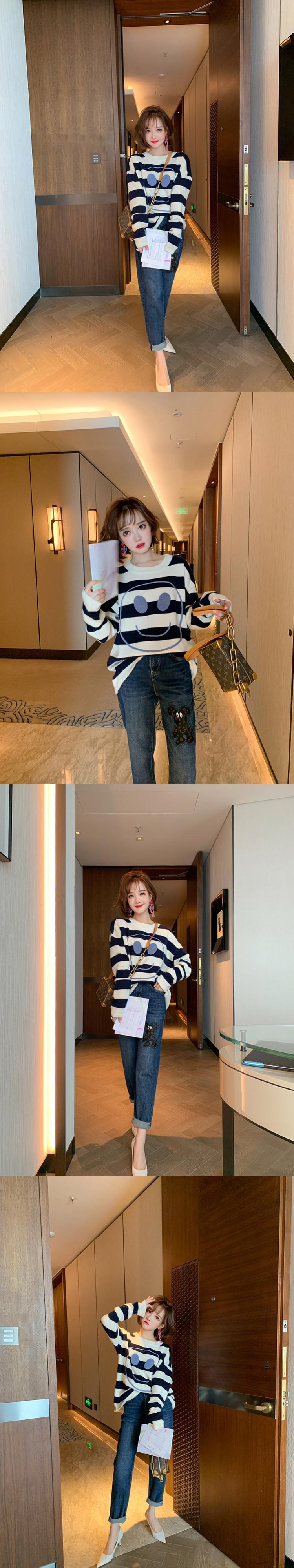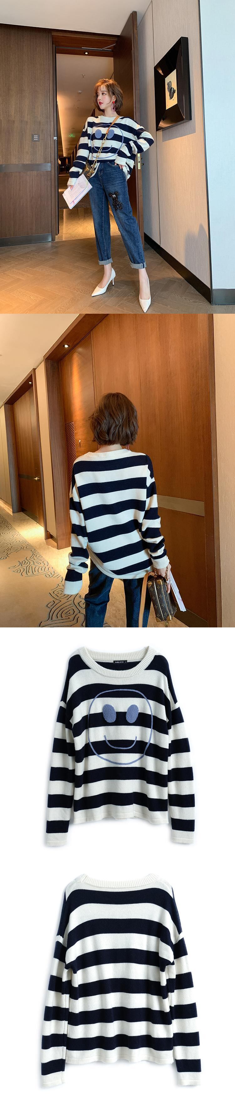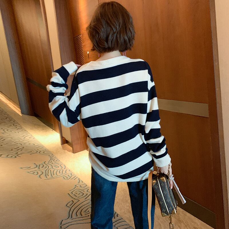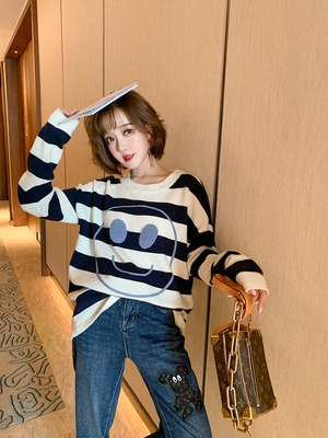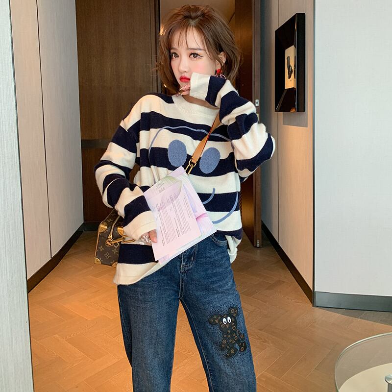 刺繍ストライプラウンドネックルーズニットセーター オータムウィンター 秋物 冬物 Oネック MIUCO4847673459