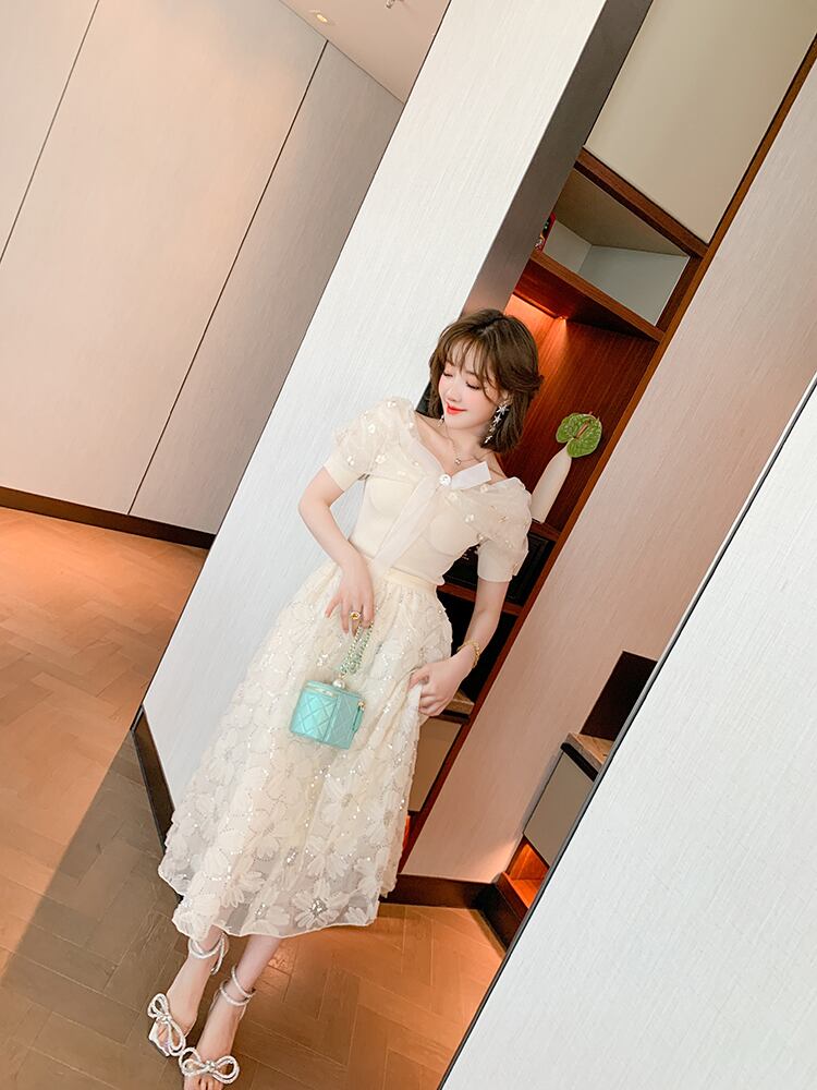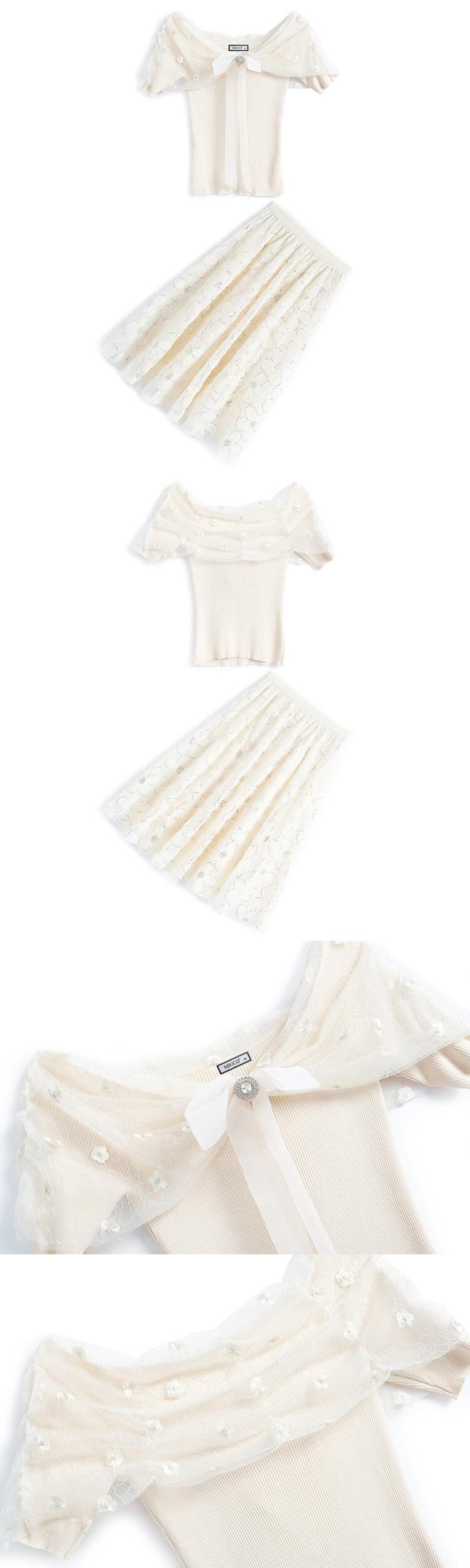 メッシュセーター ハイウェストウェストFlowerデザイン スカート サマー 夏物 フラワーデザイン ステッチ MIUCO95691972589