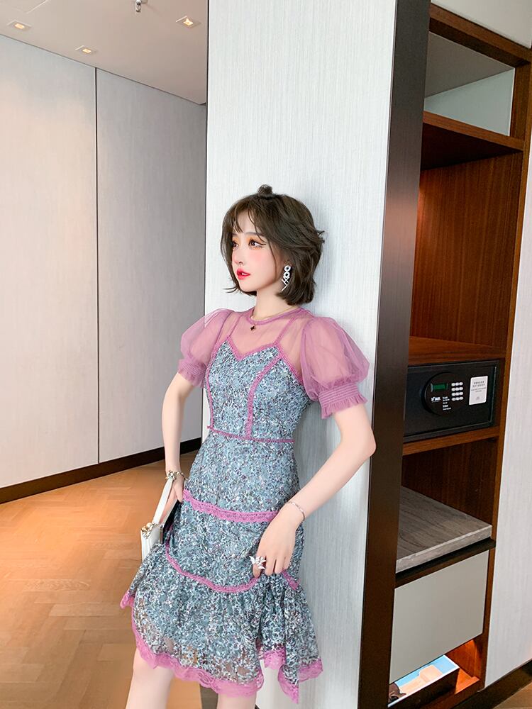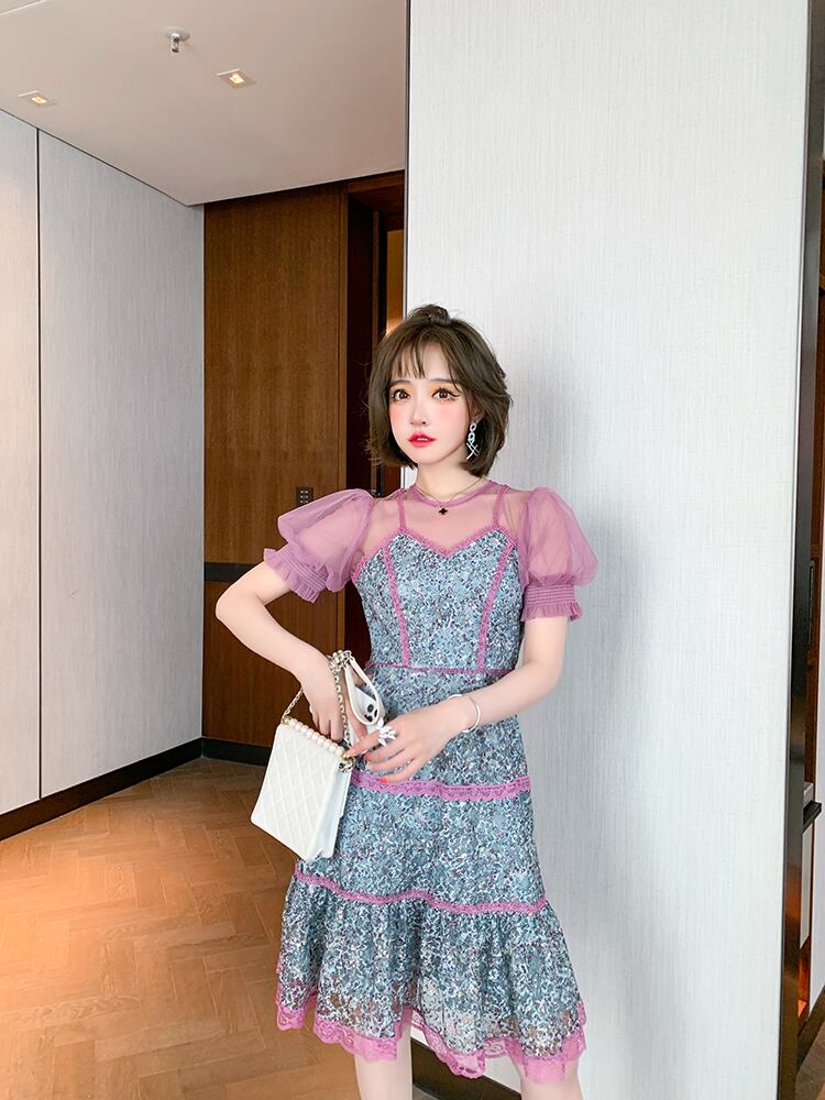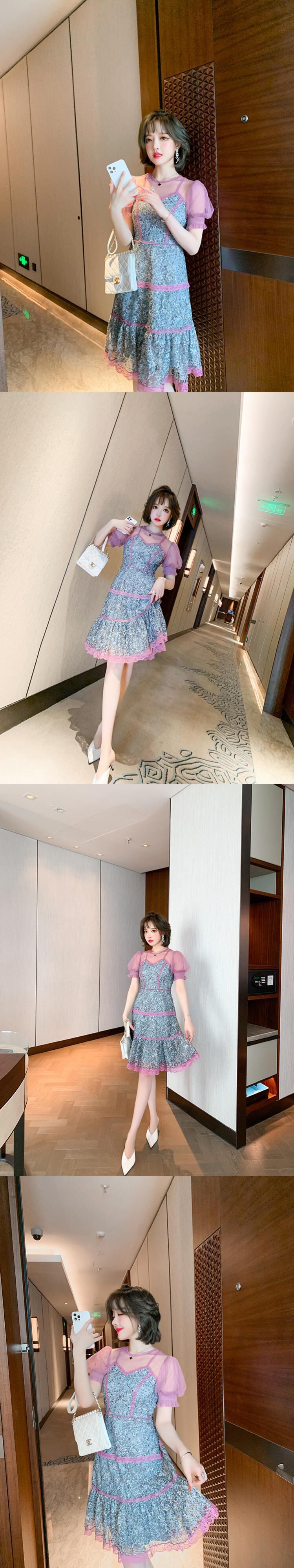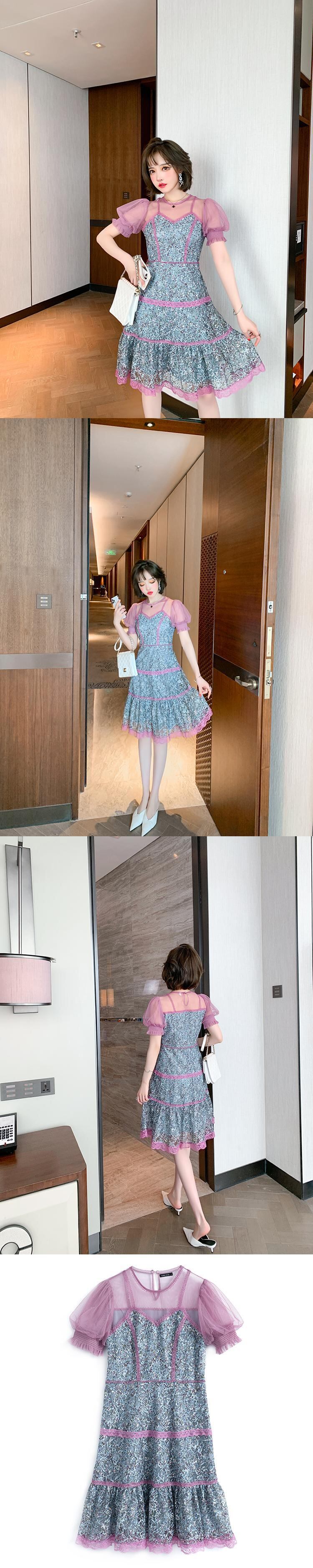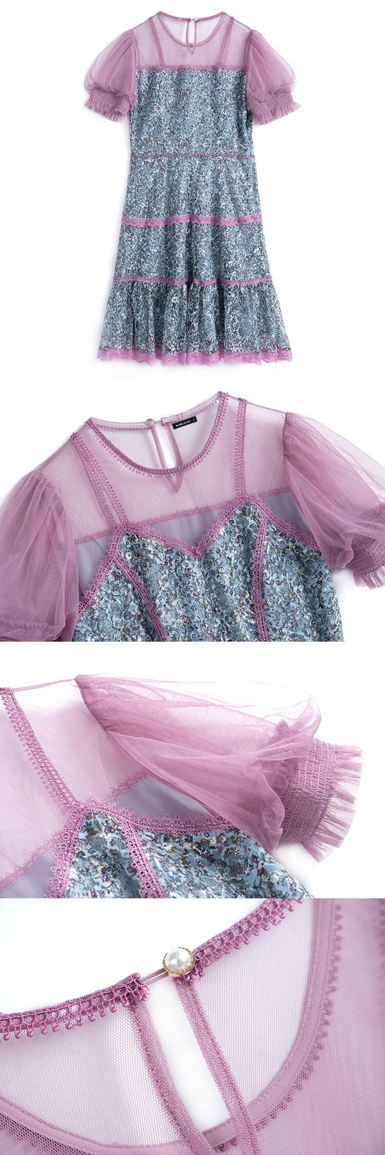 メッシュラウンドネックレーストップス ウェストドレス スプリングサマー 春物 夏物 Oネック ステッチ MIUCO16990753366