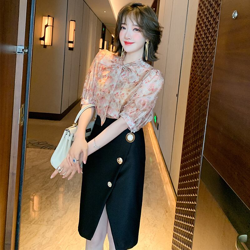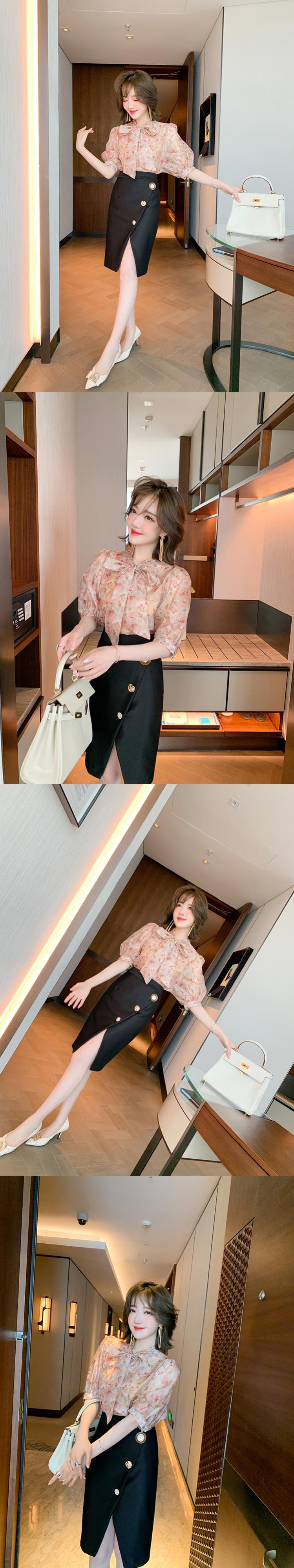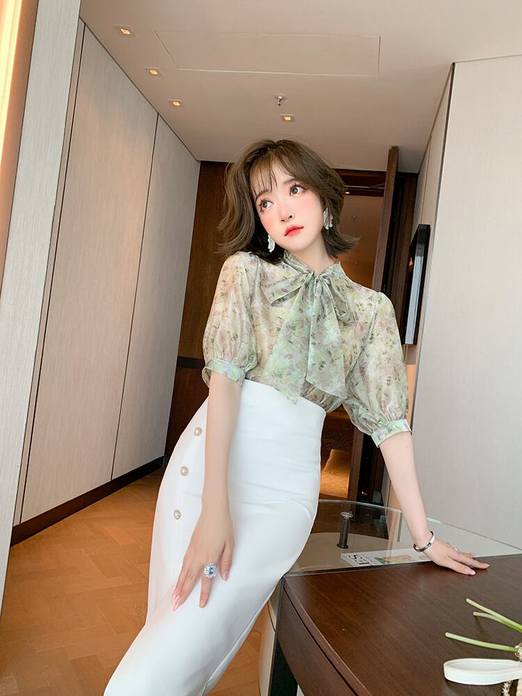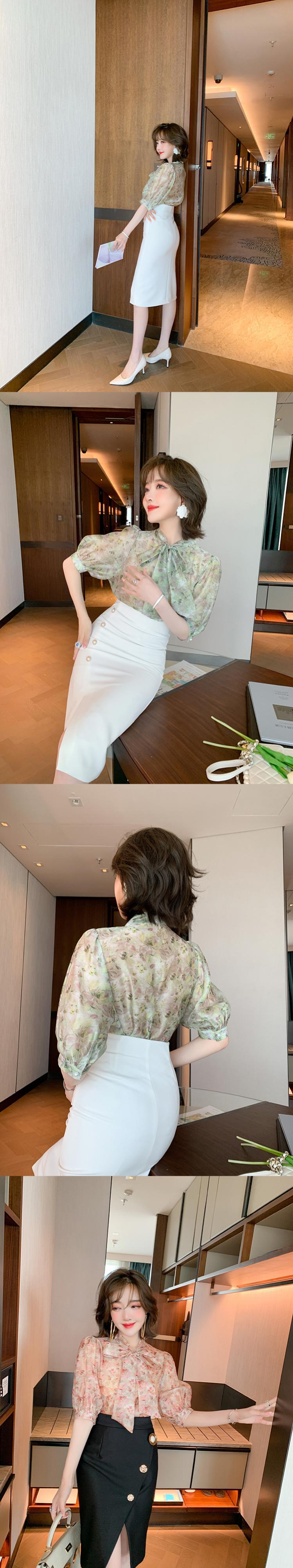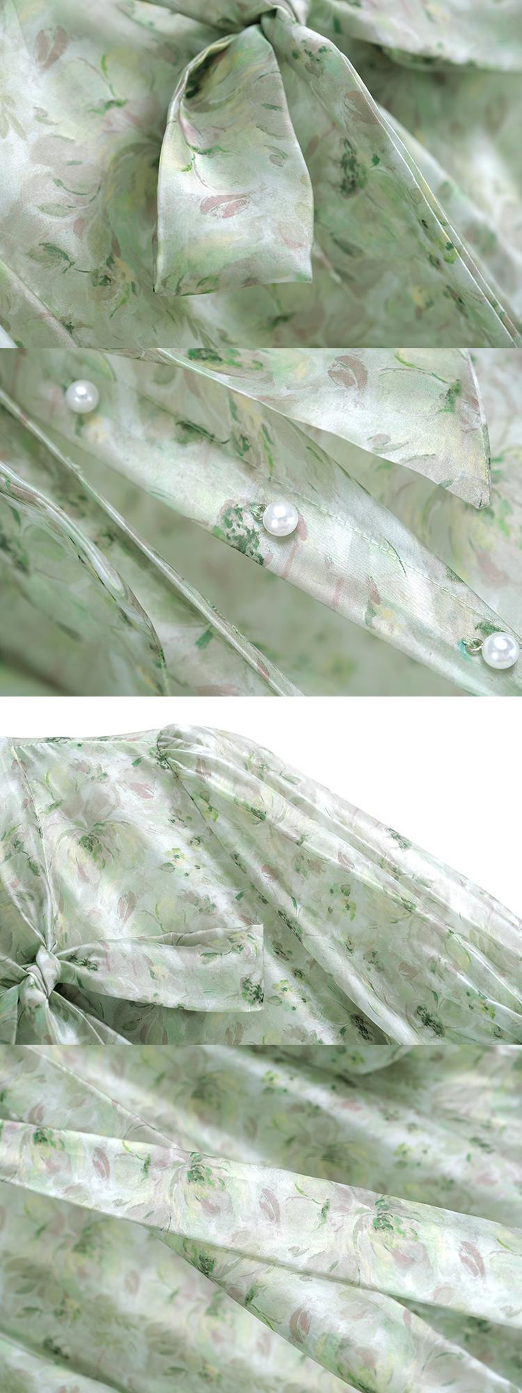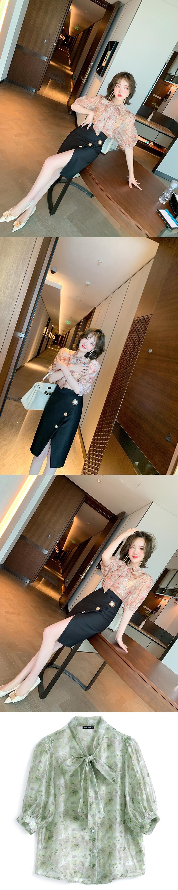 プリント柄スリーブシャツ レディースサマー ランタンスリーブ リボン 夏物 MIUCO30754122788