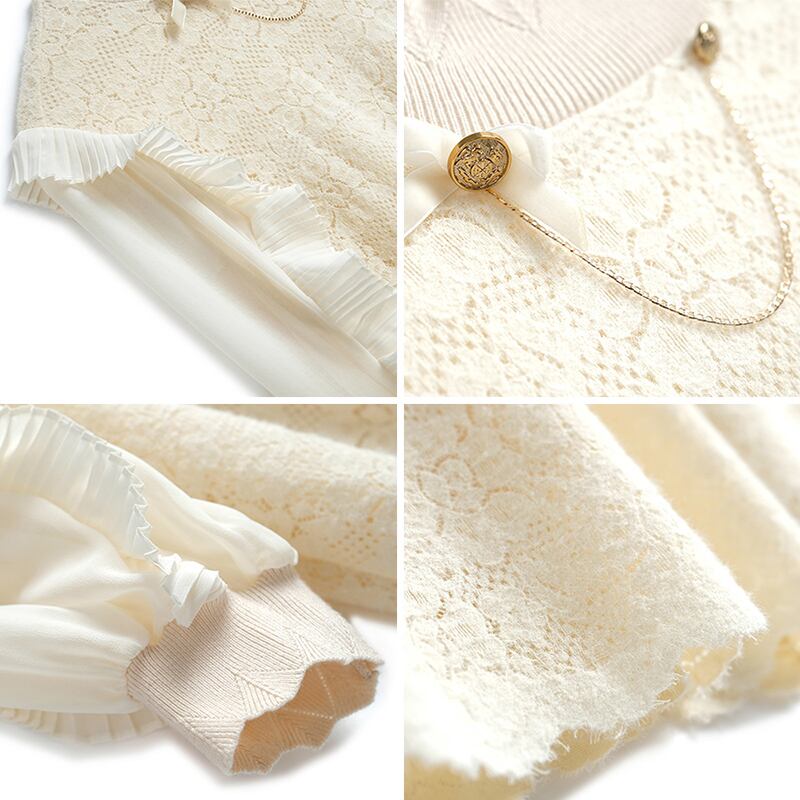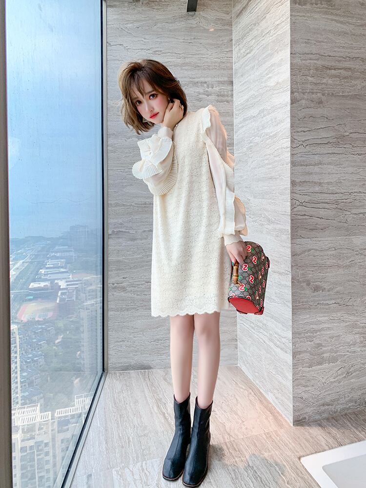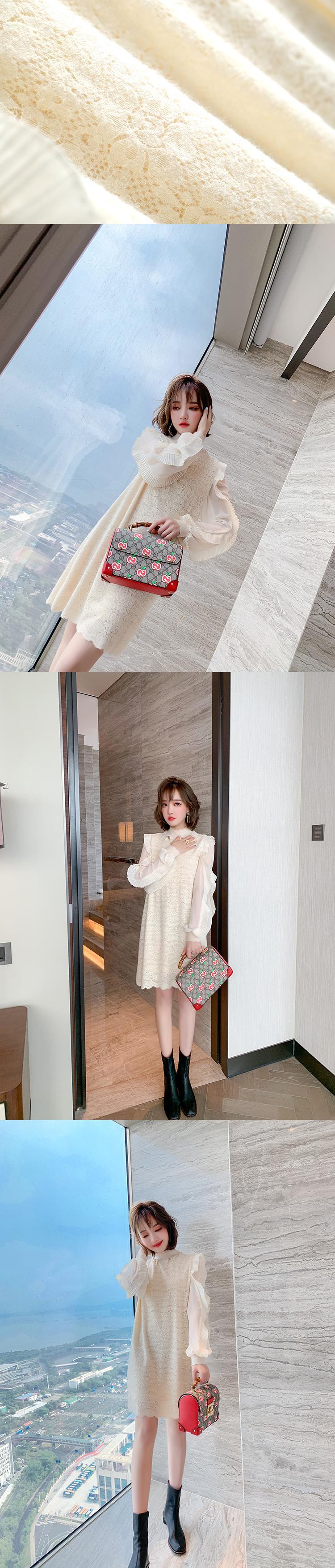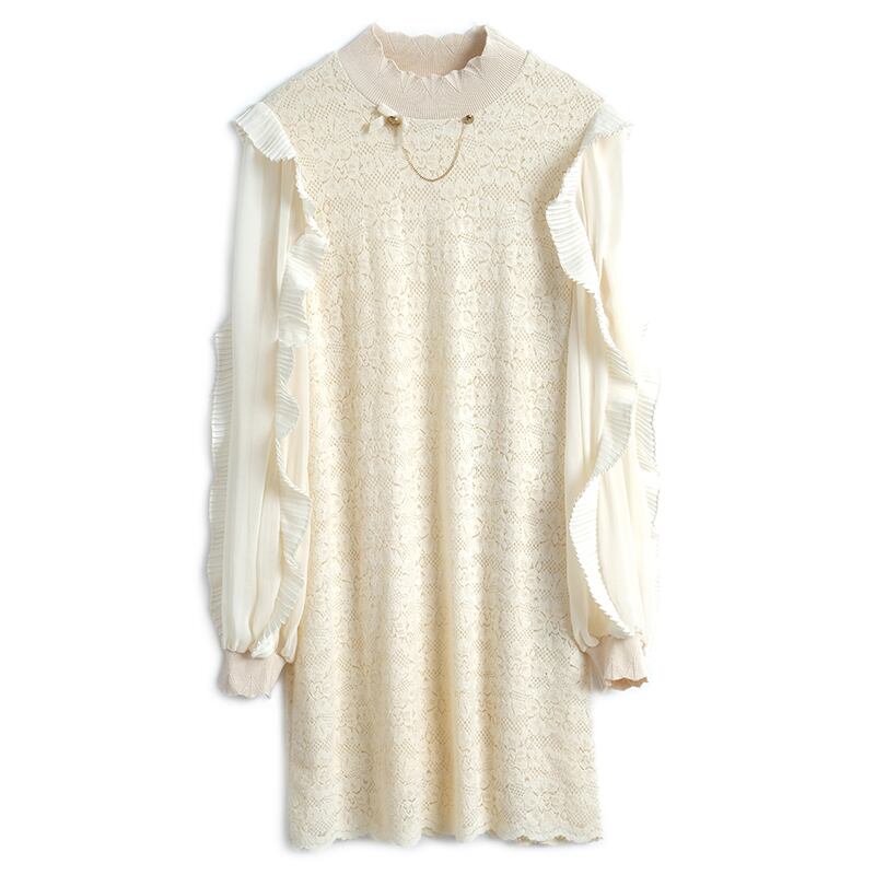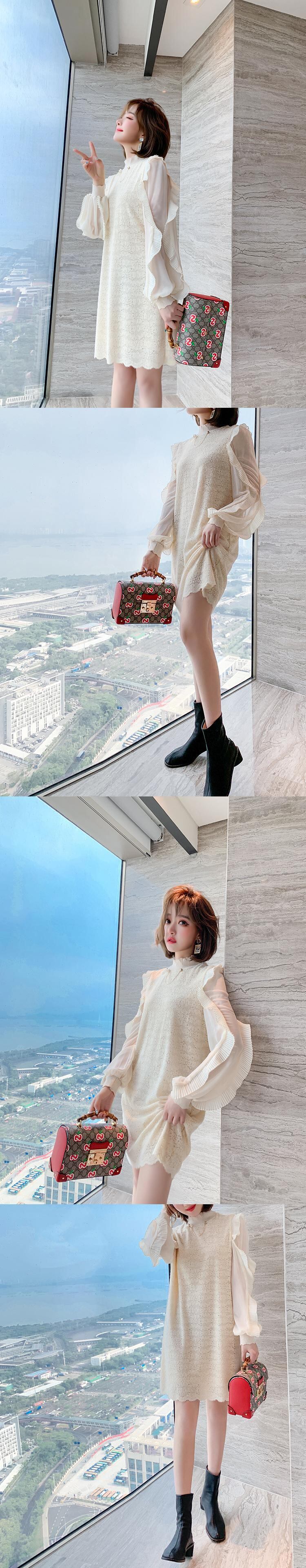 カラーニットレースジャカードプリーツドレス レディースウィンター ロング 冬物 ステッチ MIUCO61022358966