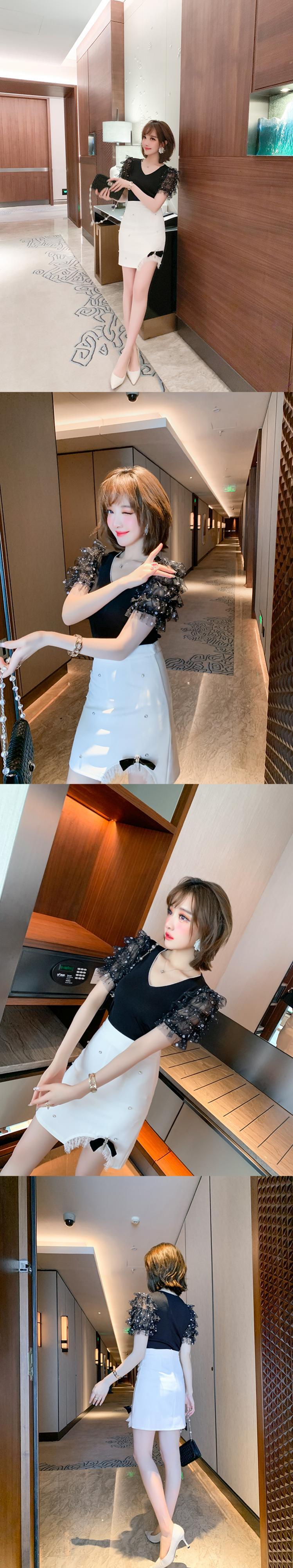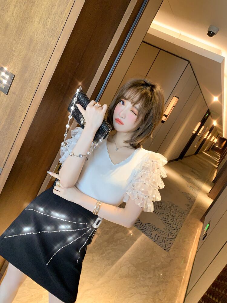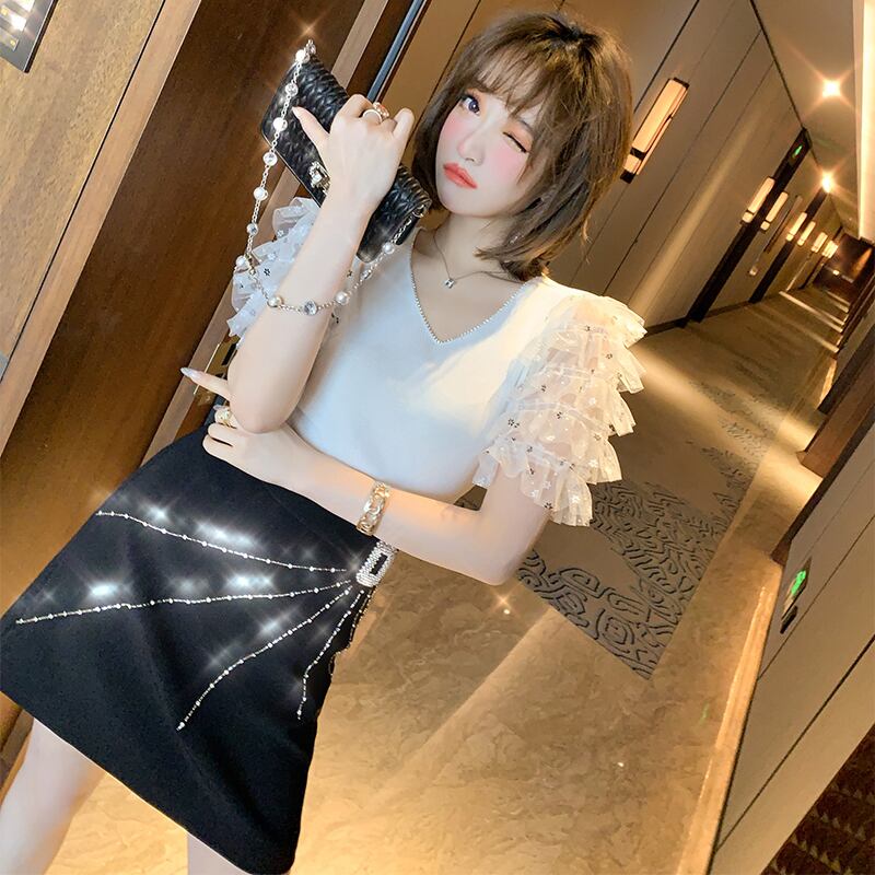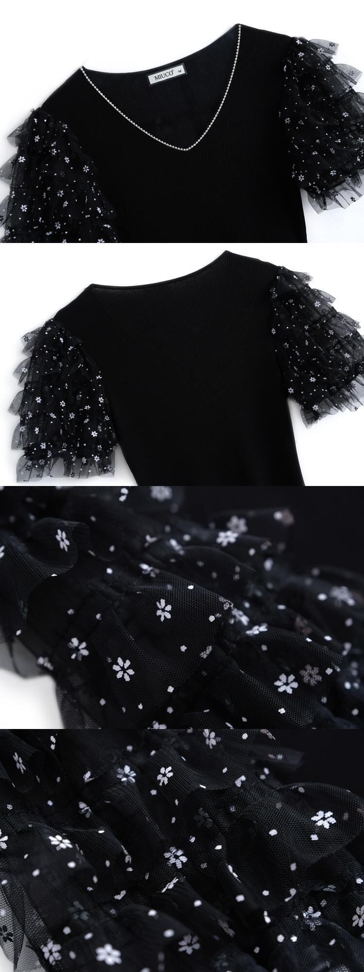 Vネックレースメッシュスリムニットトップス レディースサマースタイル エレガント 夏物 MIUCO44418030965