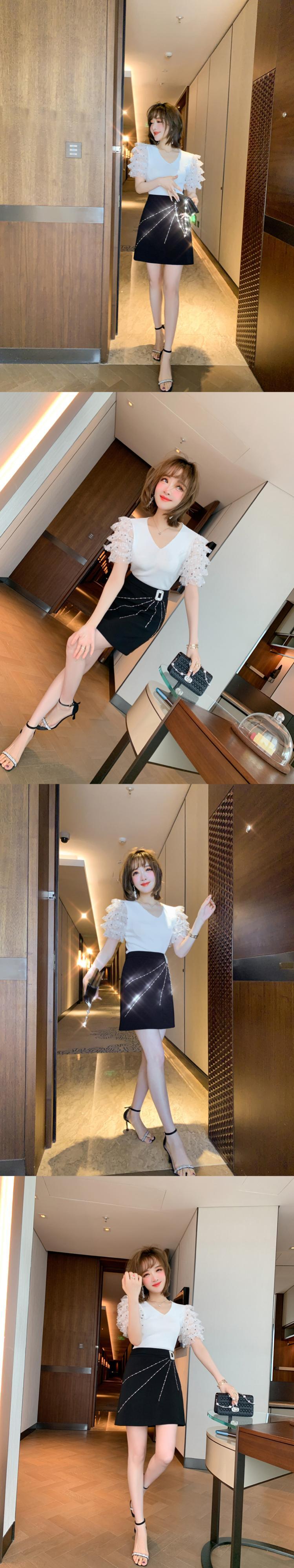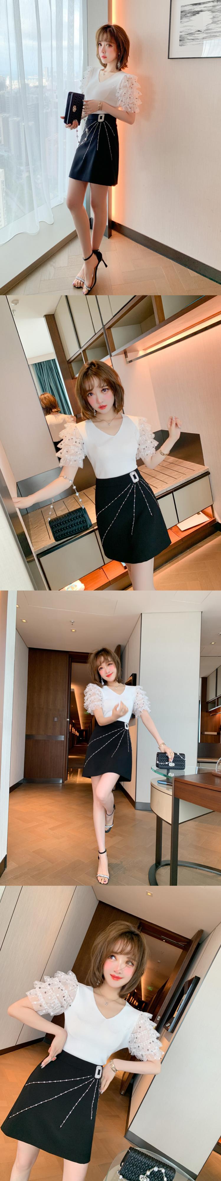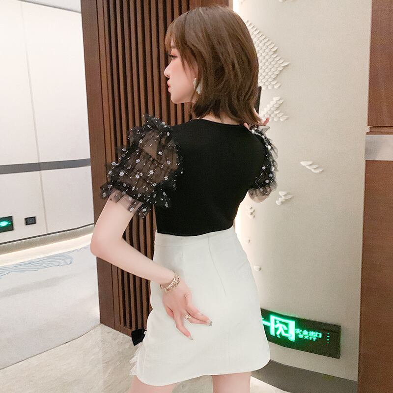 Vネックレースメッシュスリムニットトップス レディースサマースタイル エレガント 夏物 MIUCO44418030965