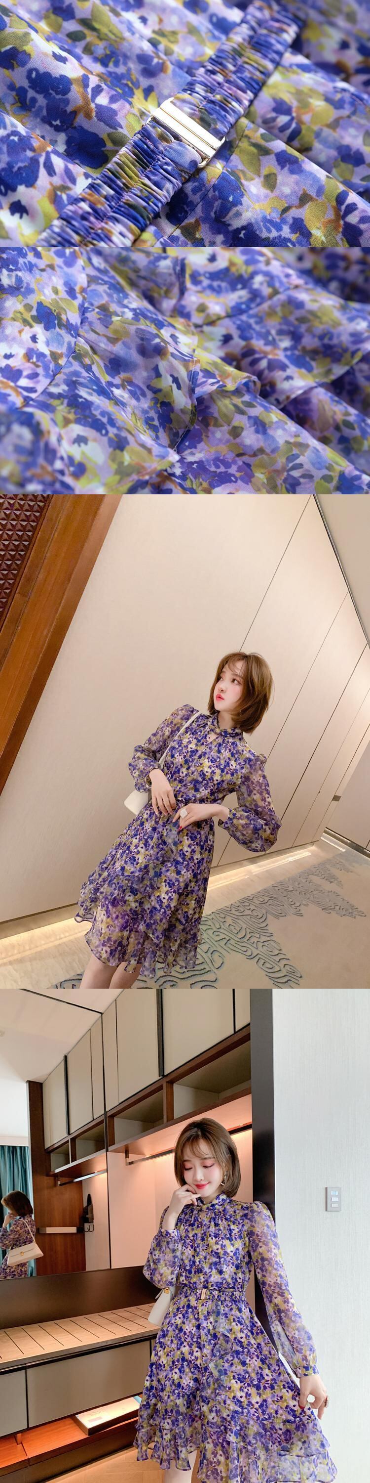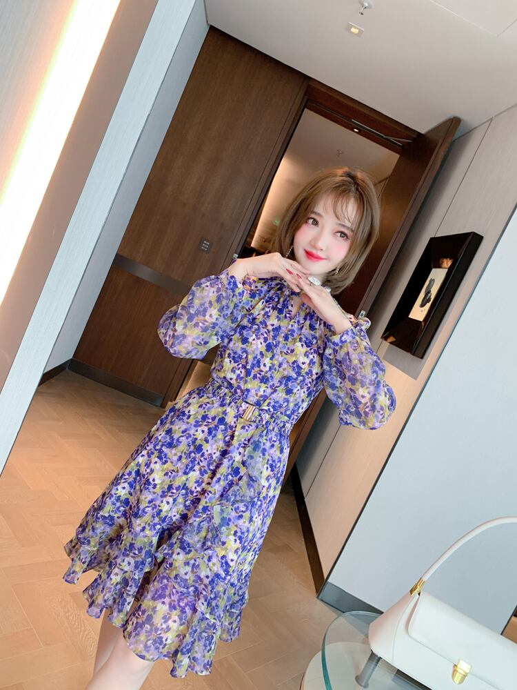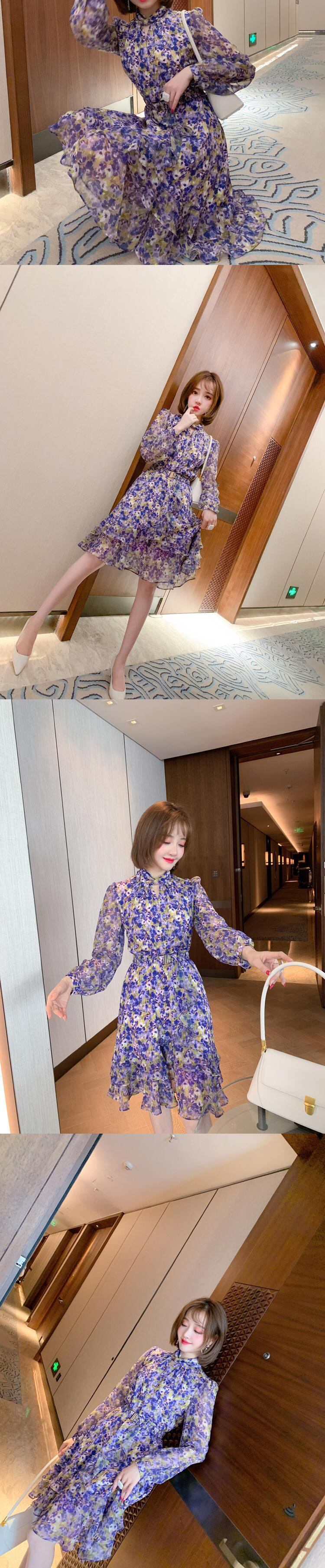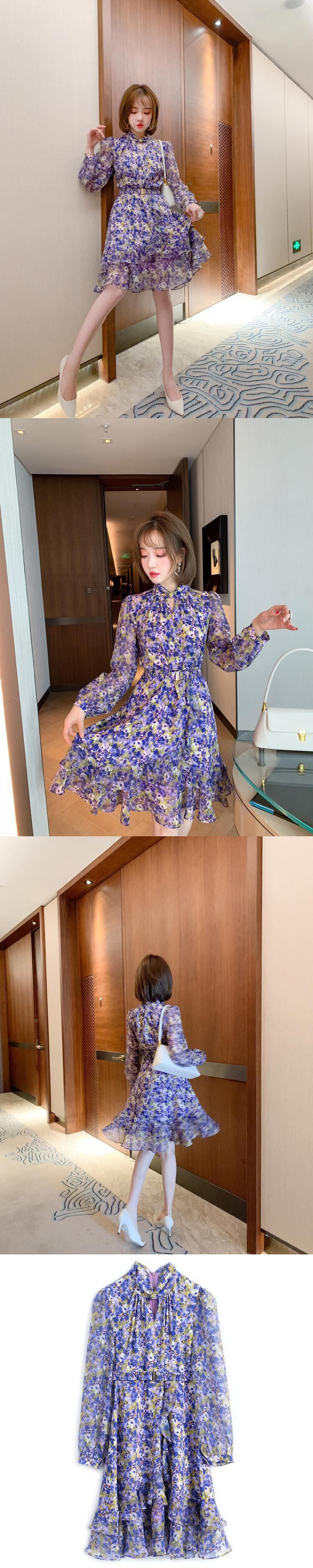 スタンドカラーカラーストレッチウェストプリントラッフルドレス スプリング エラスティック 伸縮 春物 MIUCO12770231067