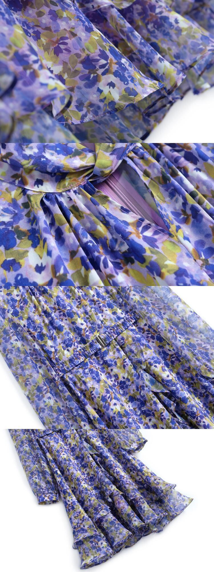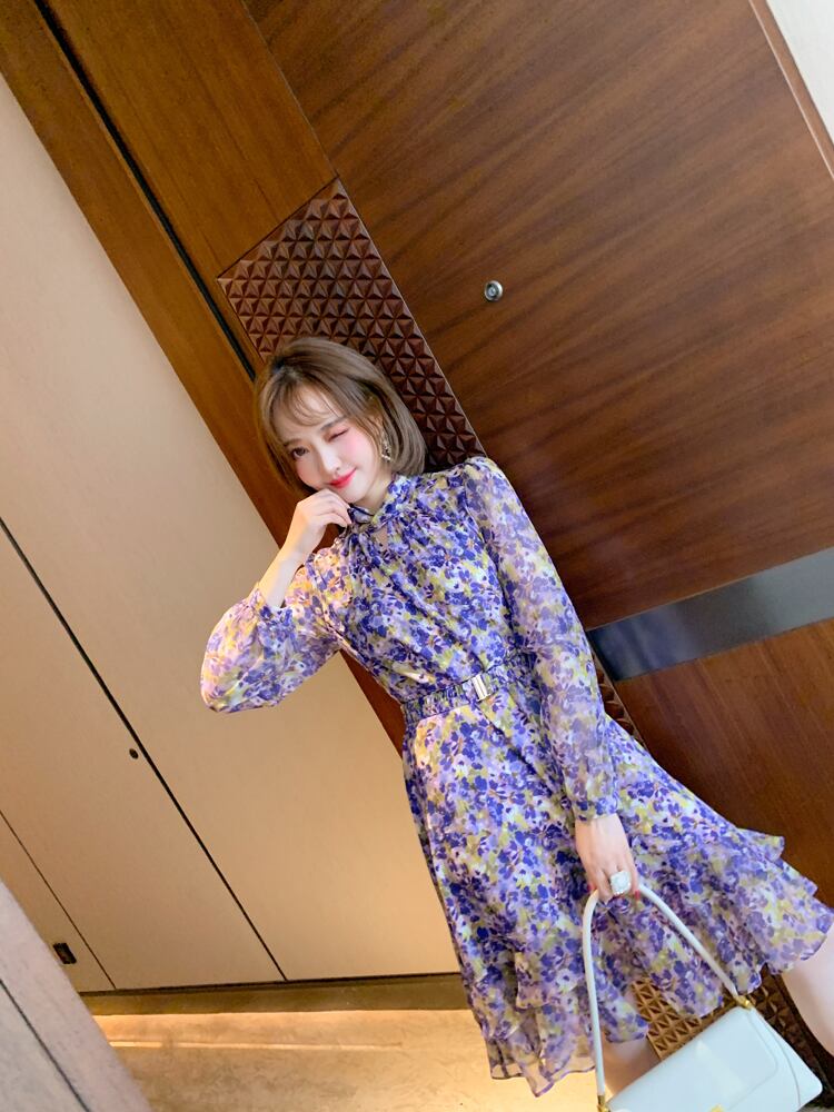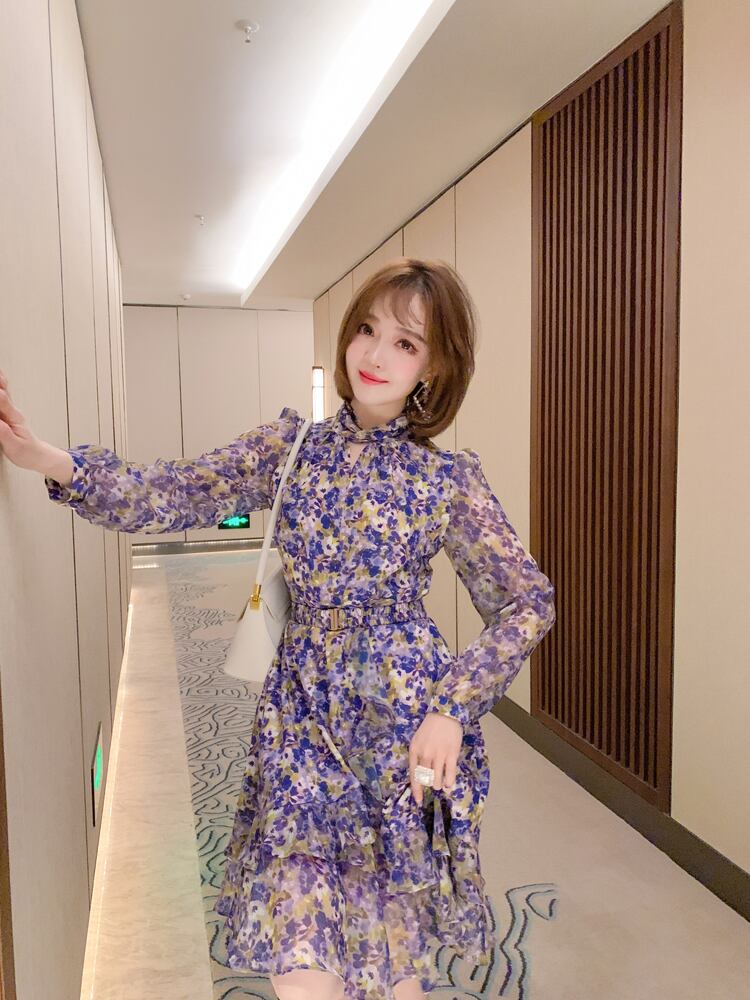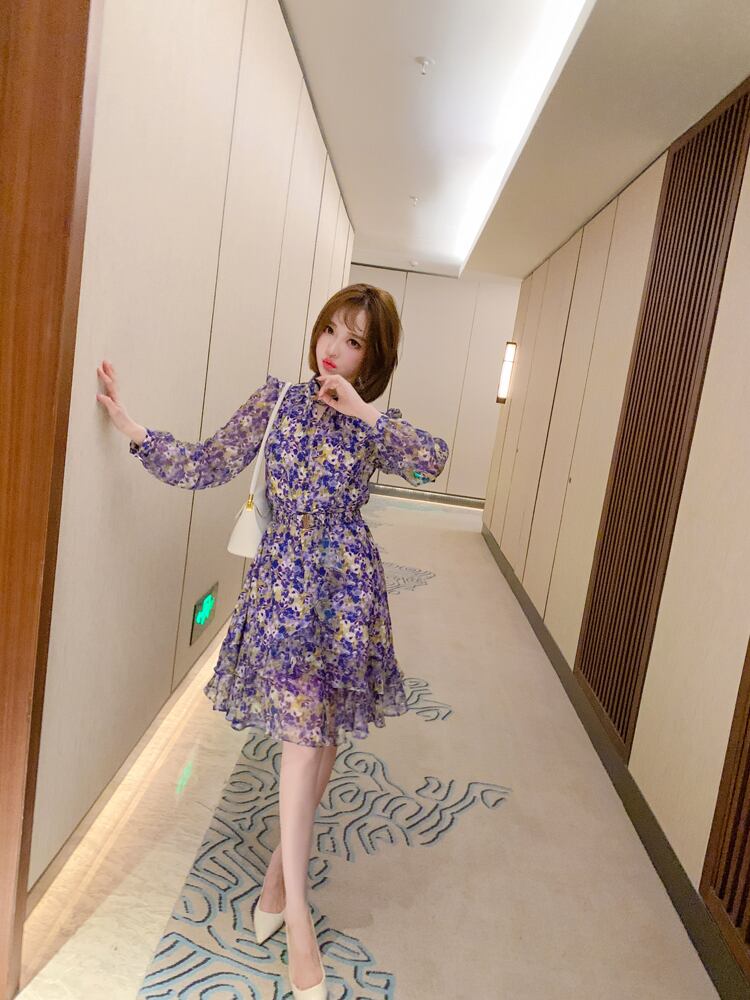 スタンドカラーカラーストレッチウェストプリントラッフルドレス スプリング エラスティック 伸縮 春物 MIUCO12770231067
