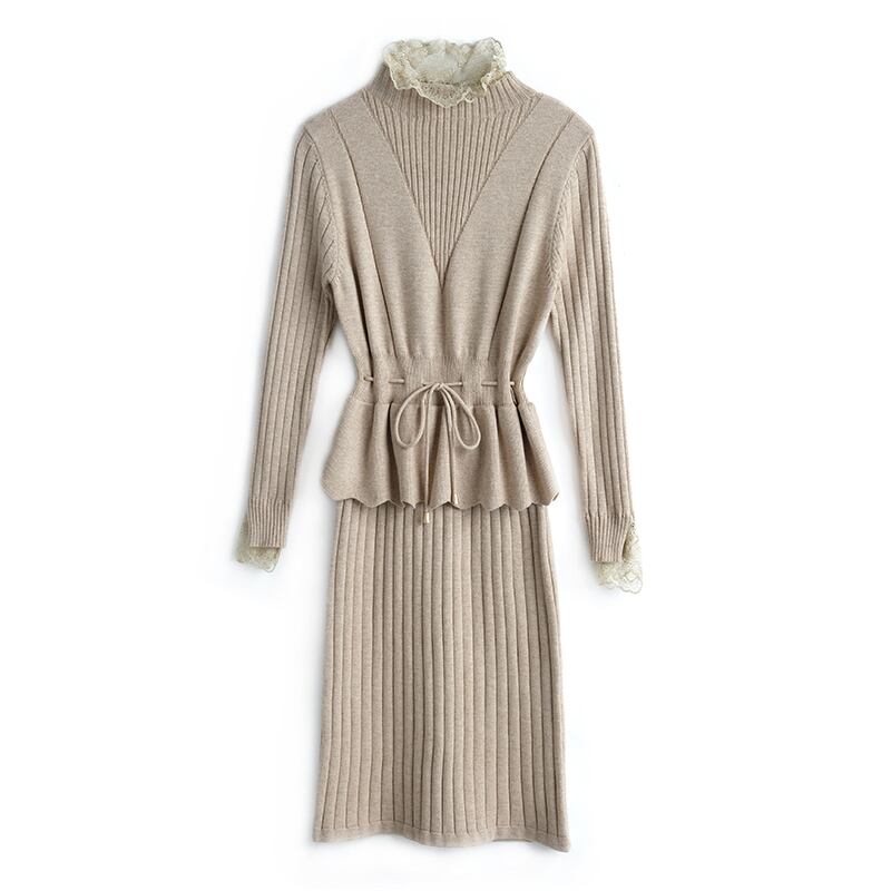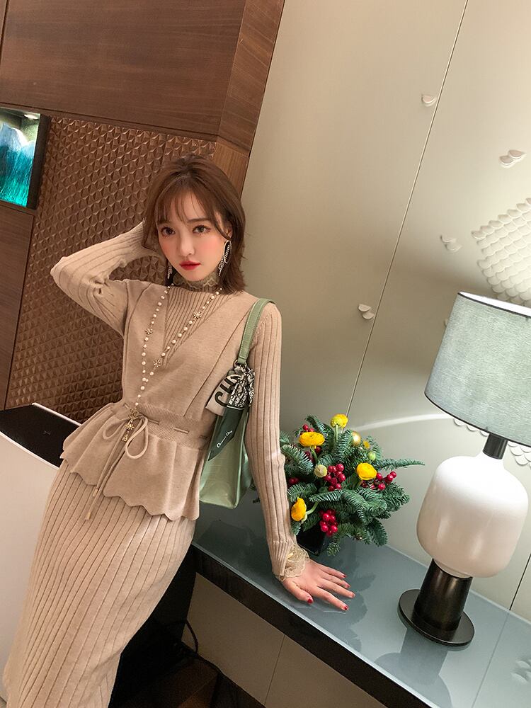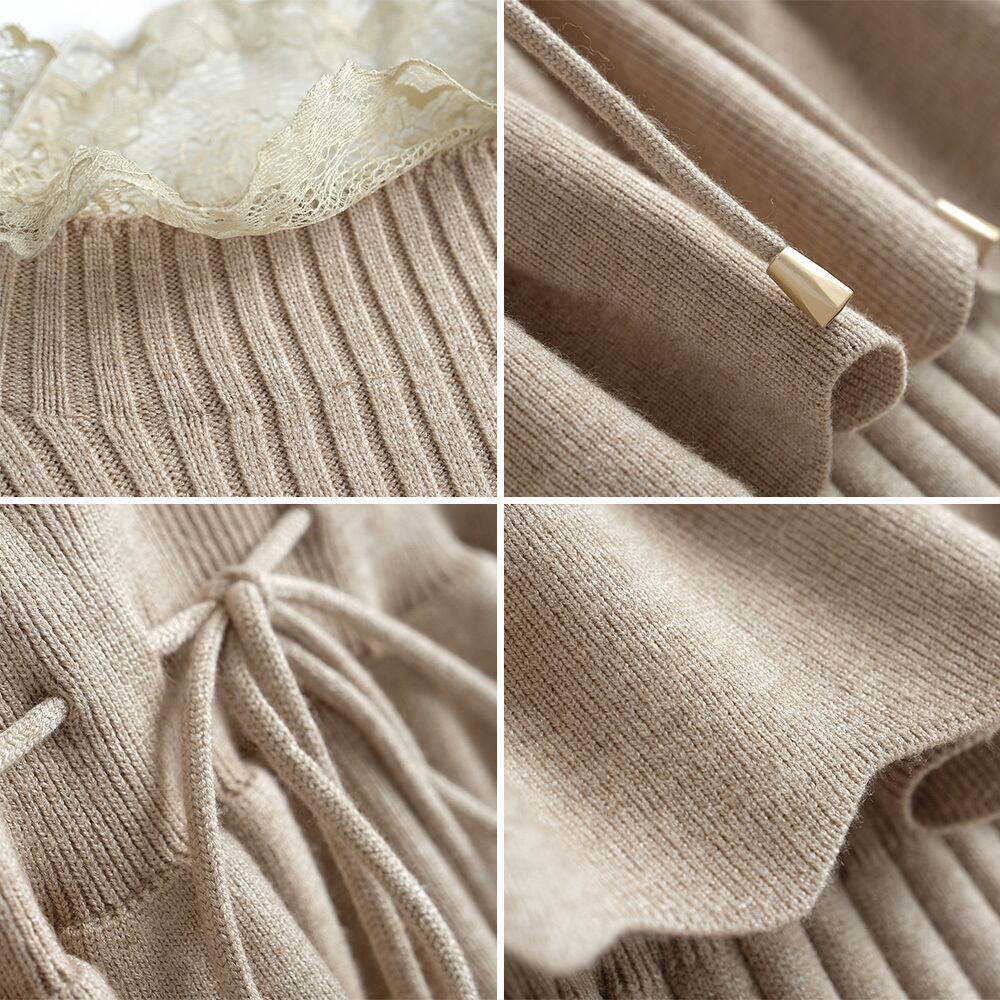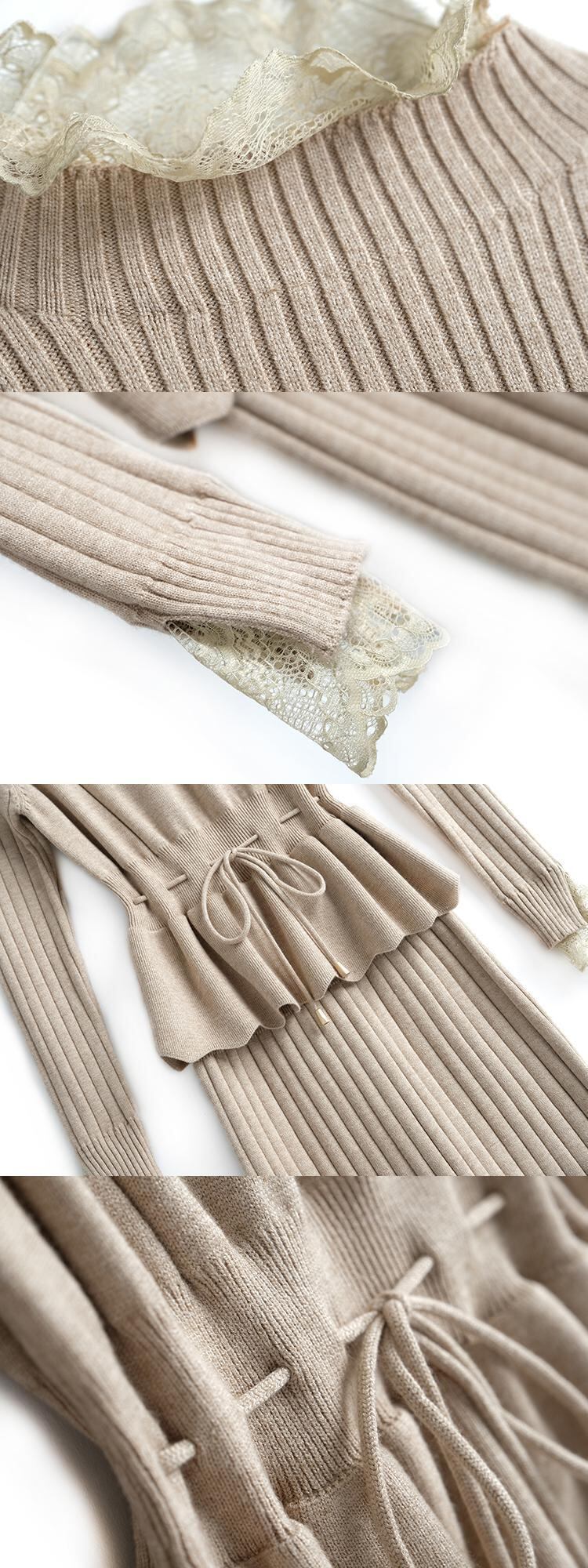 レースギャザースリムウェストニットドレス レディースオータム 秋物 ステッチ MIUCO77766533234