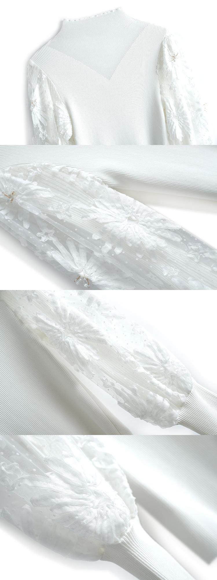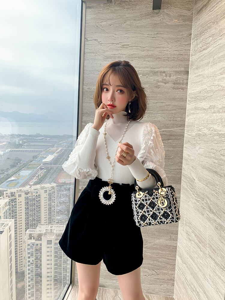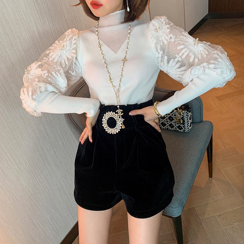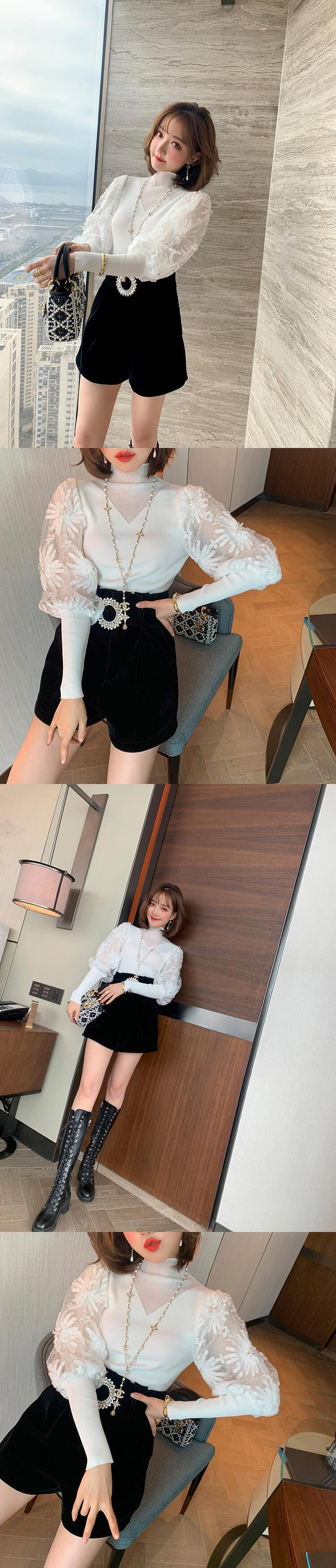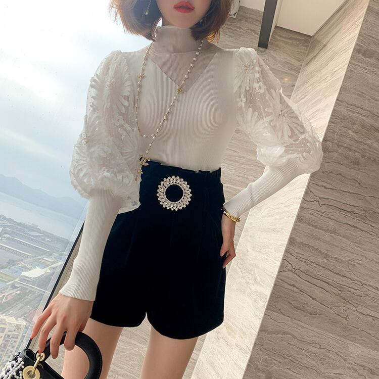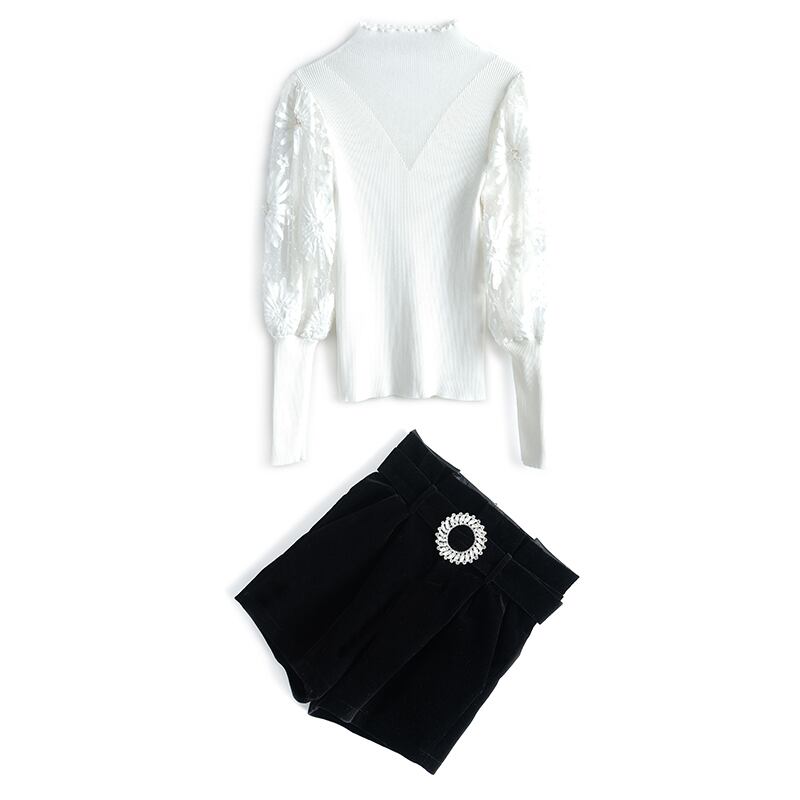 レーススリーブセーター Flowerデザイン ハイウェストウェストベルベットショーツ レディーススプリング 春物 ブルマー フラワーデザイン ステッチ MIUCO45152931179