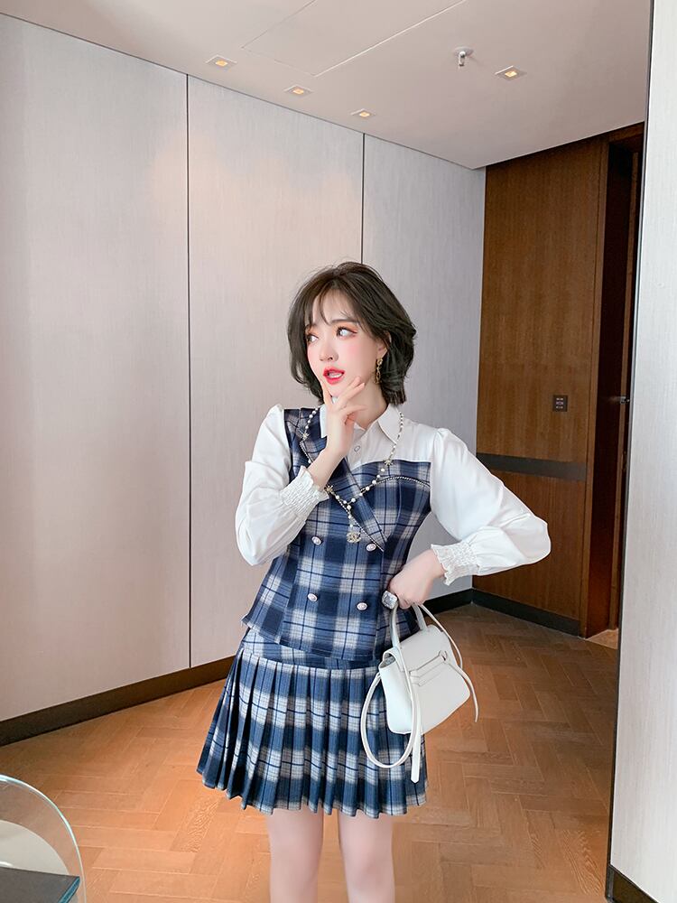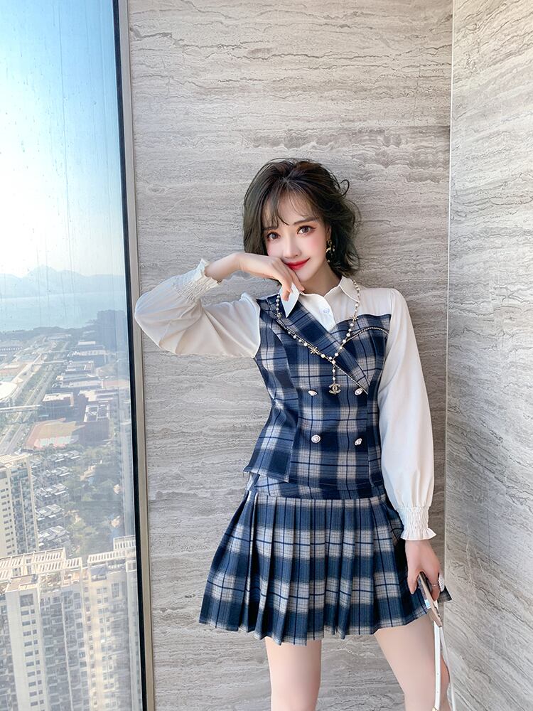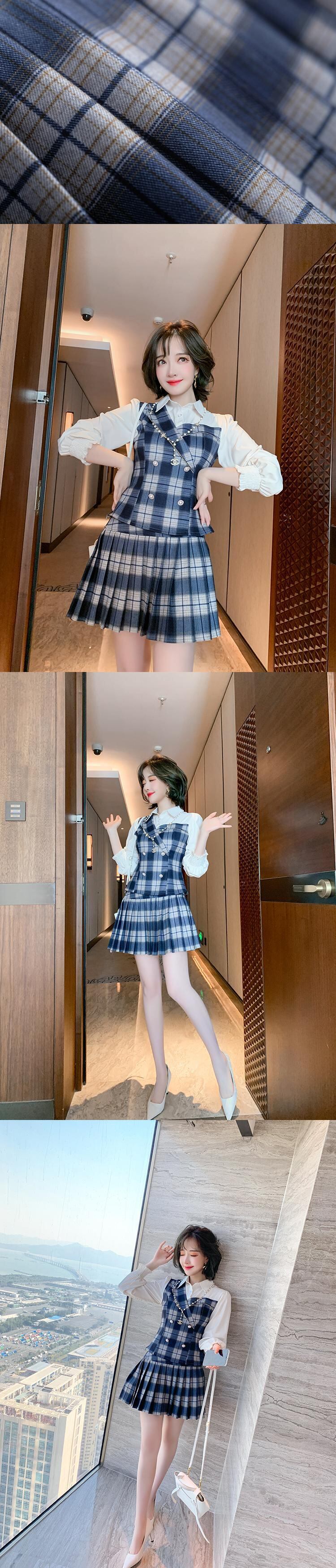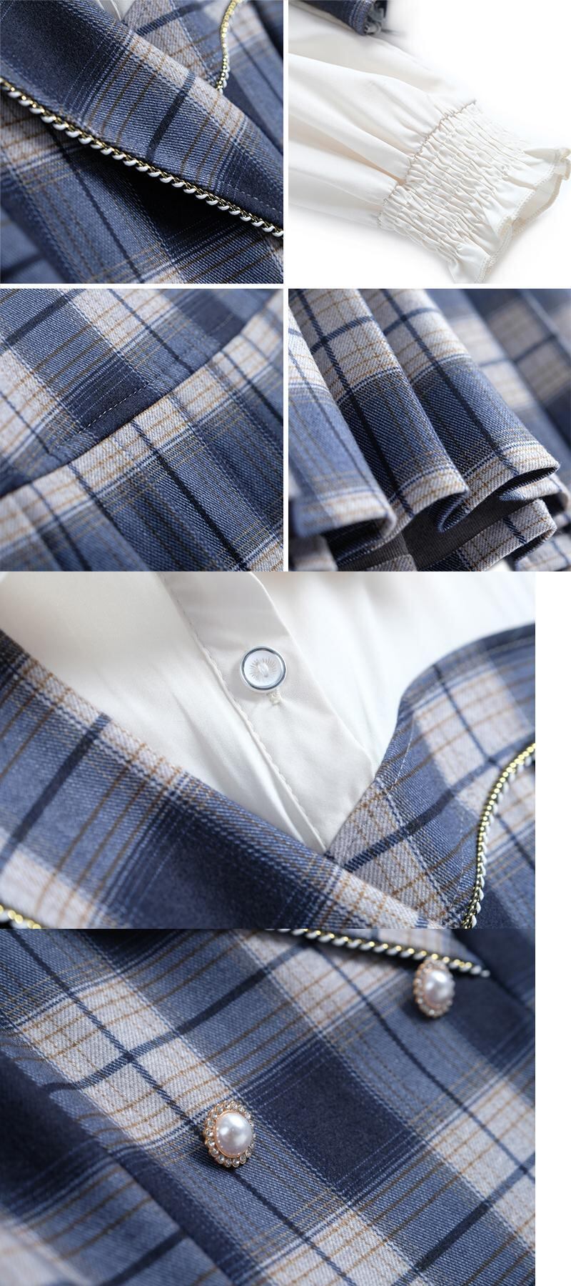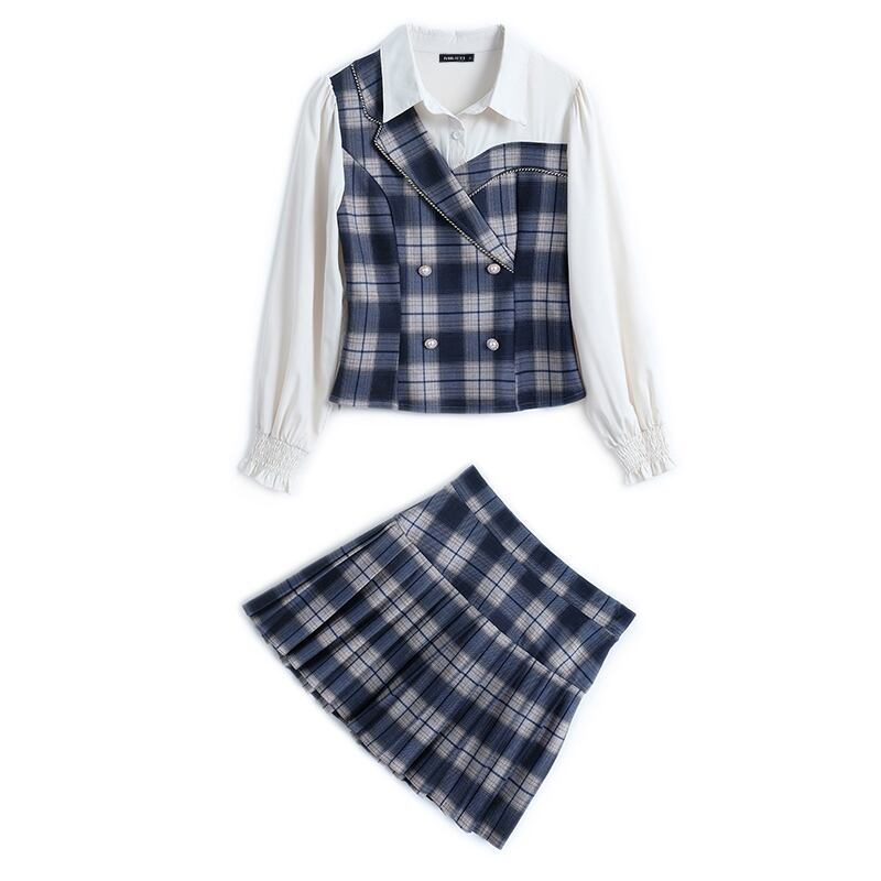 格子柄ダブルブレストシャツ ハイウェストプリーツスカート スプリング 春物 ステッチ MIUCO99518128544