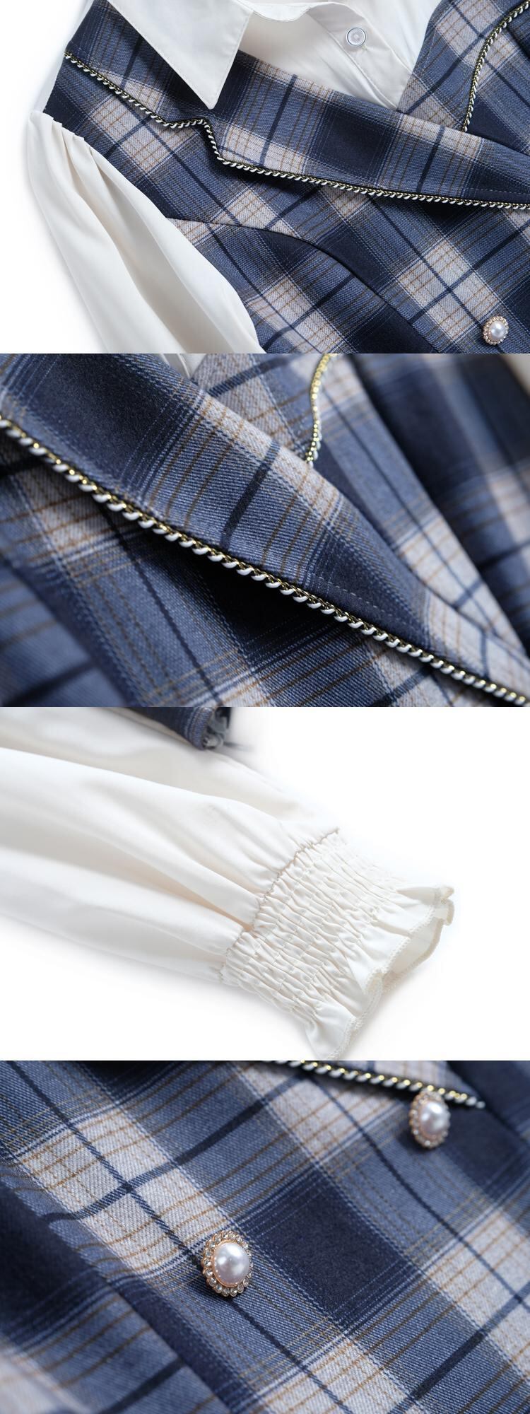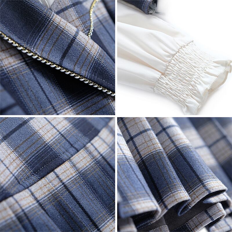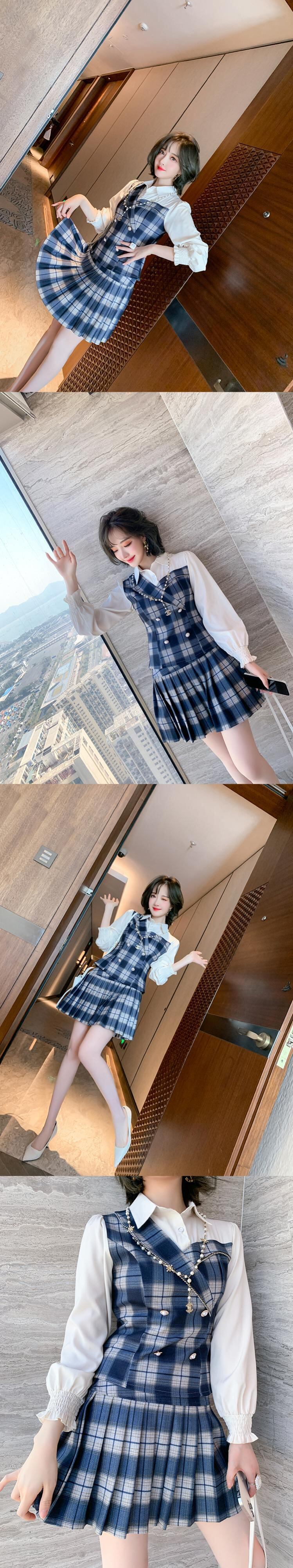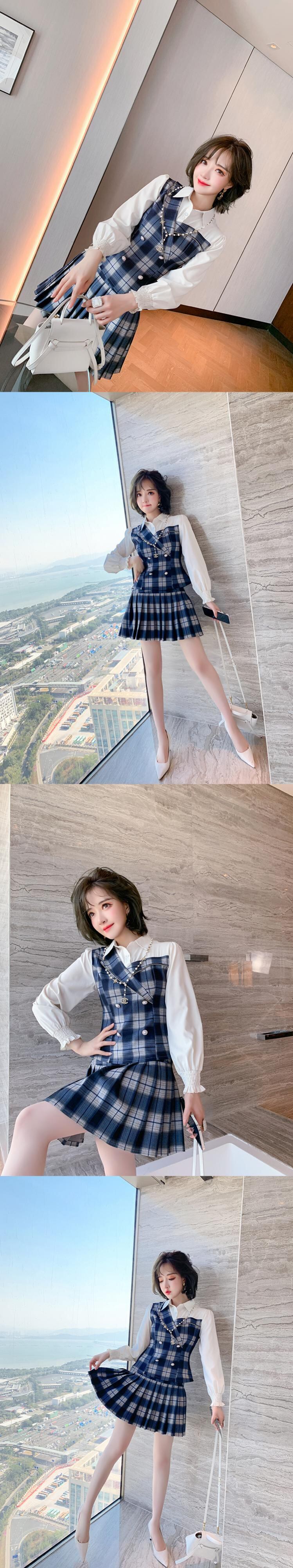 格子柄ダブルブレストシャツ ハイウェストプリーツスカート スプリング 春物 ステッチ MIUCO99518128544