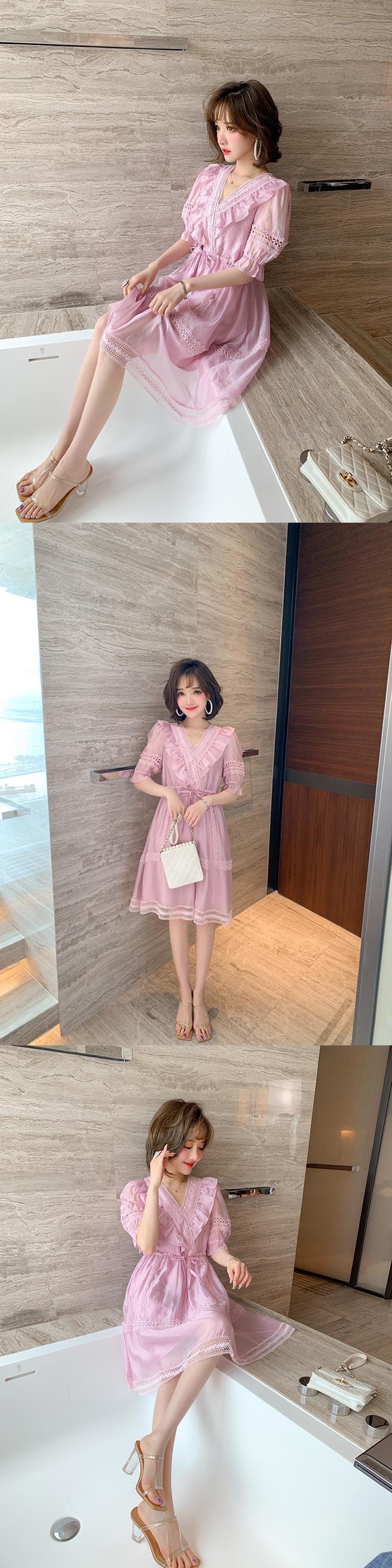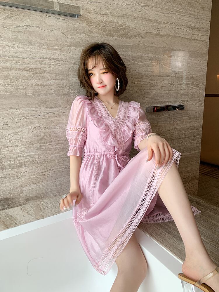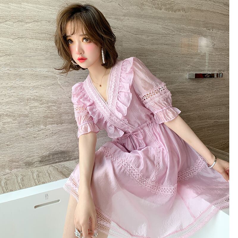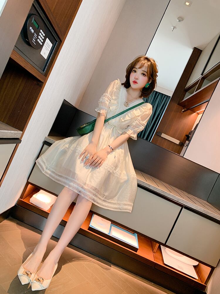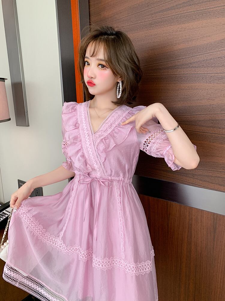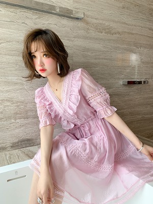 スカート レースVネックウェストドレス サマースタイル 夏物 MIUCO34025418079