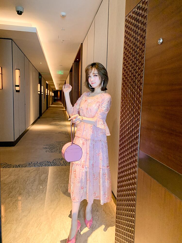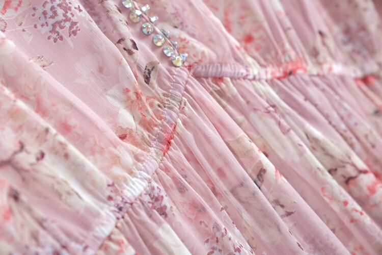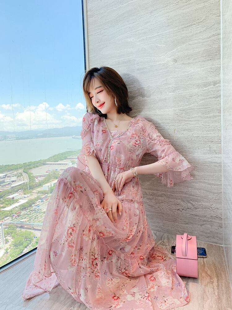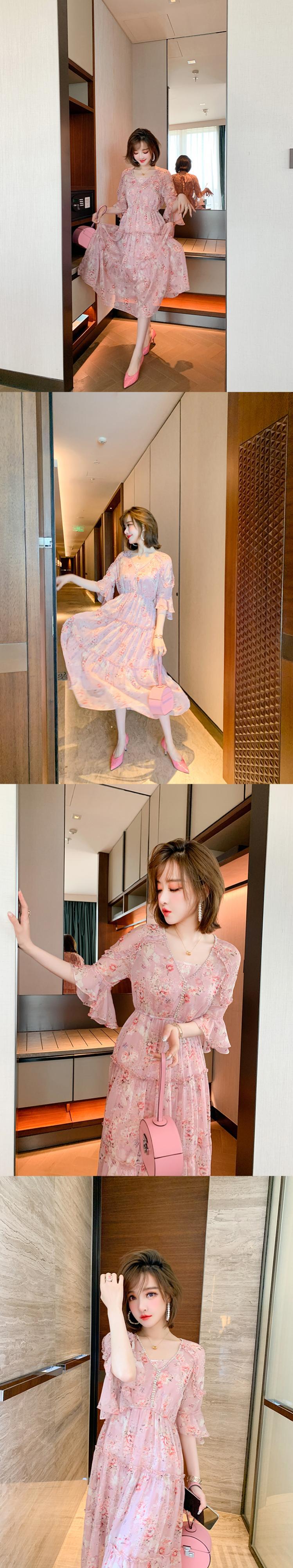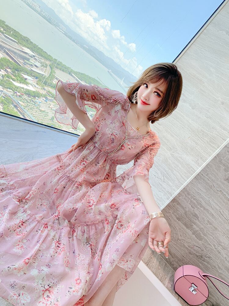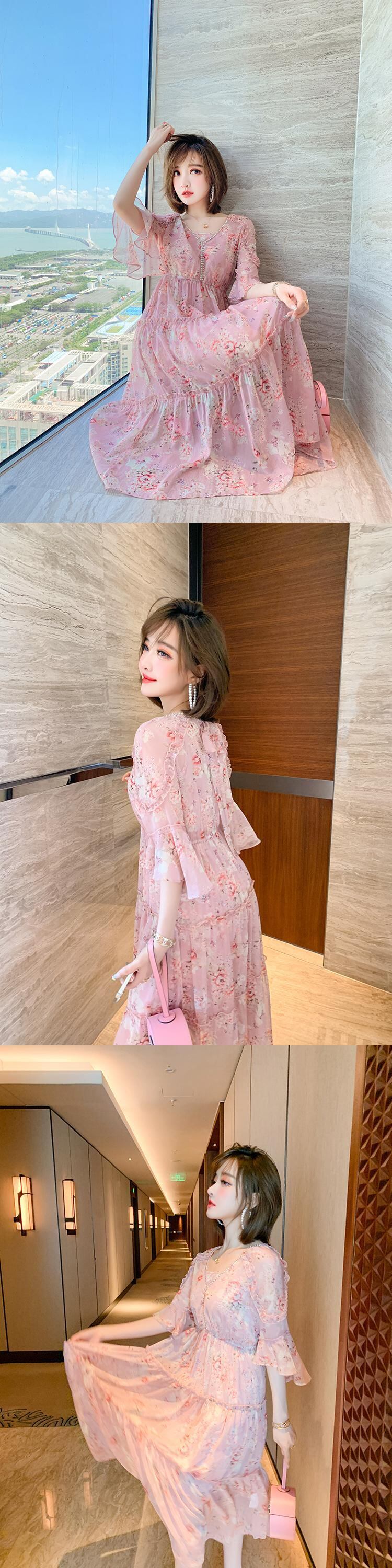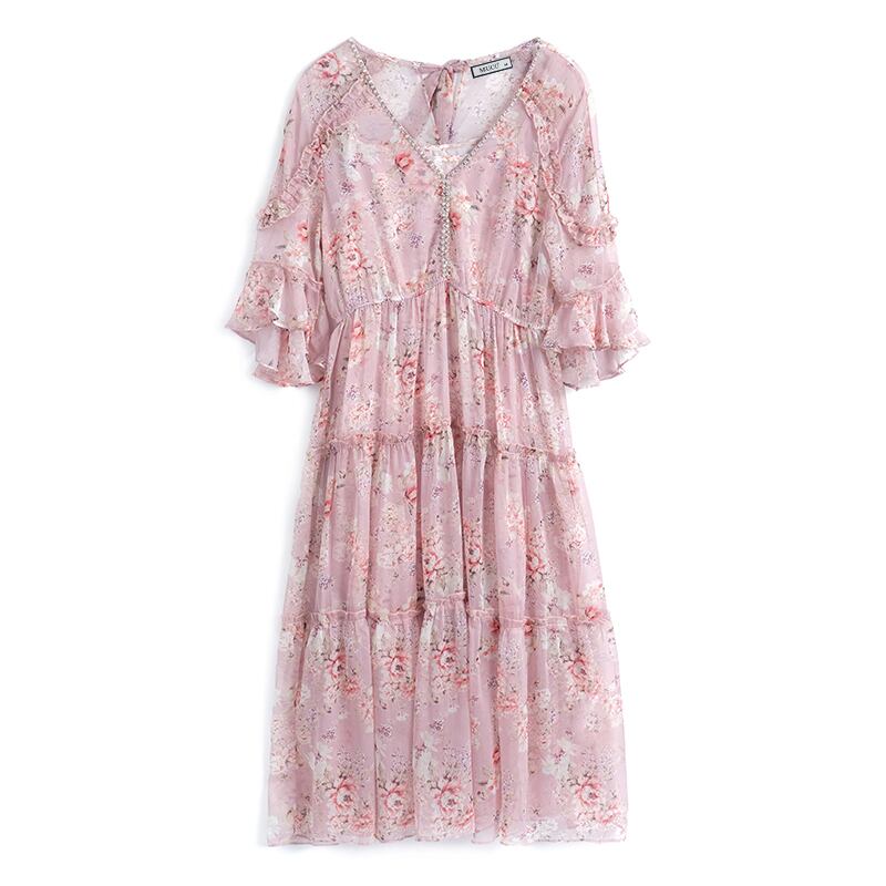 Vネックウェストプリントドレス サマー 夏物 MIUCO55326119476
