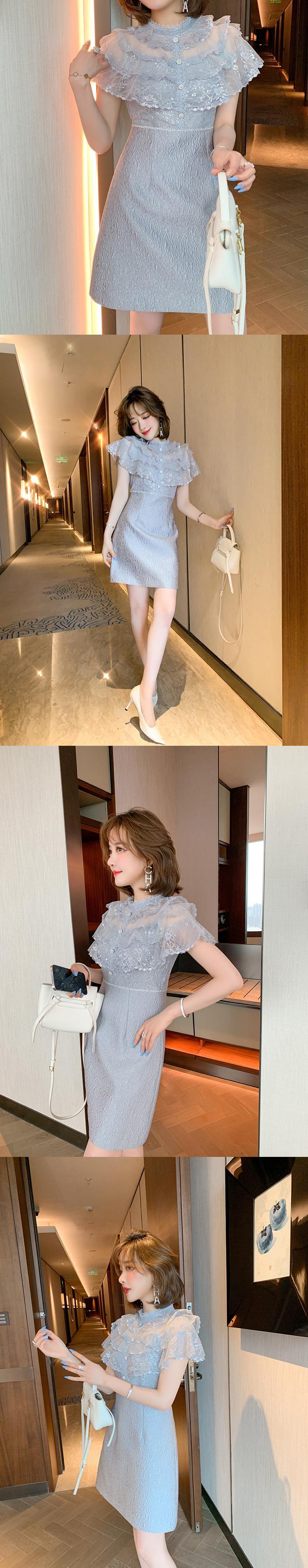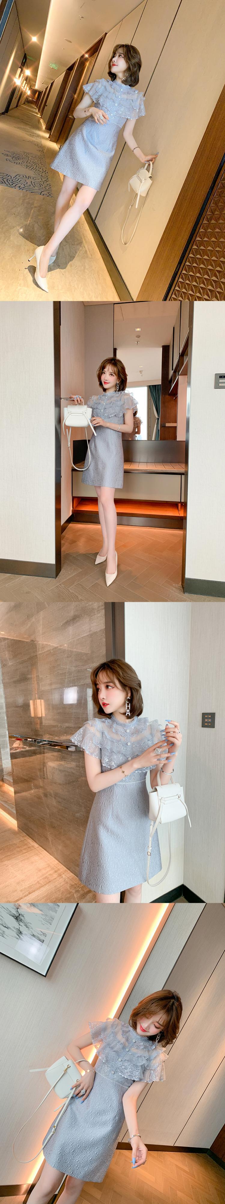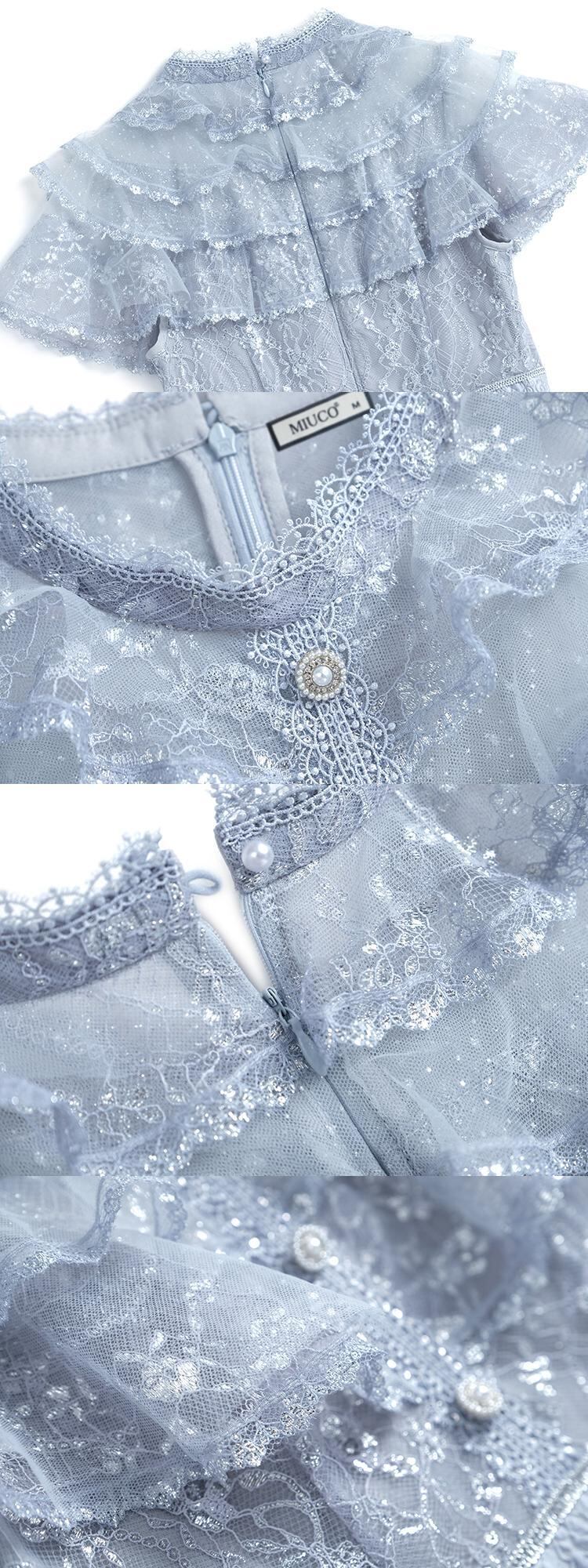 カラーメッシュウェスト薄手Aラインプリーツジャカードドレス MIUCO99841716567