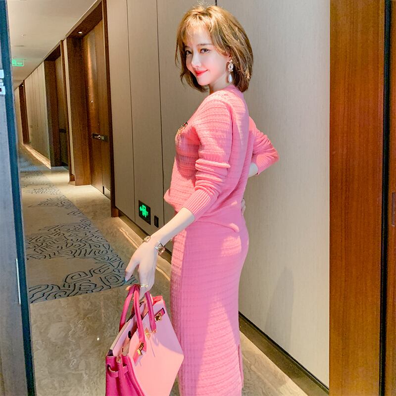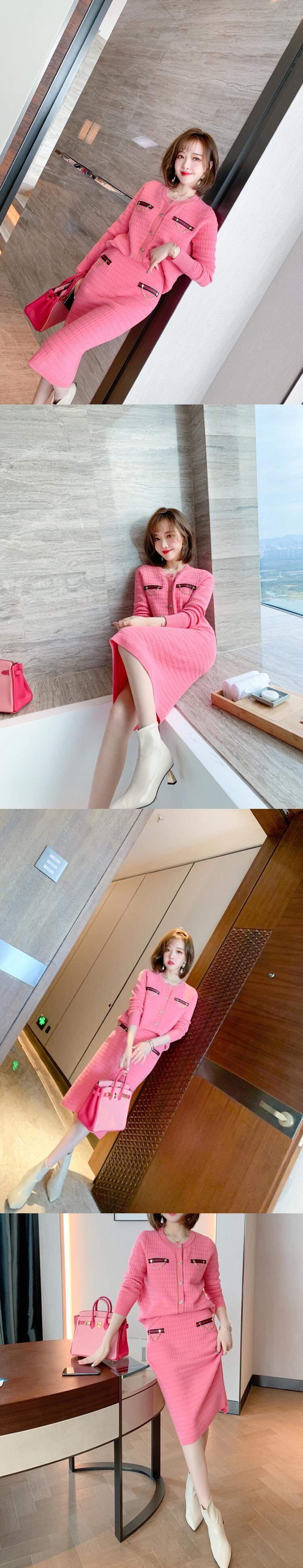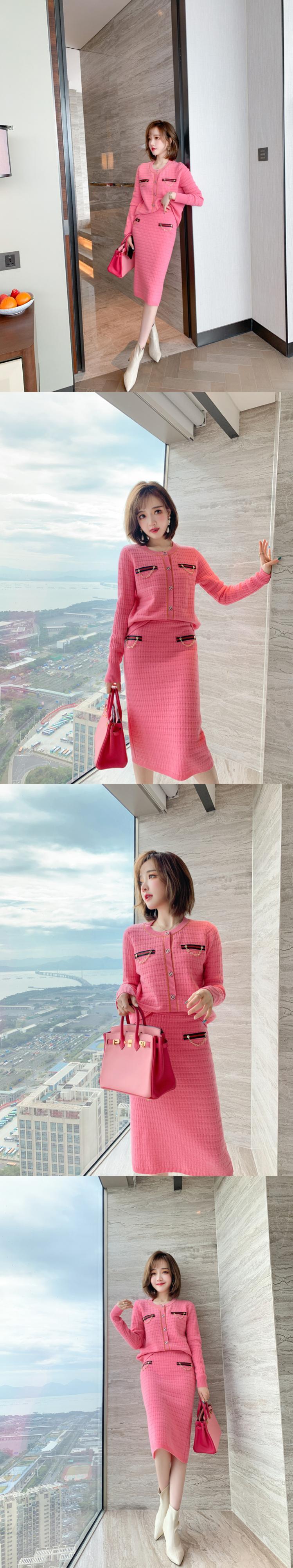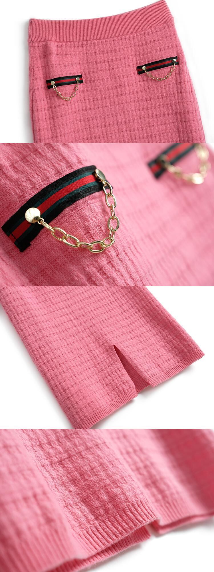 パターンカラーストライプニットカーディガンハイウェストウェストスカート ウィンタースタイル レッド 冬物 MIUCO90649672950