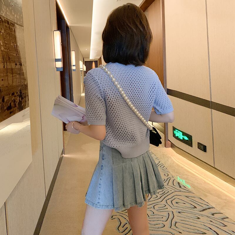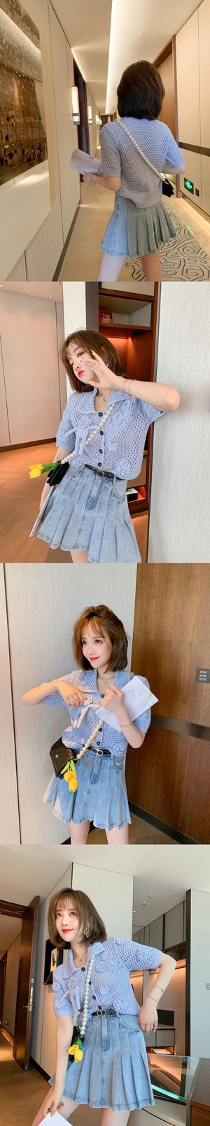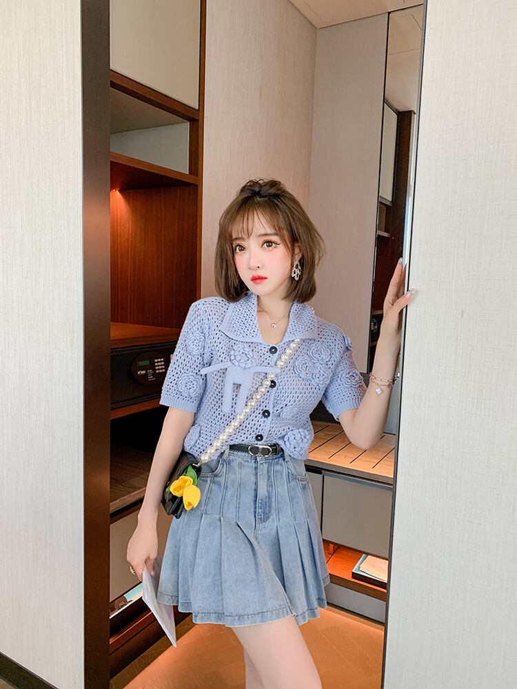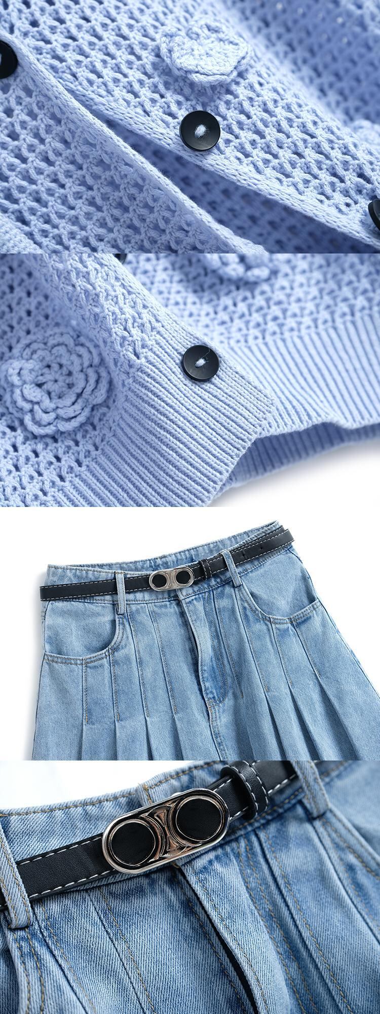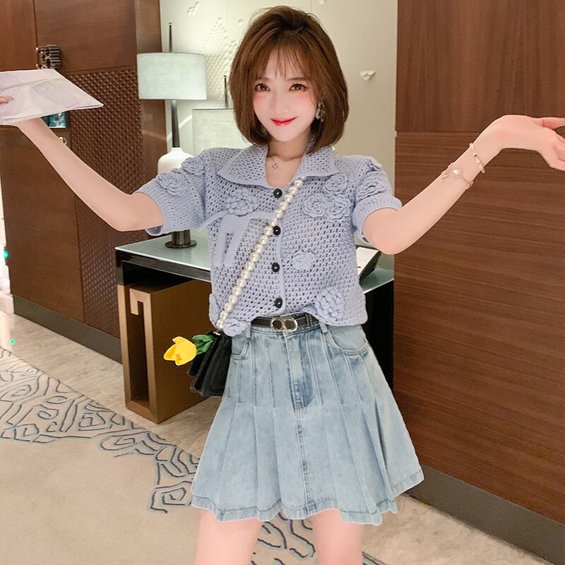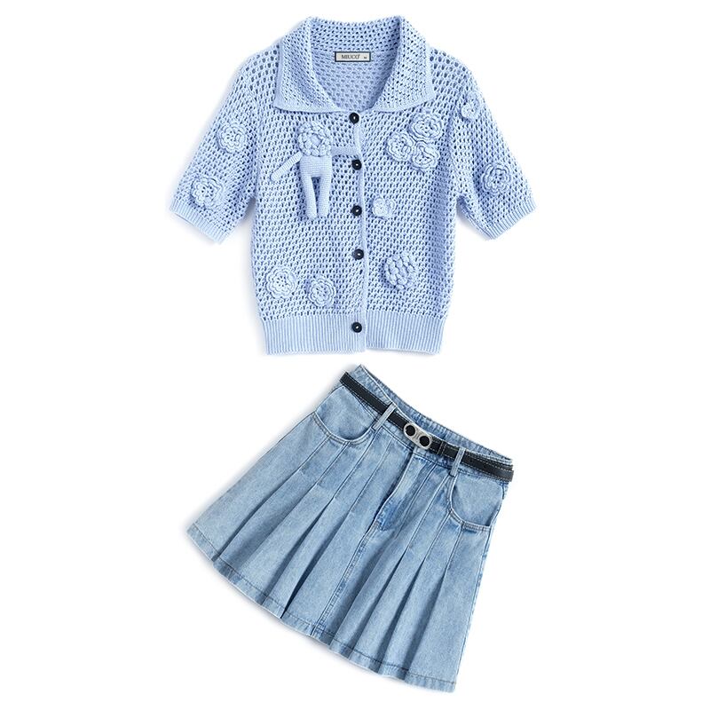 チェーン Flowerデザイン ニットカーディガンハイウェストウェストプリーツスカート オータム 秋物 フラワーデザイン MIUCO33485655561