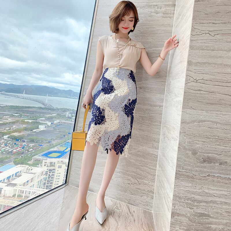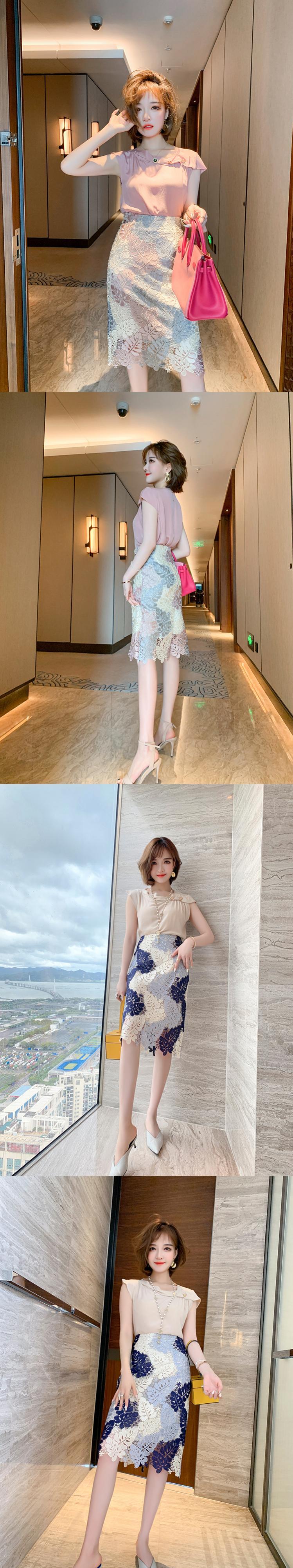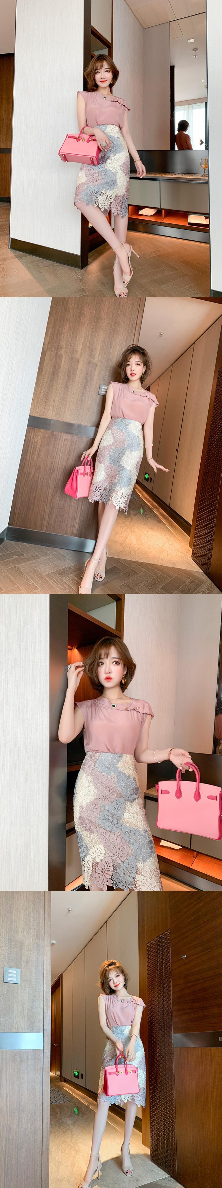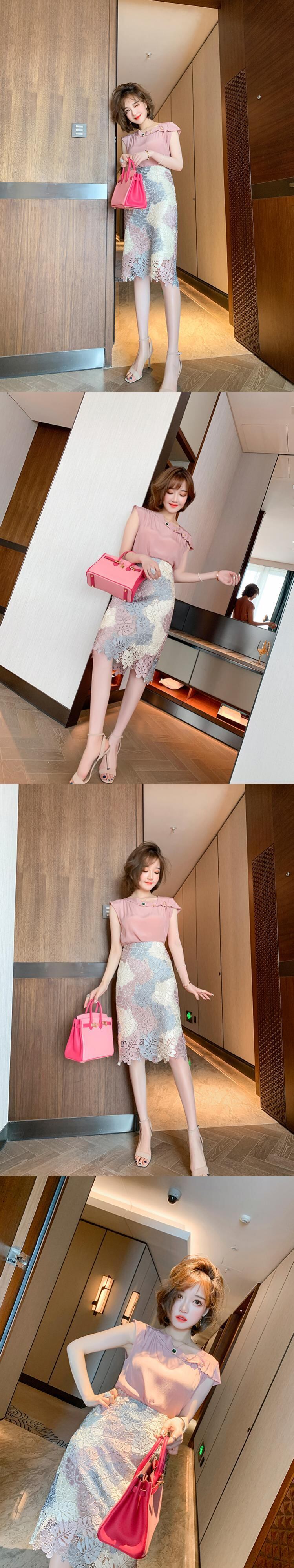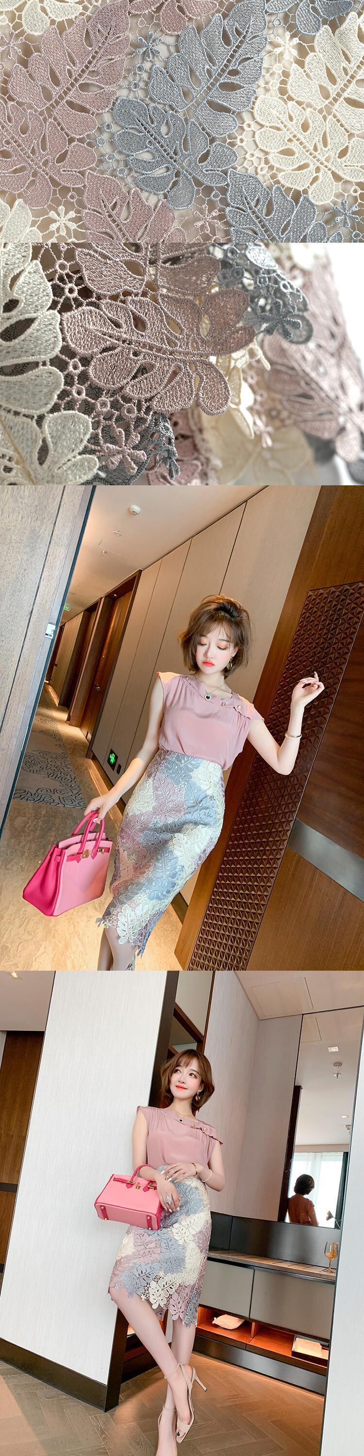 ボタンスリーブトップス レーススカート サマー レッド 刺繍 夏物 MIUCO8123460817