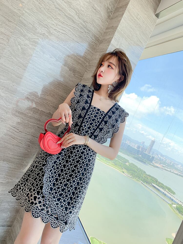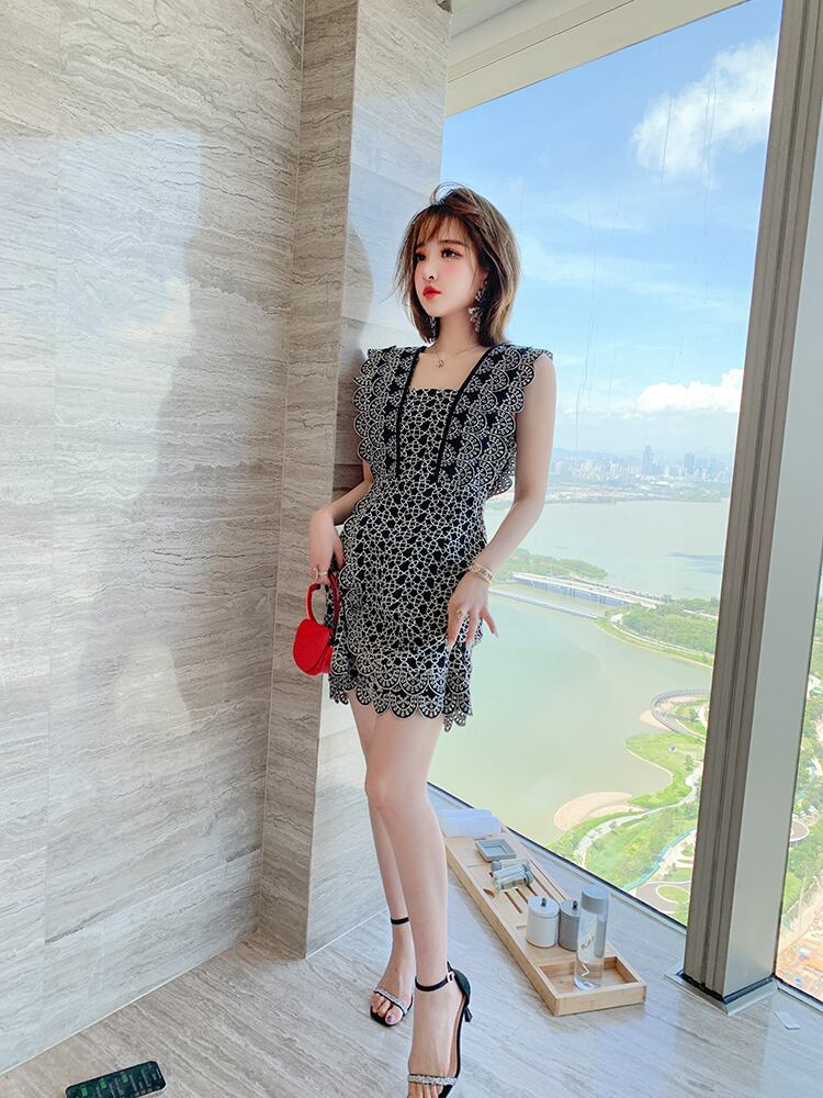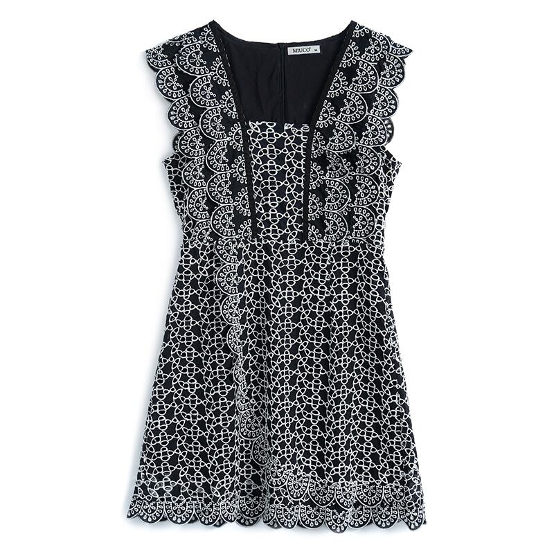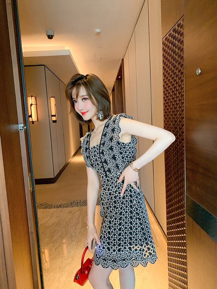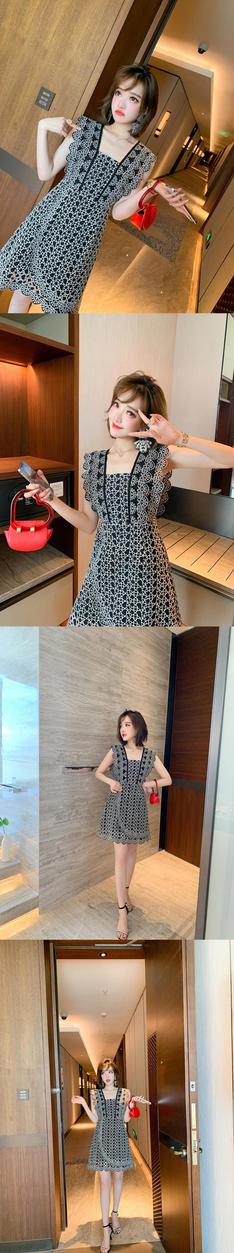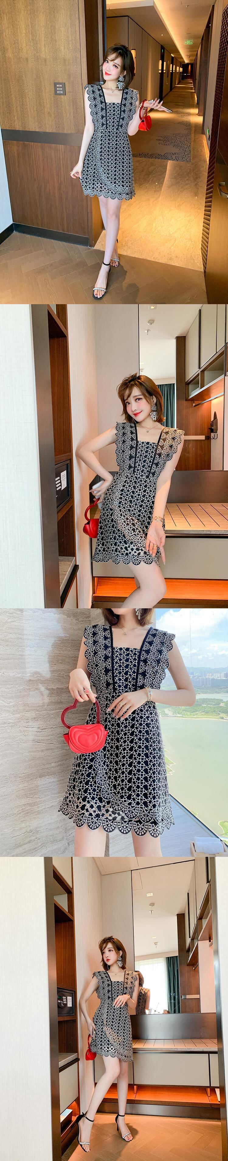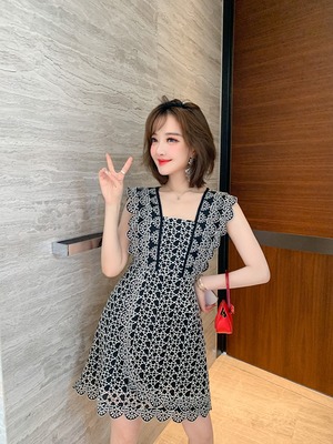 カラーレースパターンスリーブウェストドレス オータム 秋物 スクウェア MIUCO30357093837