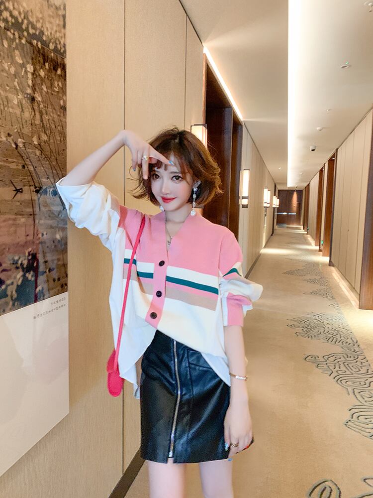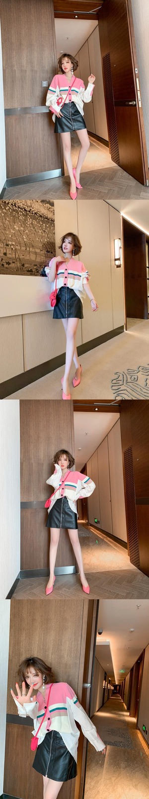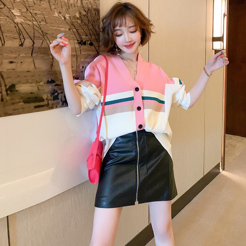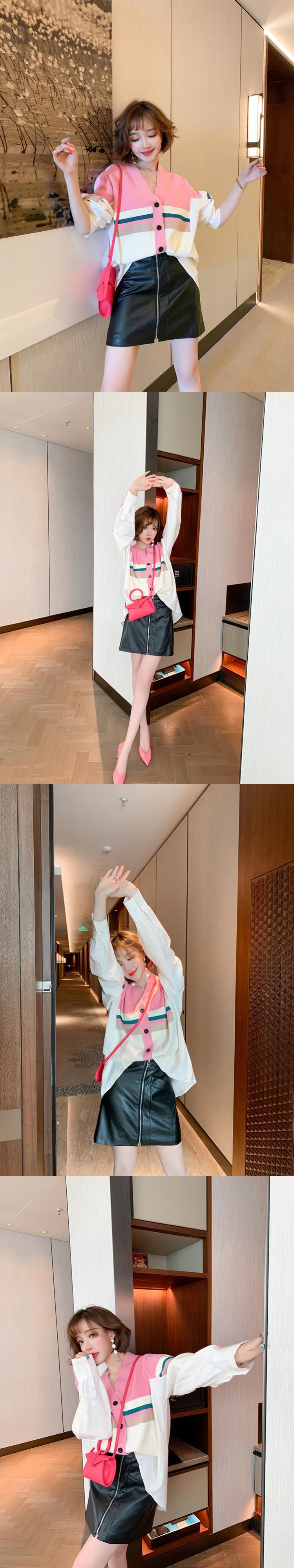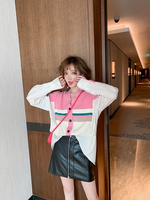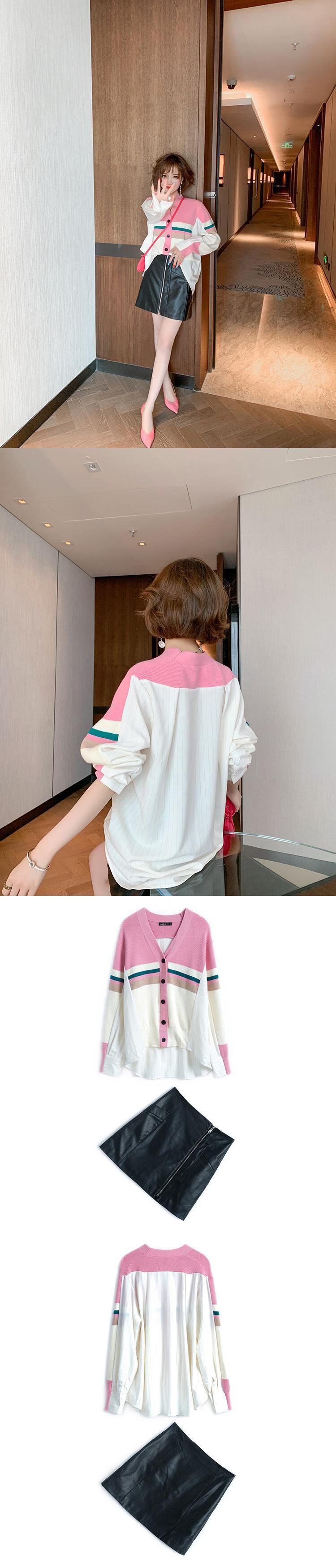 ニットストライプシャツ ルーズジャケット ジッパーAラインレザースカート スプリング 春物 ステッチ MIUCO56052894155