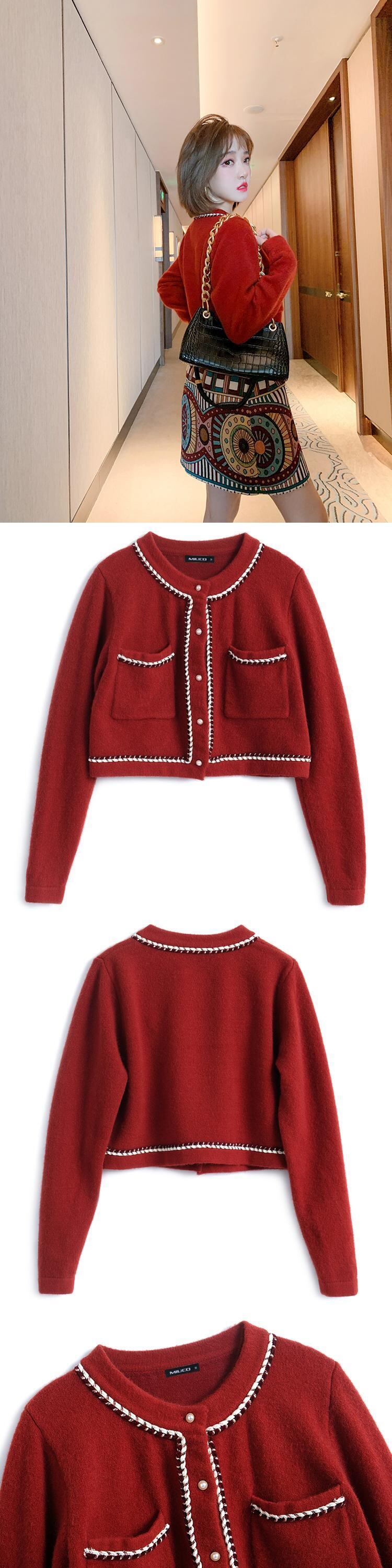 ラウンドネックレースポケットスリム薄手ニットカーディガンスプリング 春物 Oネック MIUCO9294128102
