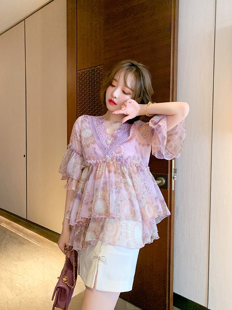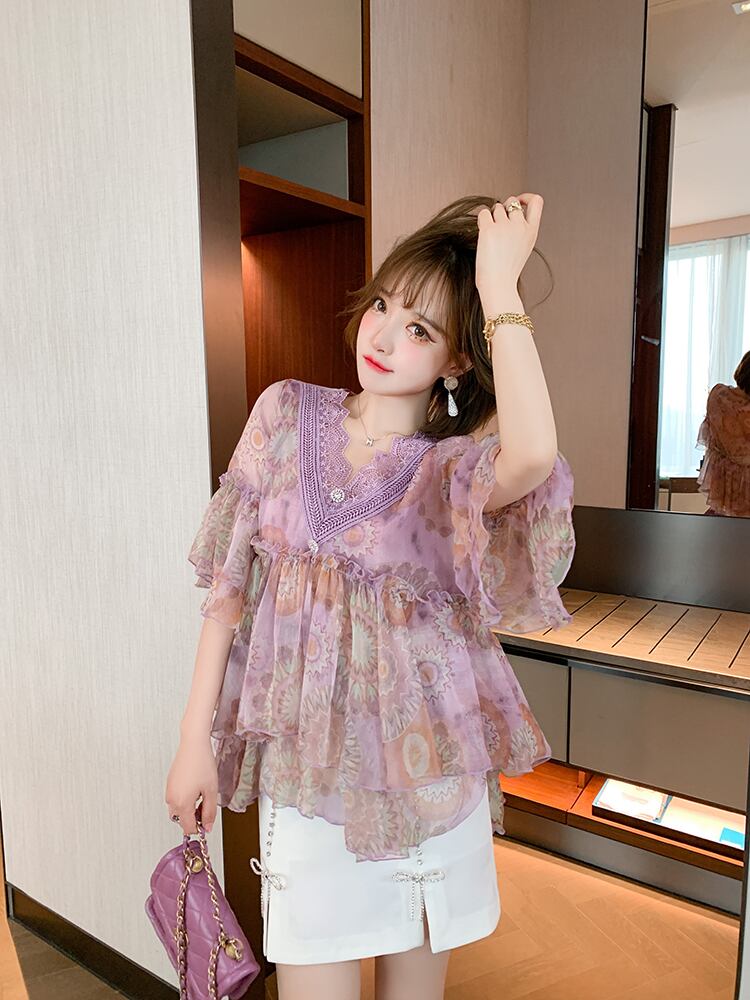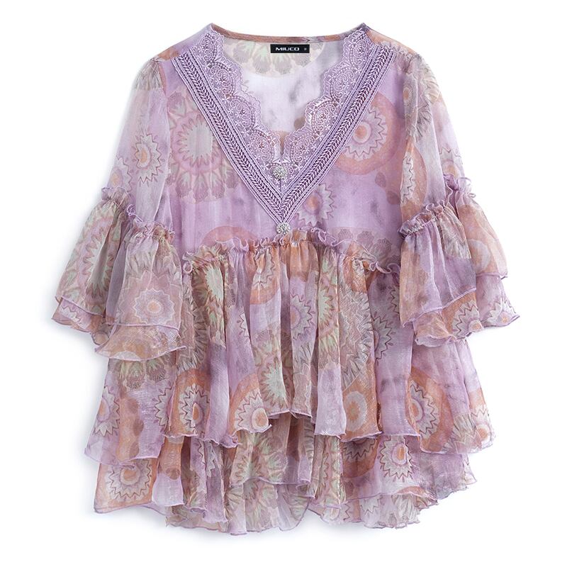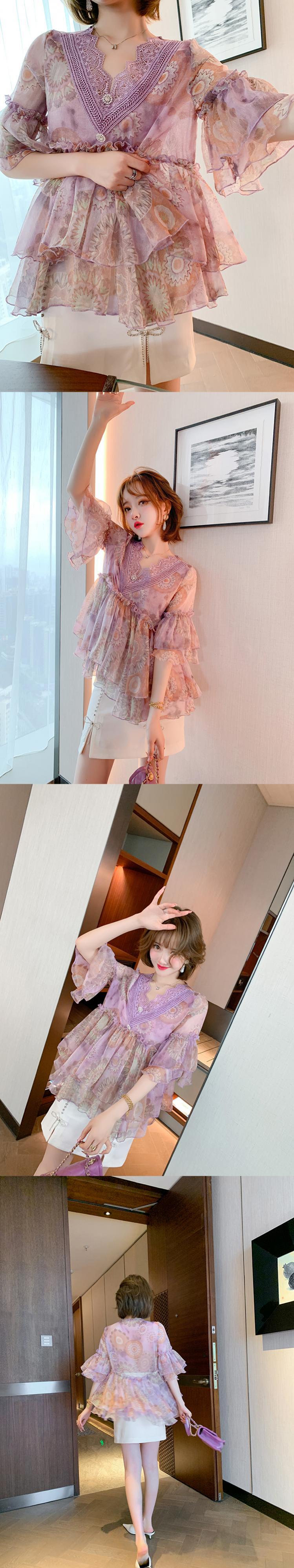 レースVネックプリントシャツ トップス サマー 夏物 MIUCO27766542760