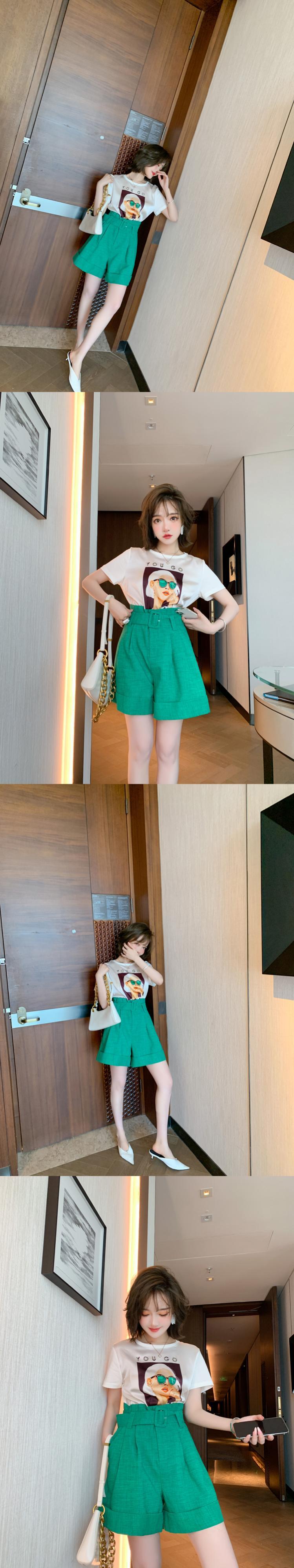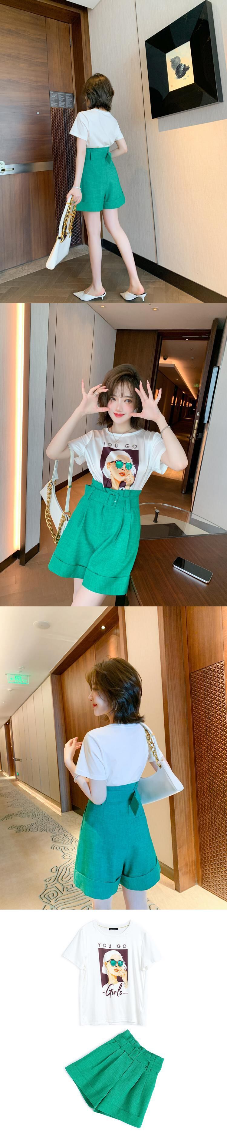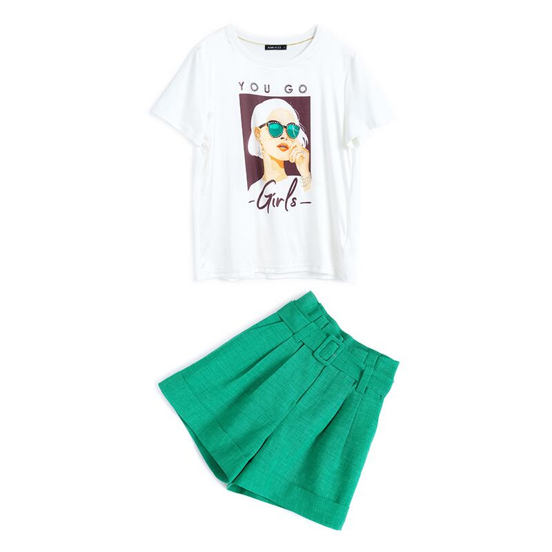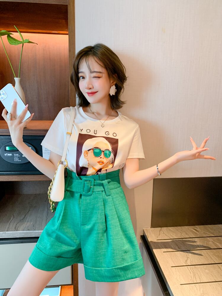 プリントラウンドネックTシャツ ハイウェストAラインショーツ サマースタイル 夏物 ブルマー Oネック MIUCO93012387220